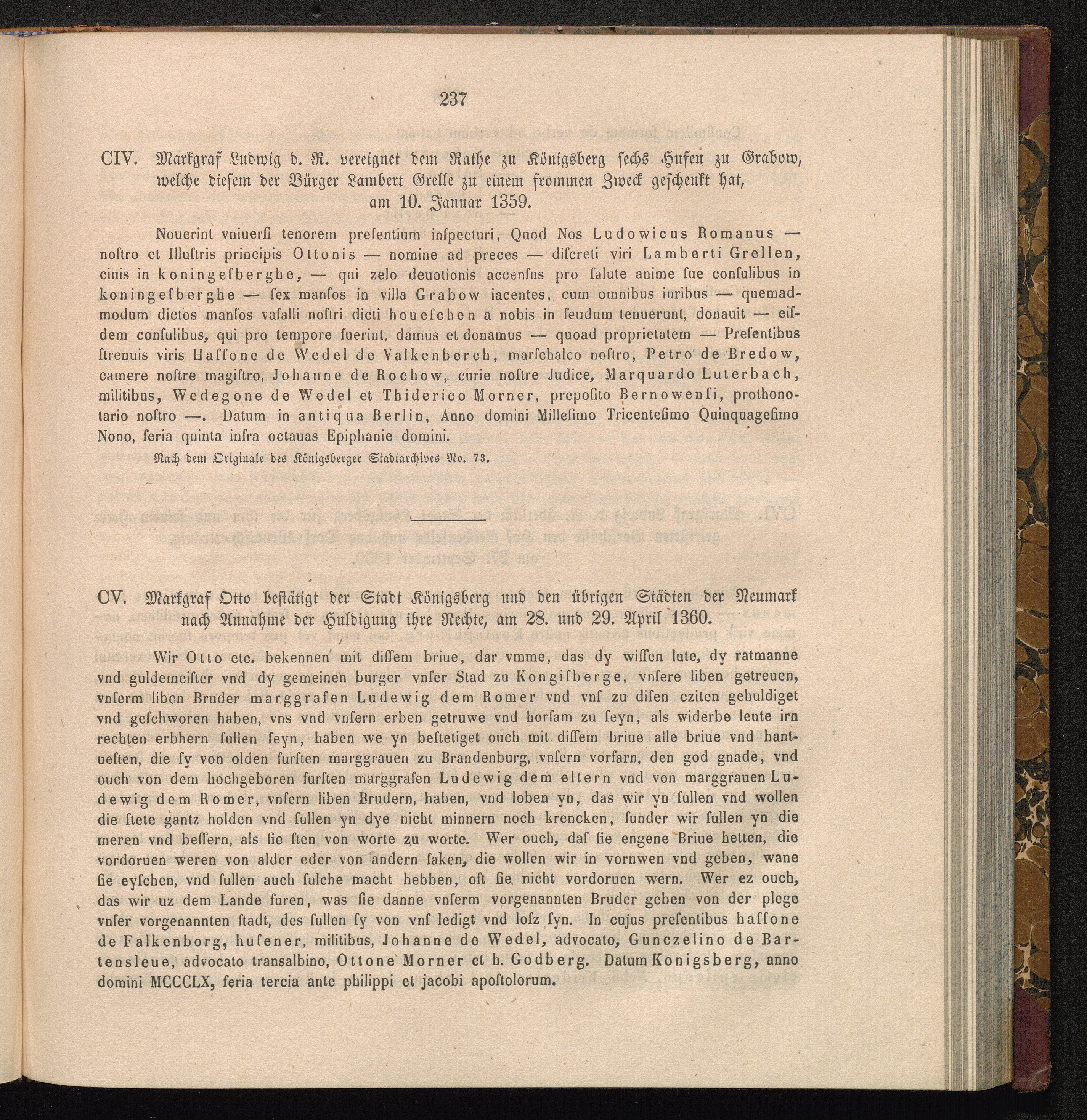CIV. Markgraf Ludwig d. R. vereignet dem Rathe zu Königsberg sechs Hufen zu Grabow,[...]