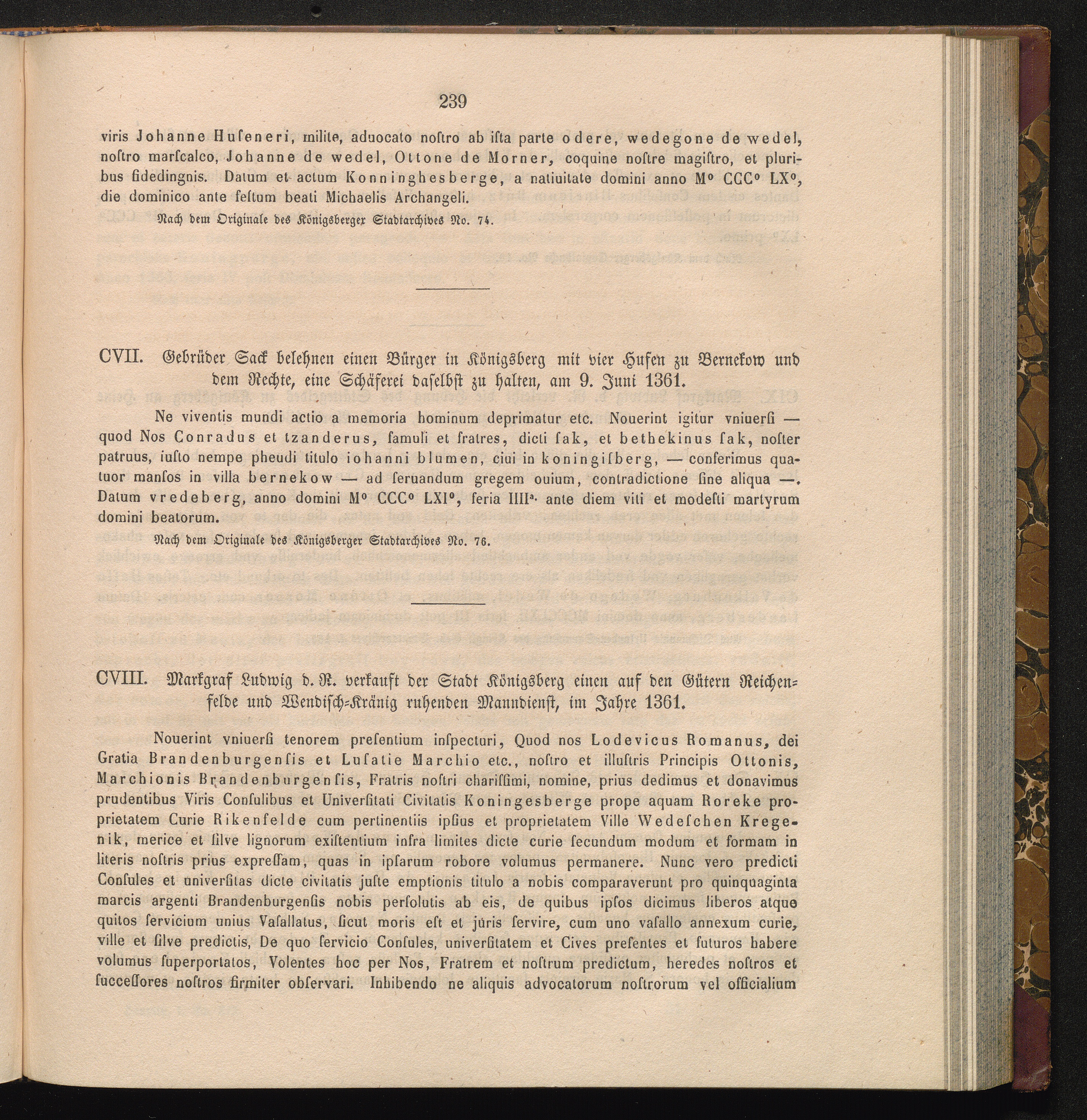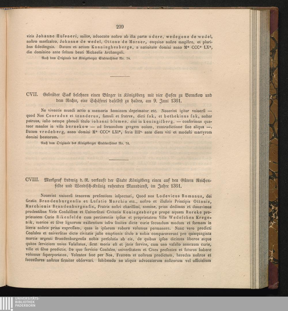 CVII. Gebrüder Sack belehnen einen Bürger in Königsberg mit vier Hufen zu Bernekow[...]