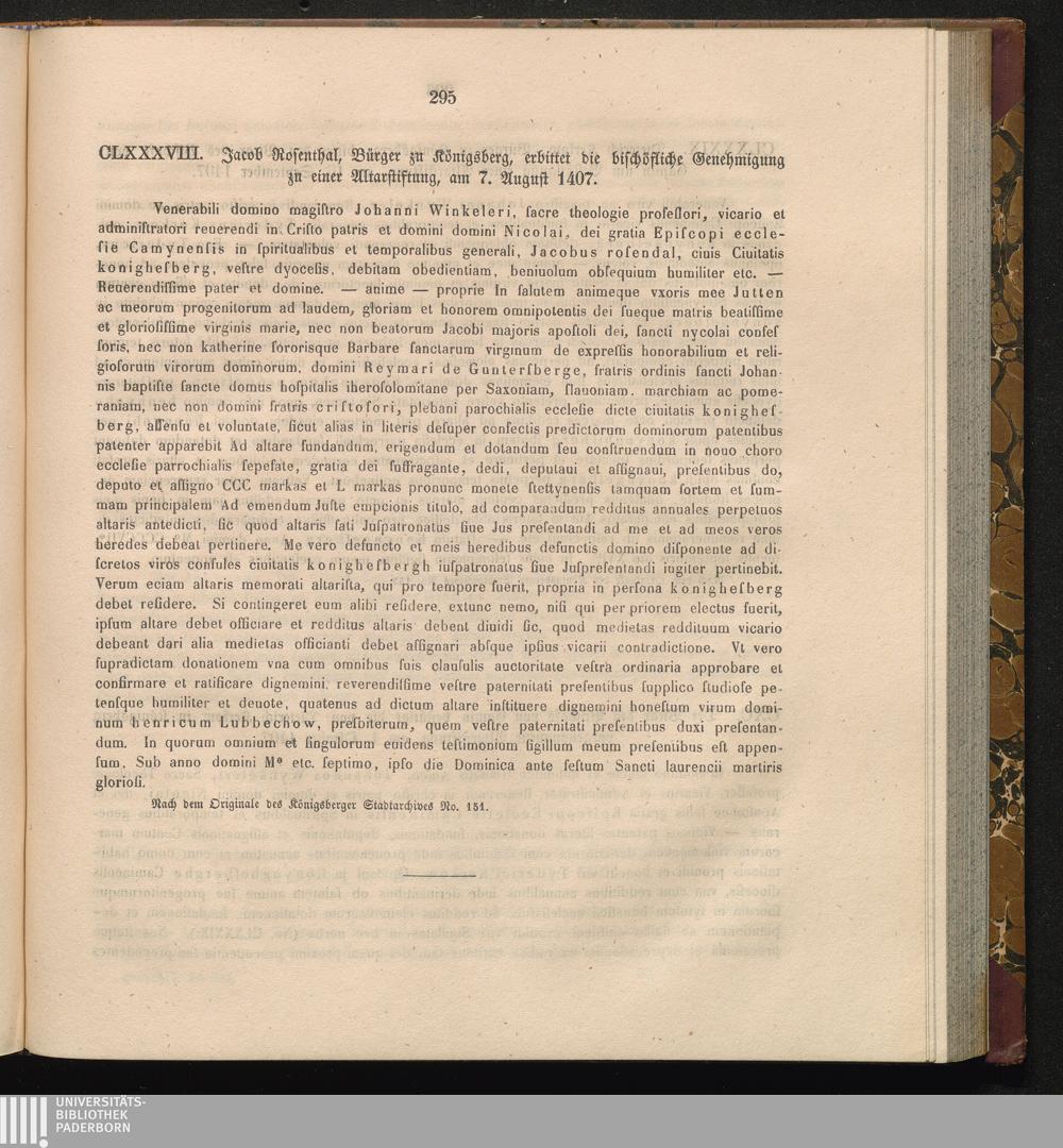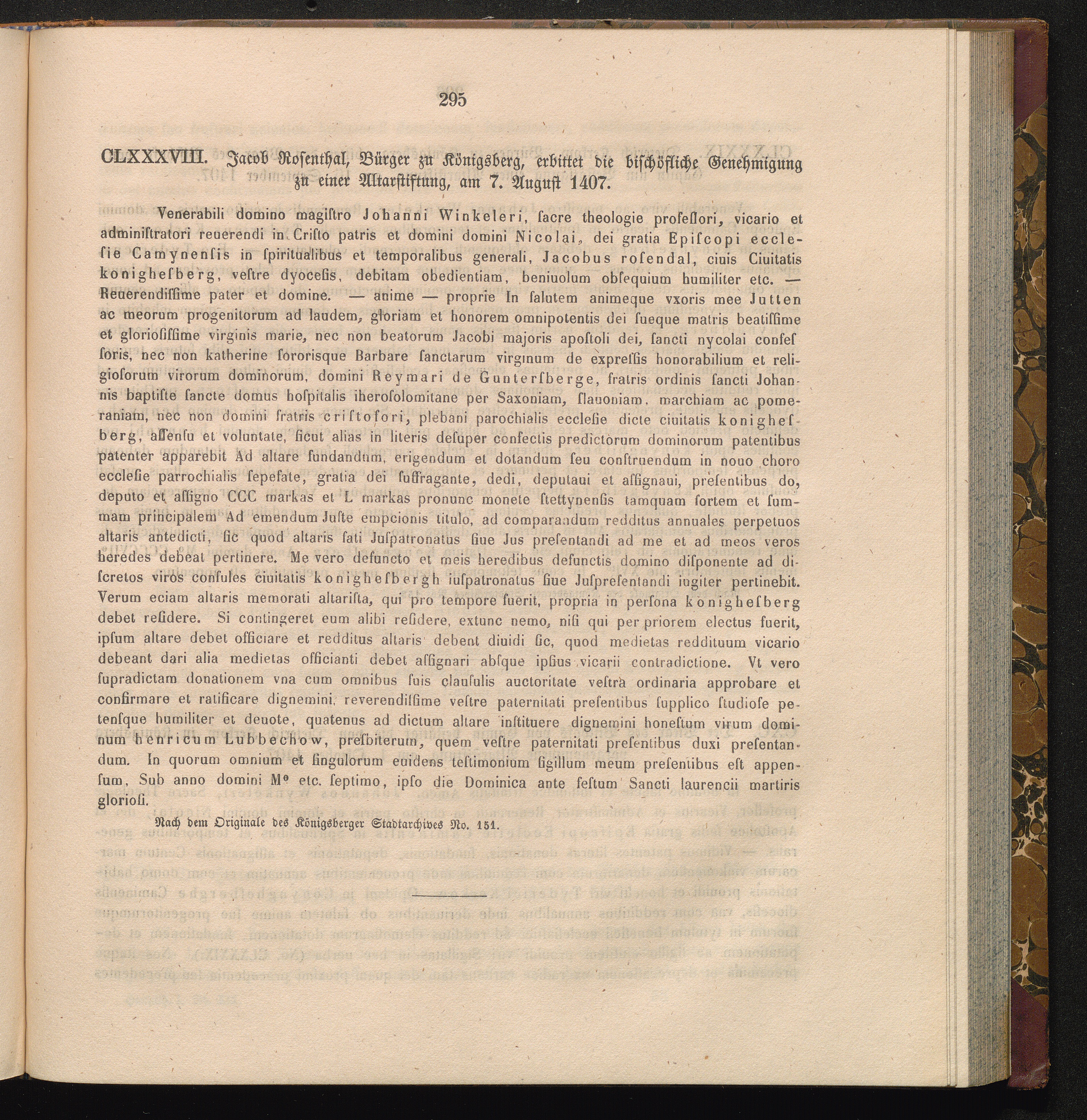 CLXXXVIII. Jacob Rosenthal, Bürger zu Königsberg, erbittet die bischöfliche Genehmigung[...]