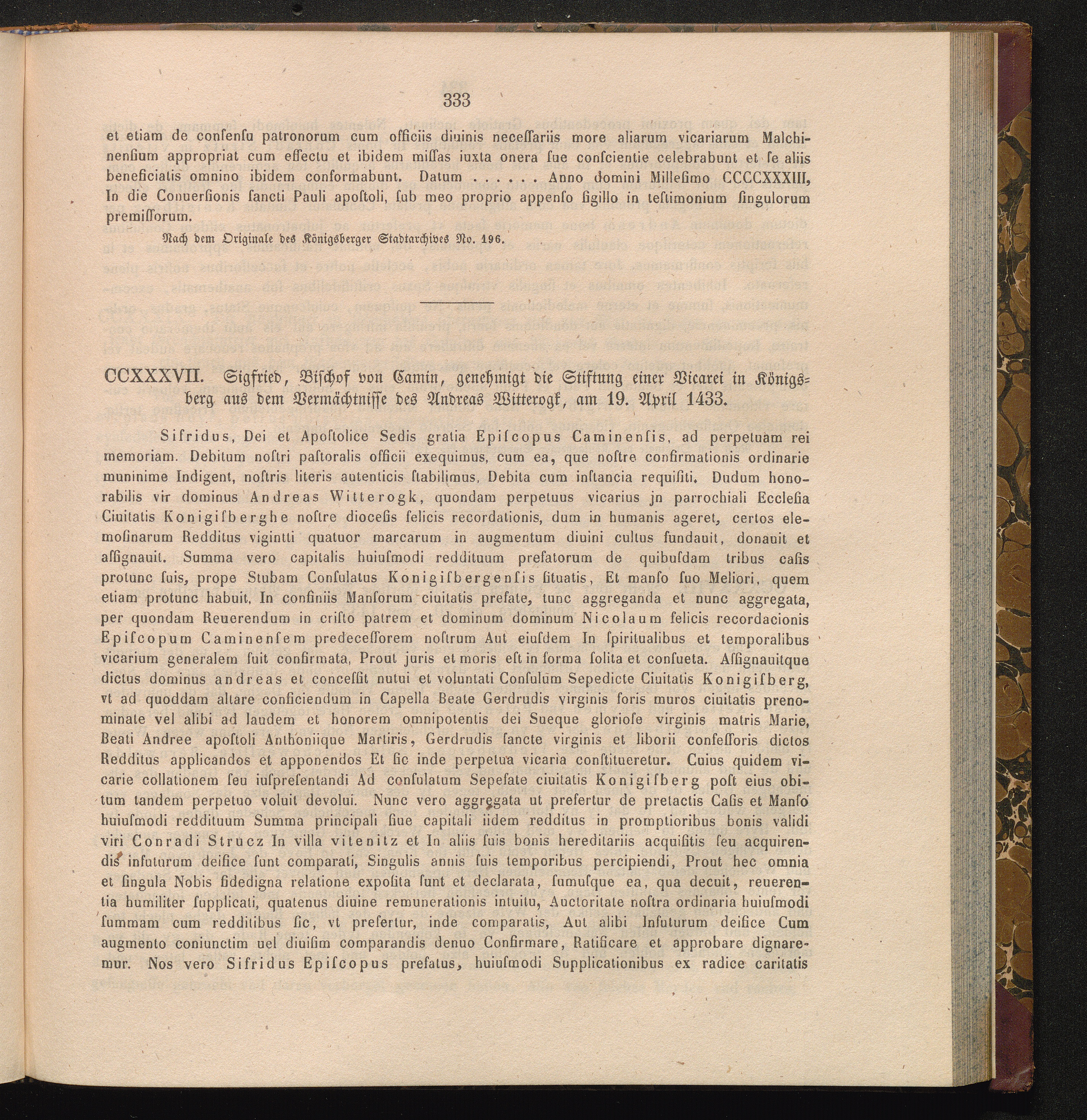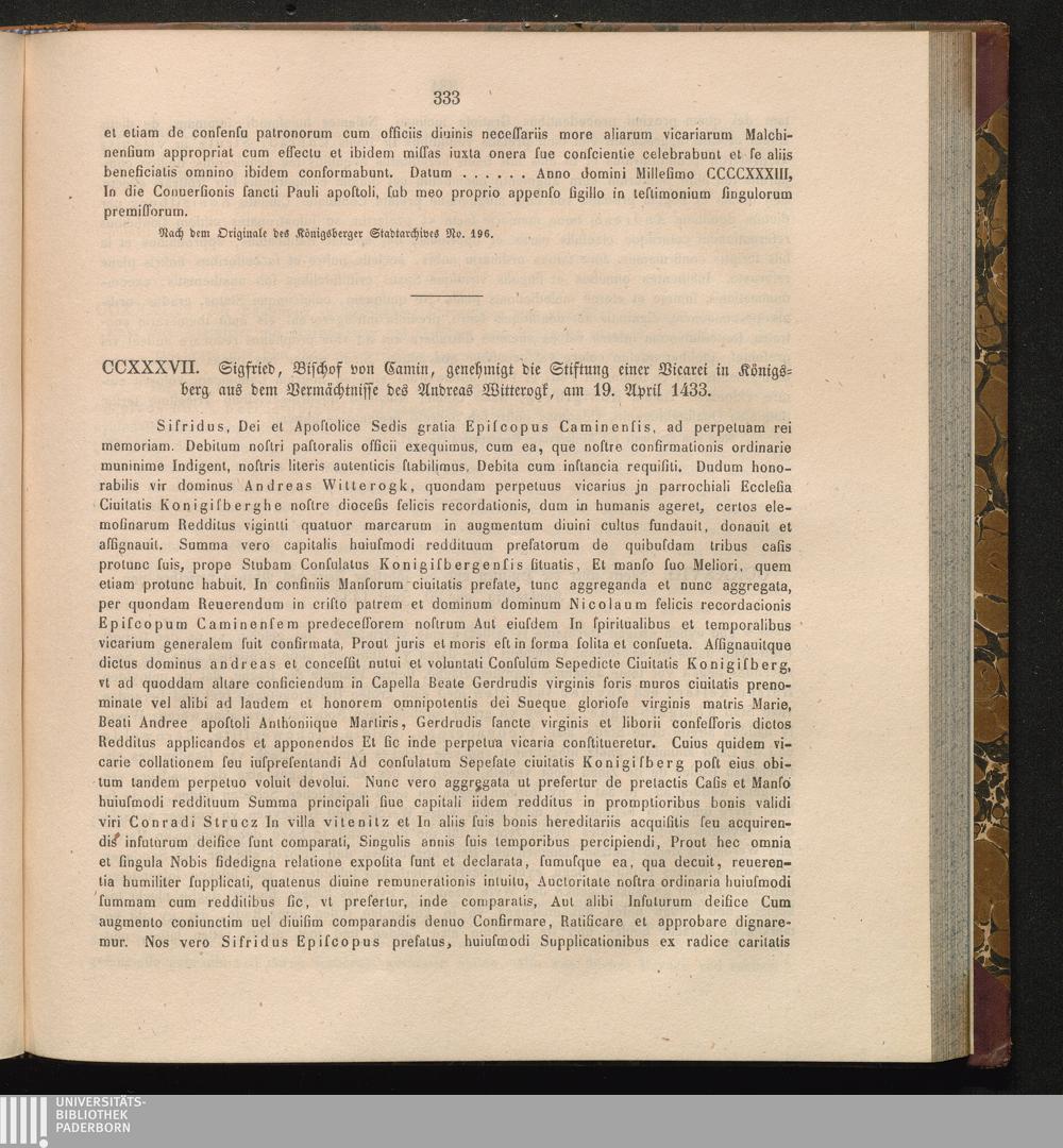CCXXXVII. Siegfried, Bischof von Camin, genehmigt die Stiftung einer Vicarei in Königsberg[...]