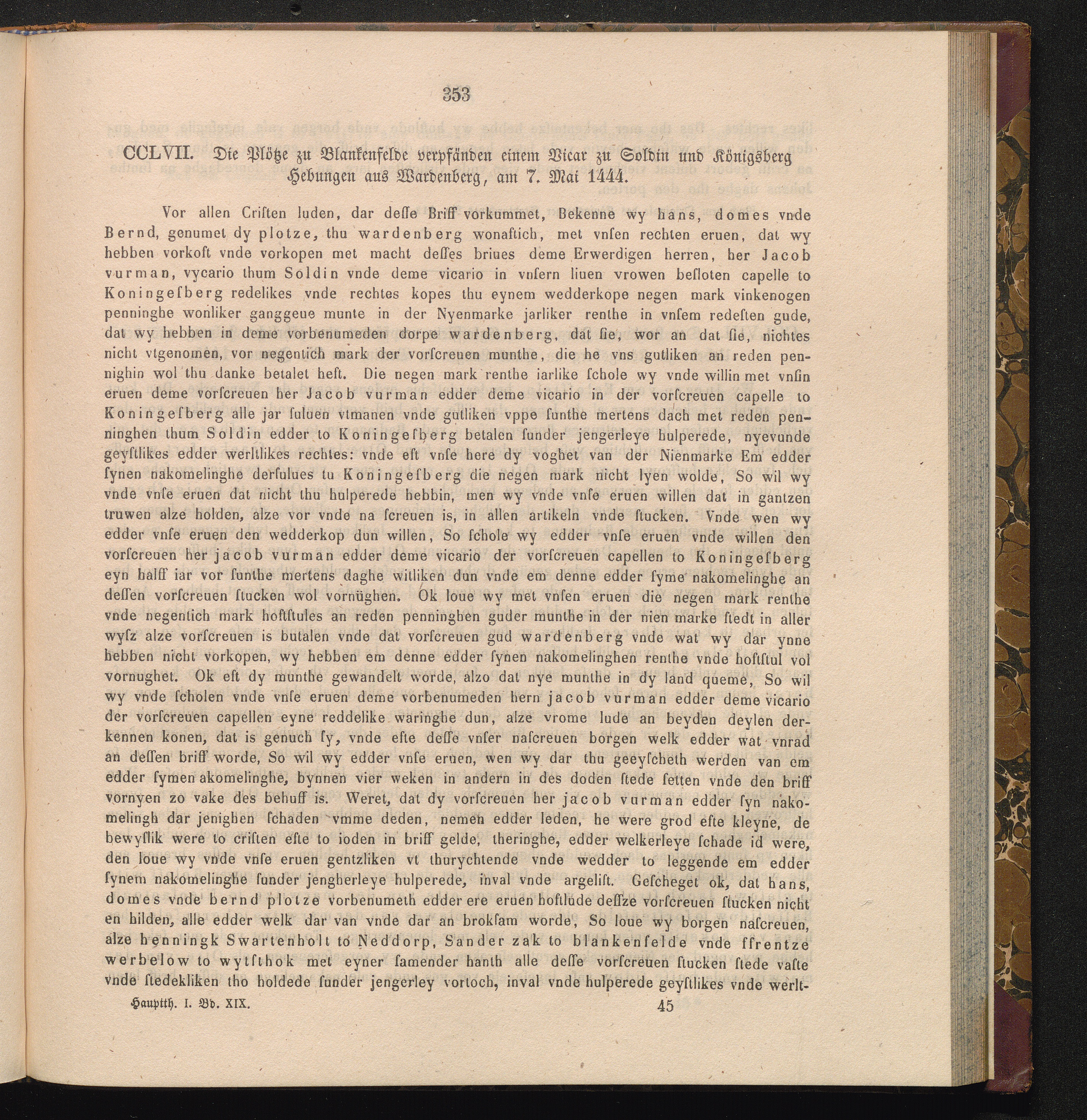 CCLVII. Die Plötze zu Blankenfelde verpfänden einem Vicar zu Soldin und Königsberg[...]