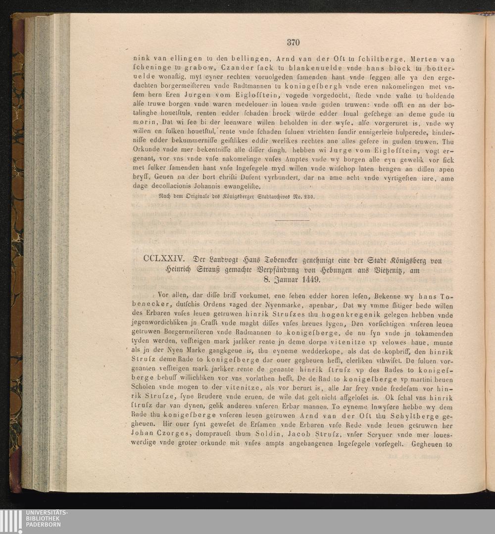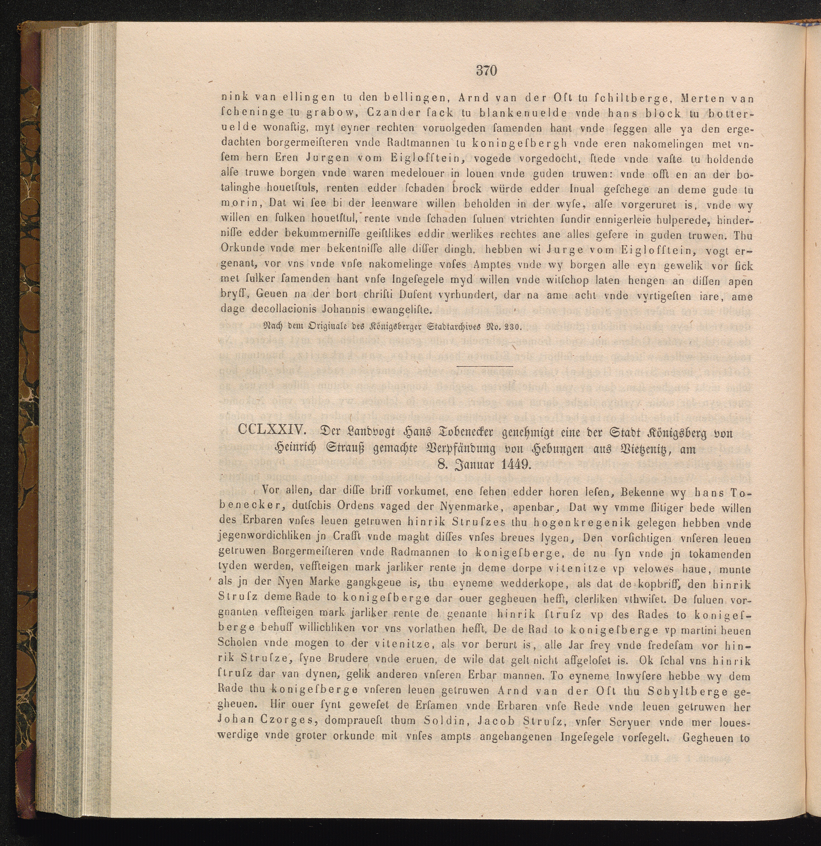 CCLXXIV. Der Landvogt Hans Tobenecker genehmigt eine der Stadt Königsberg von Heinrich[...]