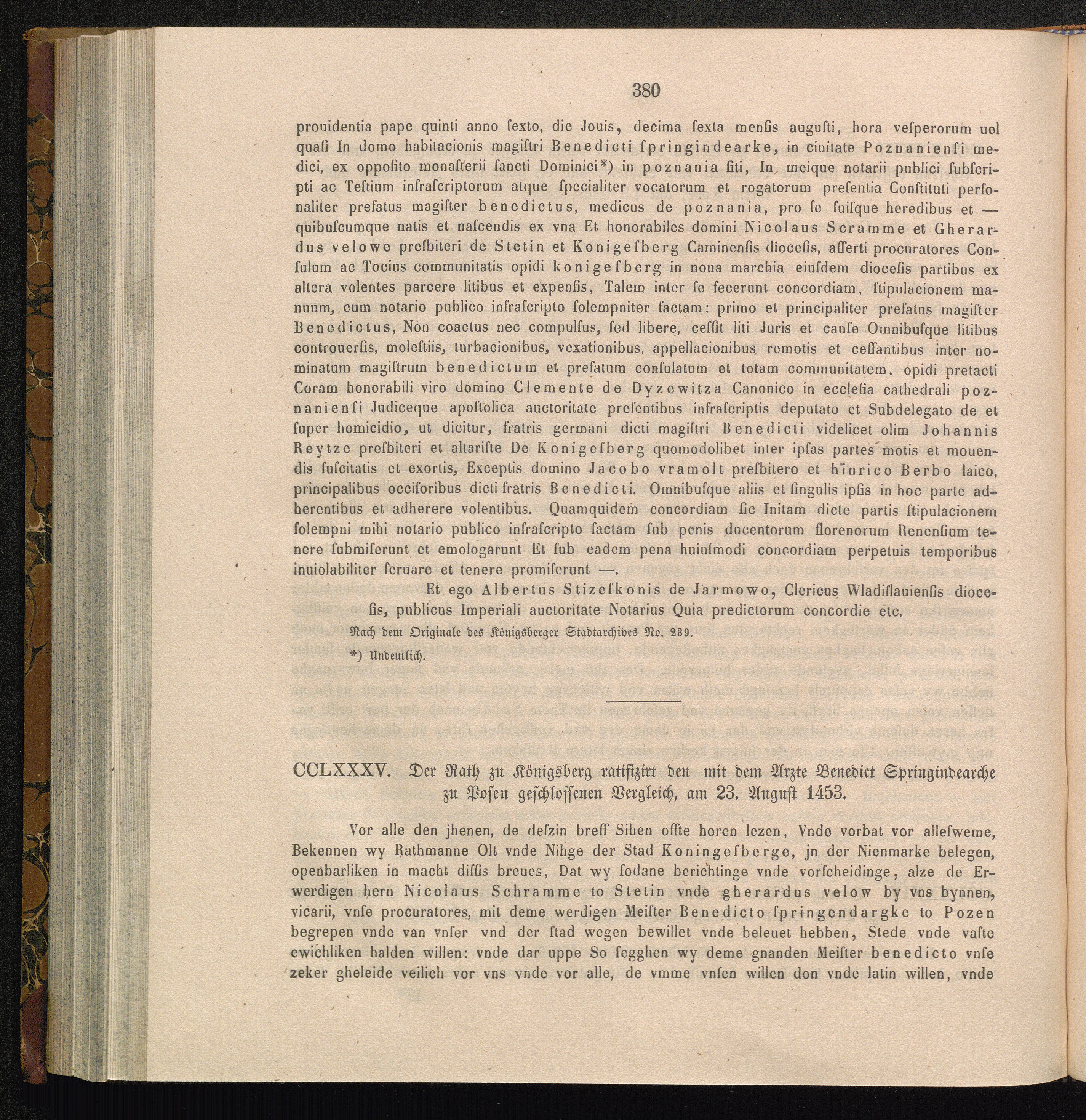 CCLXXXV. Der Rath zu Königsberg ratifizirt den mit dem Artze Benedict Springindearche[...]