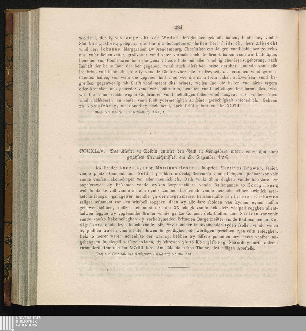 CCCXLIV. Das Kloster zu Soldin quittirt den Rath zu Königsberg wegen eines ihm ausgezahlten[...]