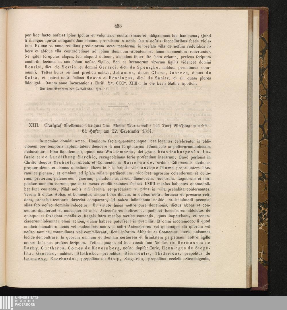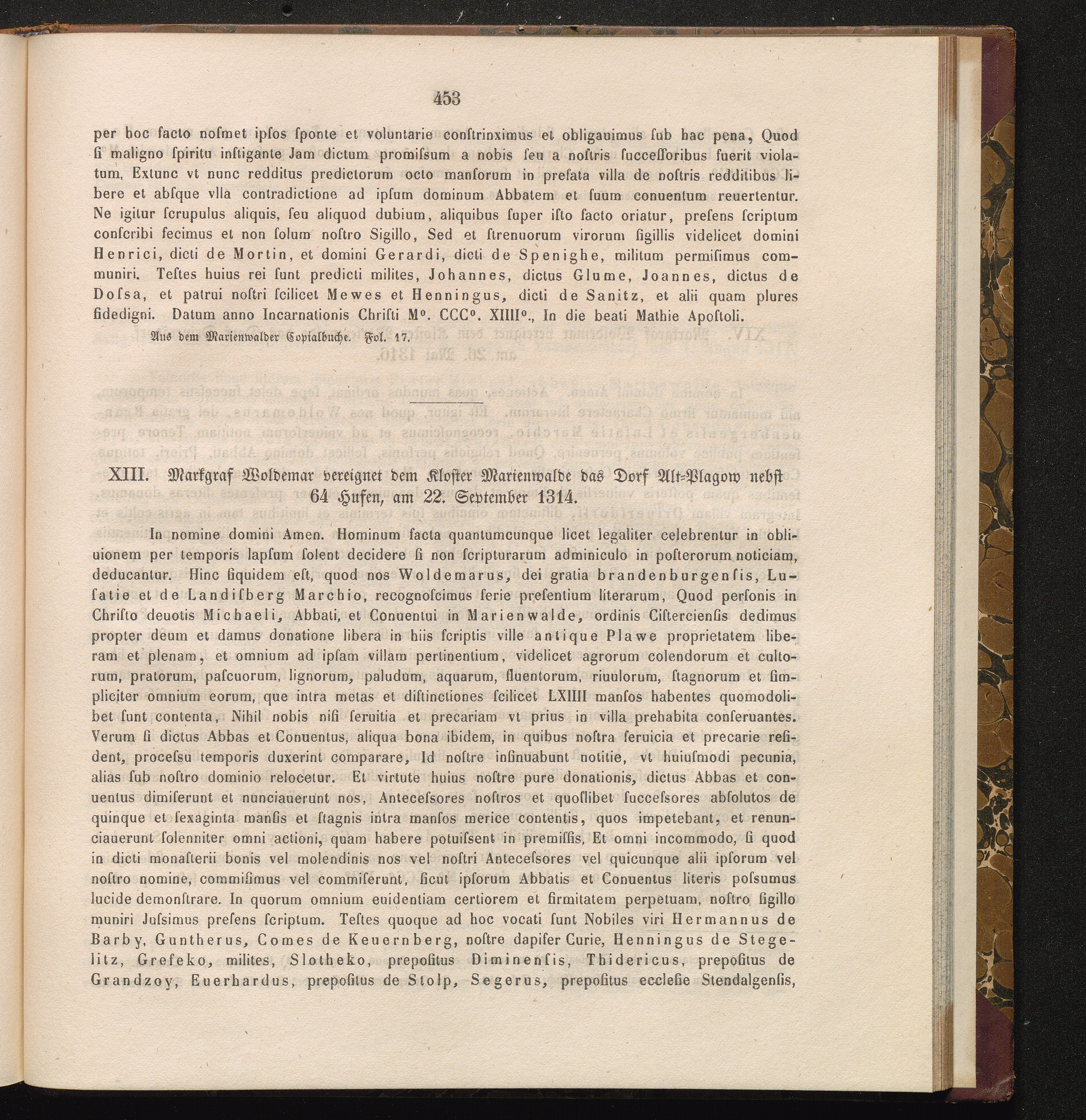 XIII. Markgraf Woldemar vereignet dem Kloster Marienwalde das Dorf Alt - Plagow nebst[...]