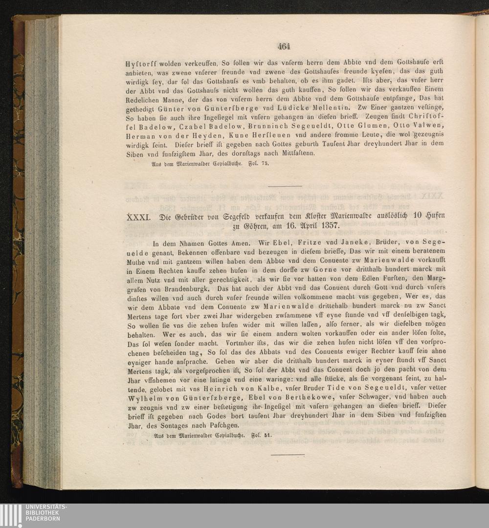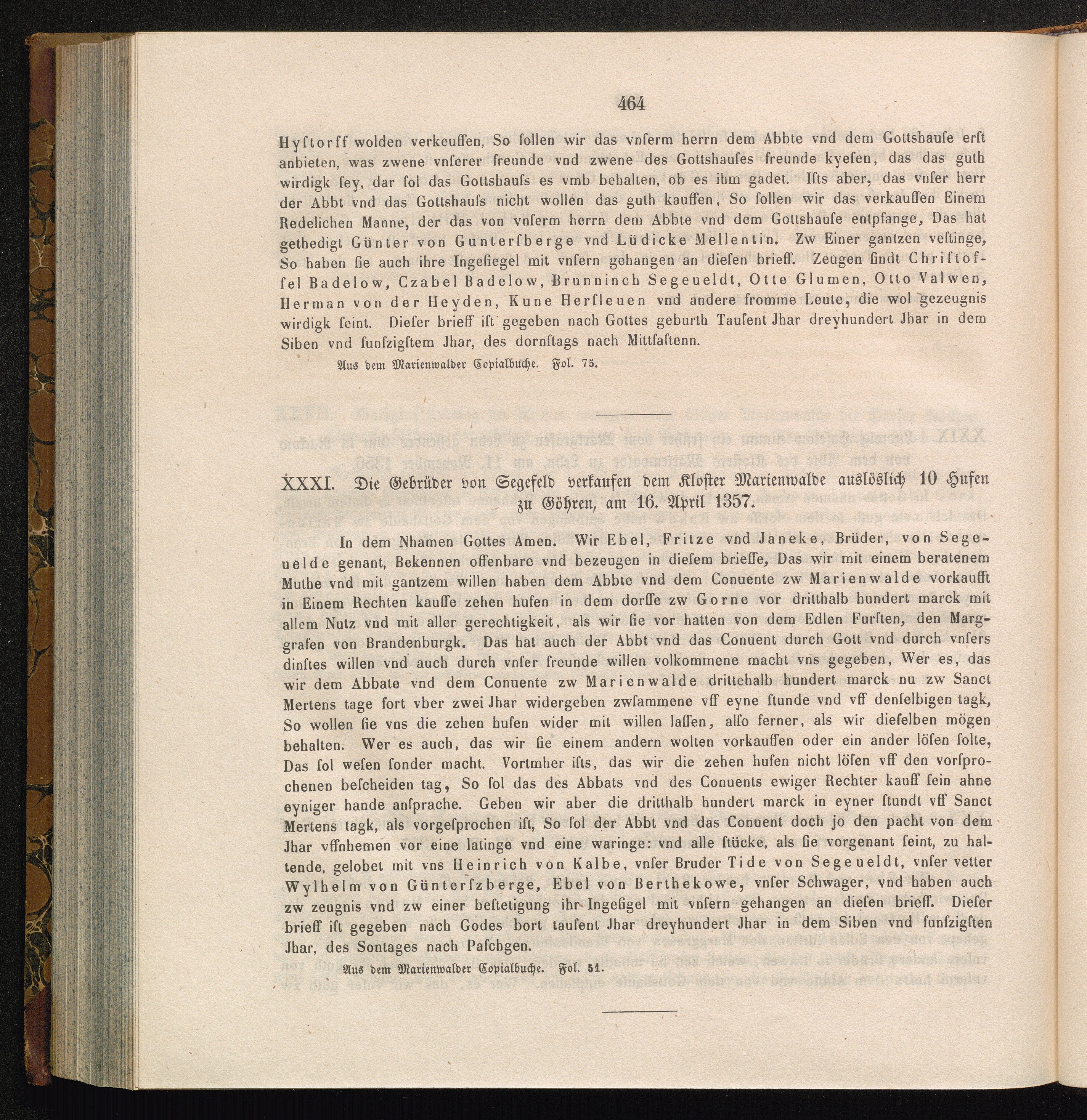 XXXI. Die Gebrüder von Segefeld verkaufen dem Kloster Marienwalde auslöslich 10 Hufen[...]