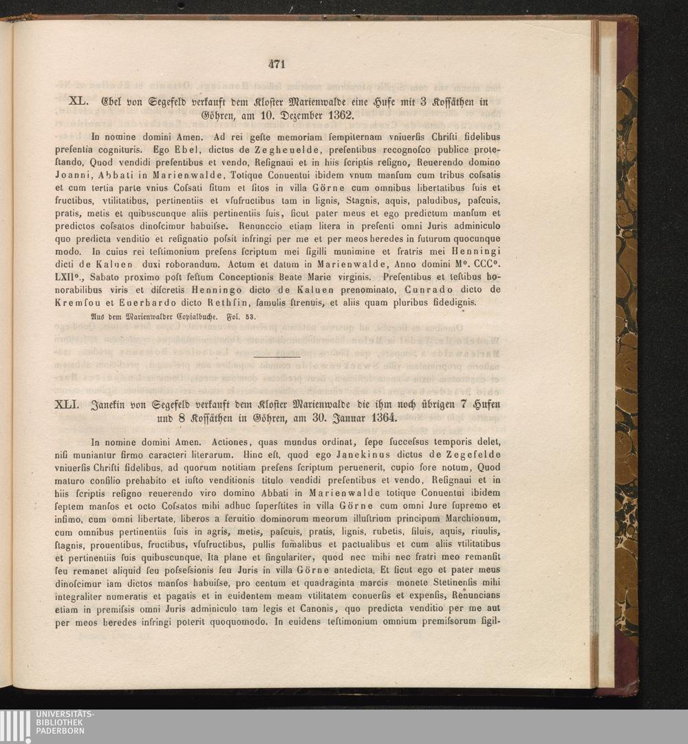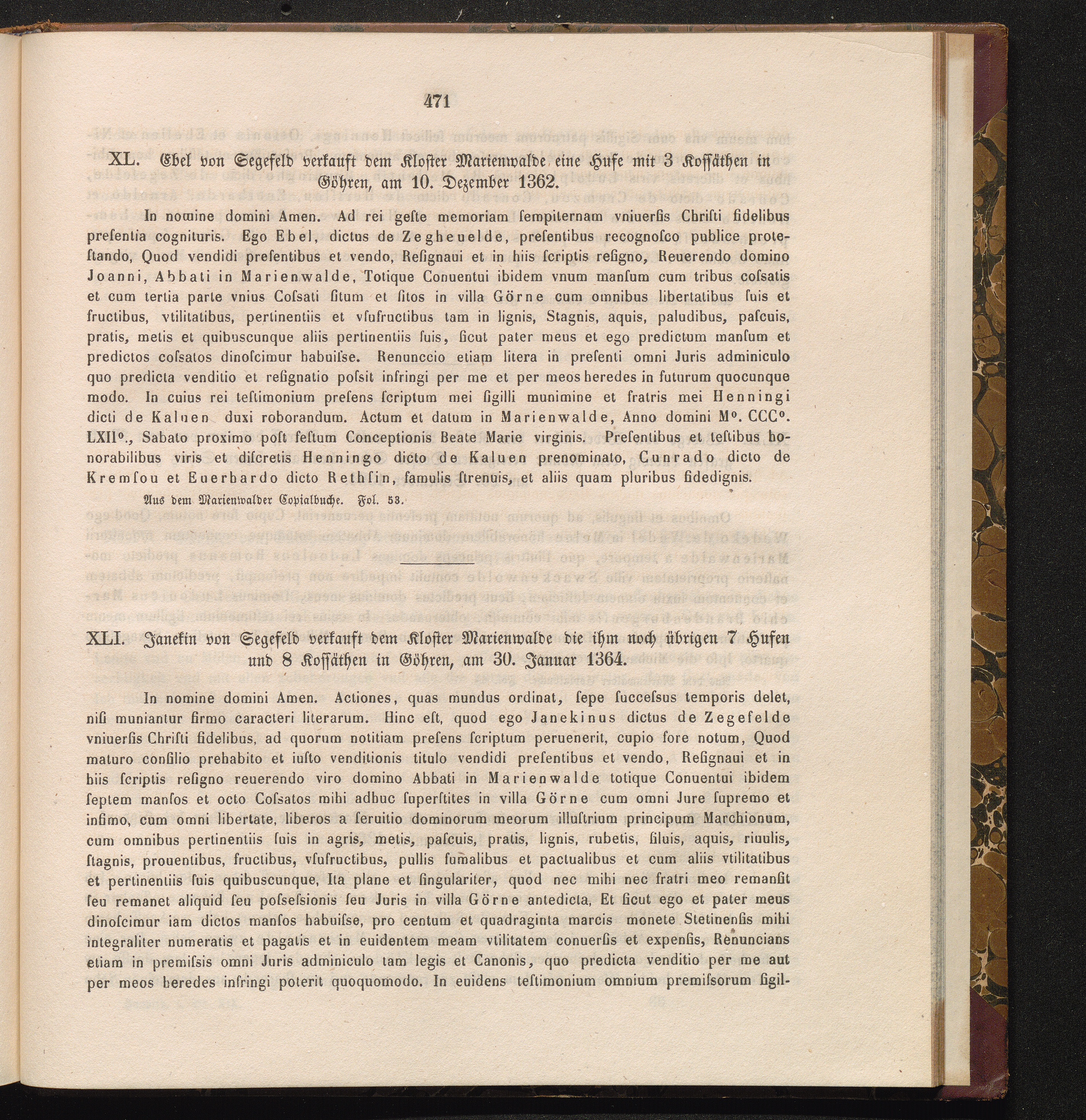 XL. Ebel von Segefeld verkauft dem Kloster Marienwalde eine Hufe mit 3 Kossäthen[...]