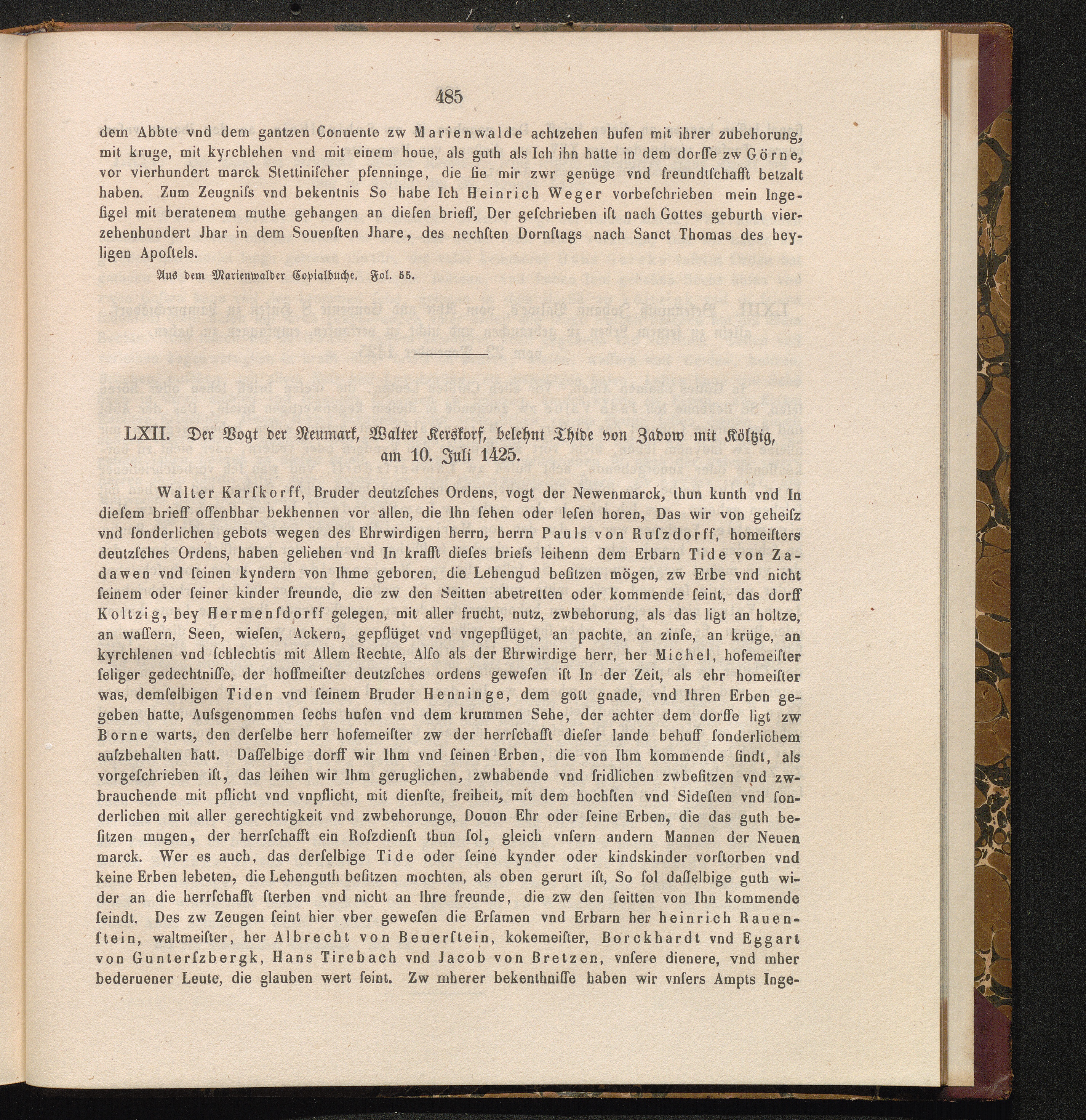 LXII. Der Vogt der Neumark, Walter Kerskorf, belehnt Thide von Zadow mit Költzig,[...]