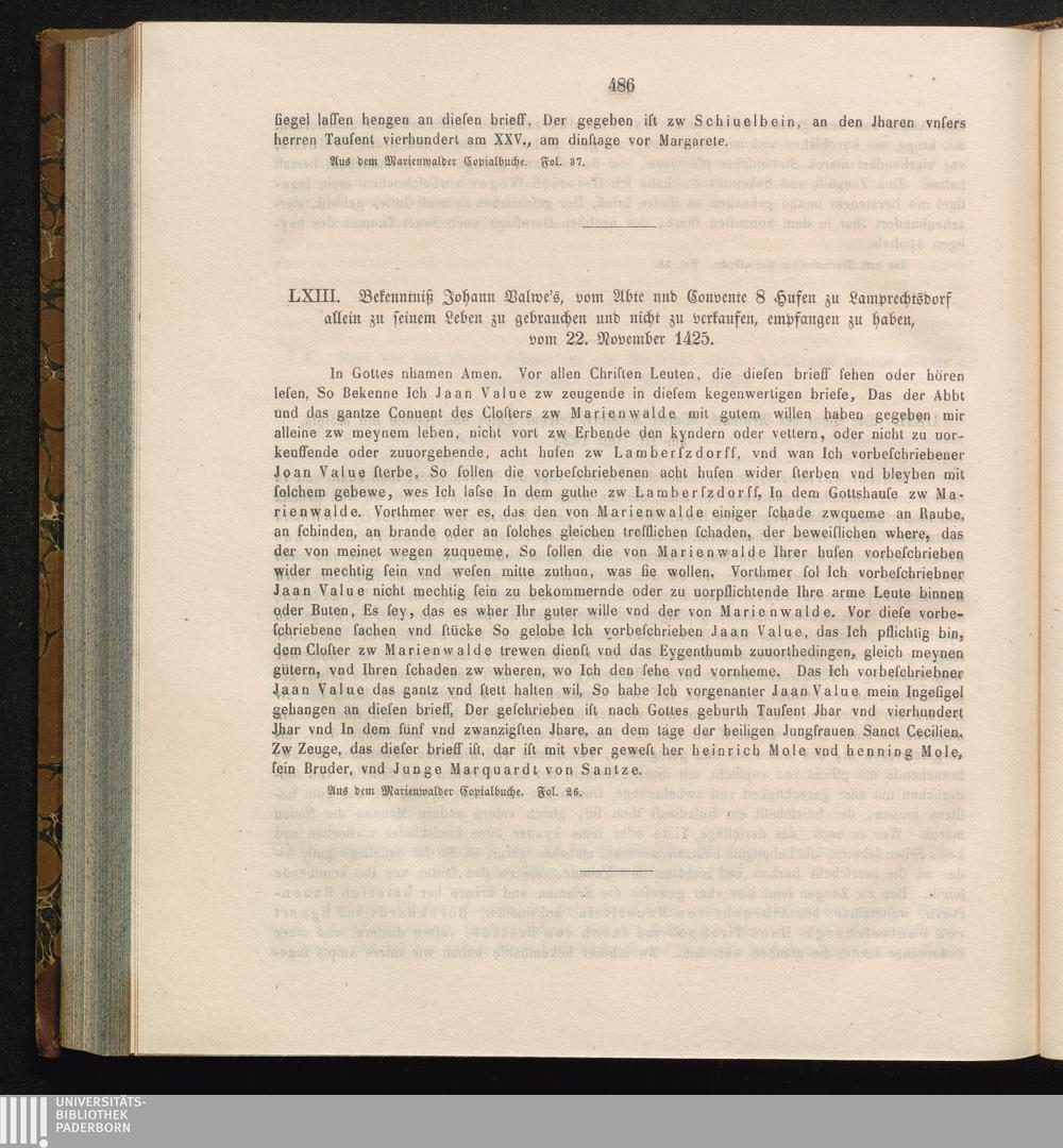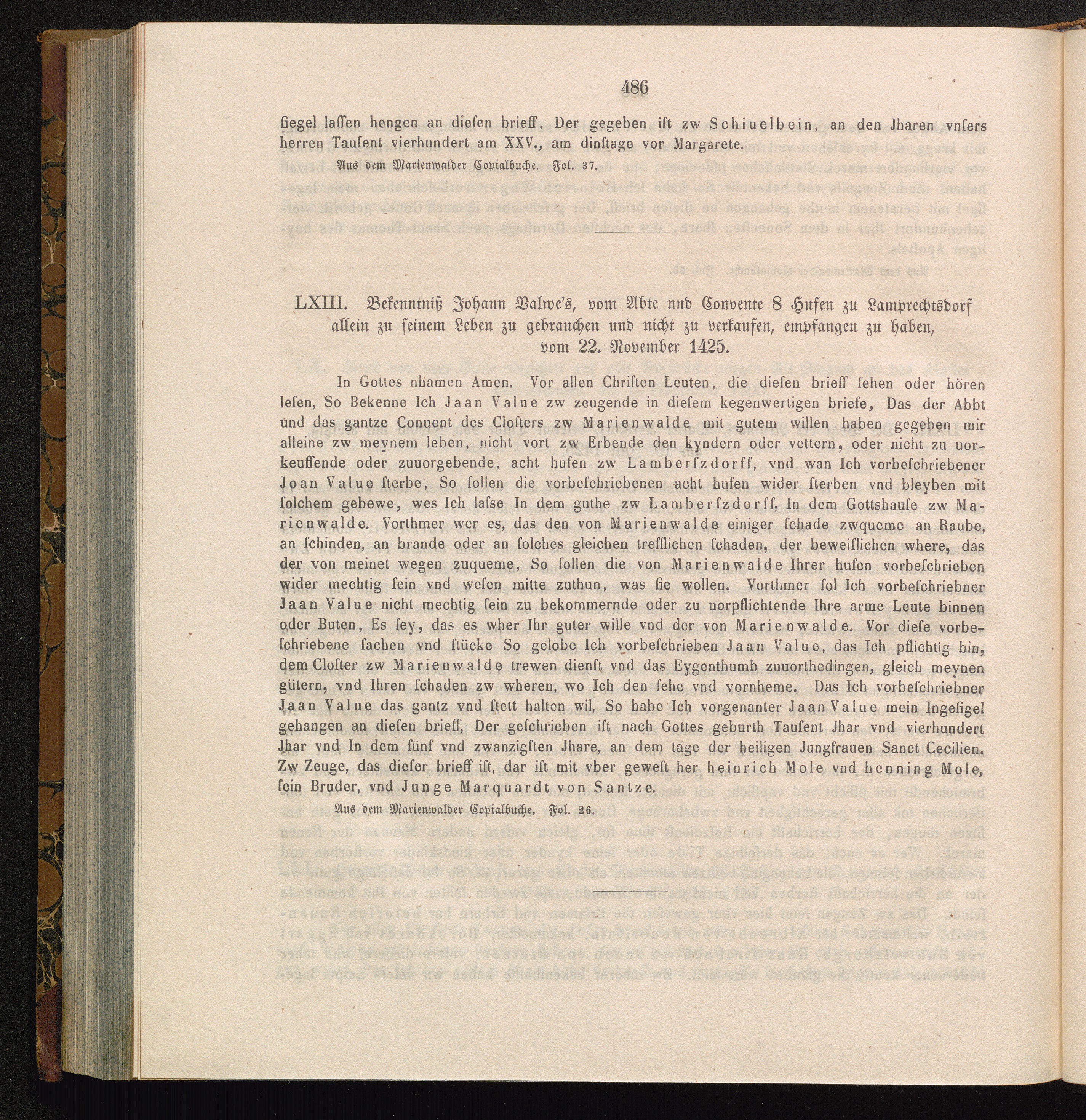 LXIII. Bekenntniß Johann Valwe's, vom Abte und Convente 8 Hufen zu Lamprechtsdorf[...]