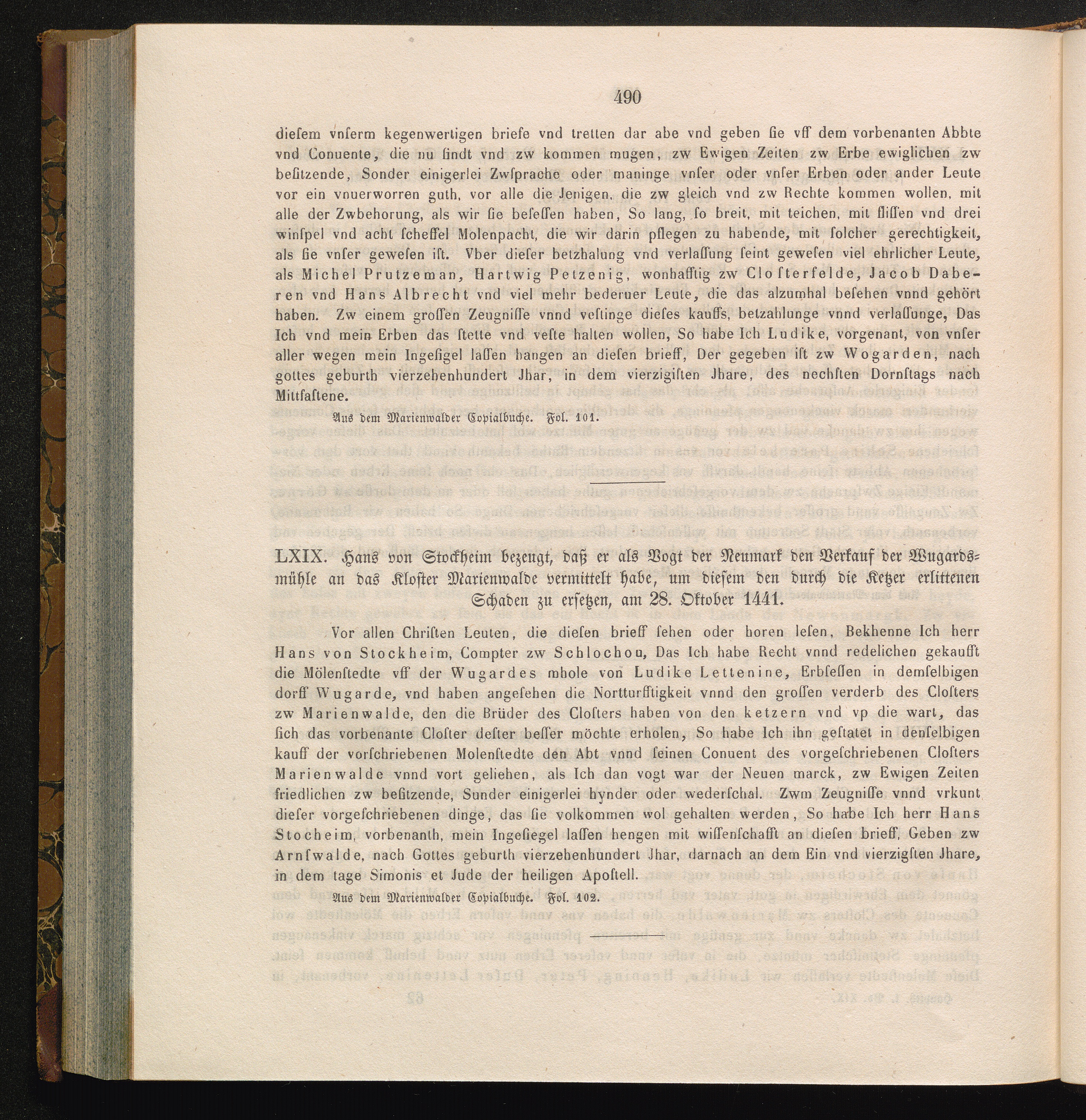 LXIX. Hans von Stockheim bezeugt, daß er als Vogt der Neumark den Verkauf der Wugardsmühle[...]