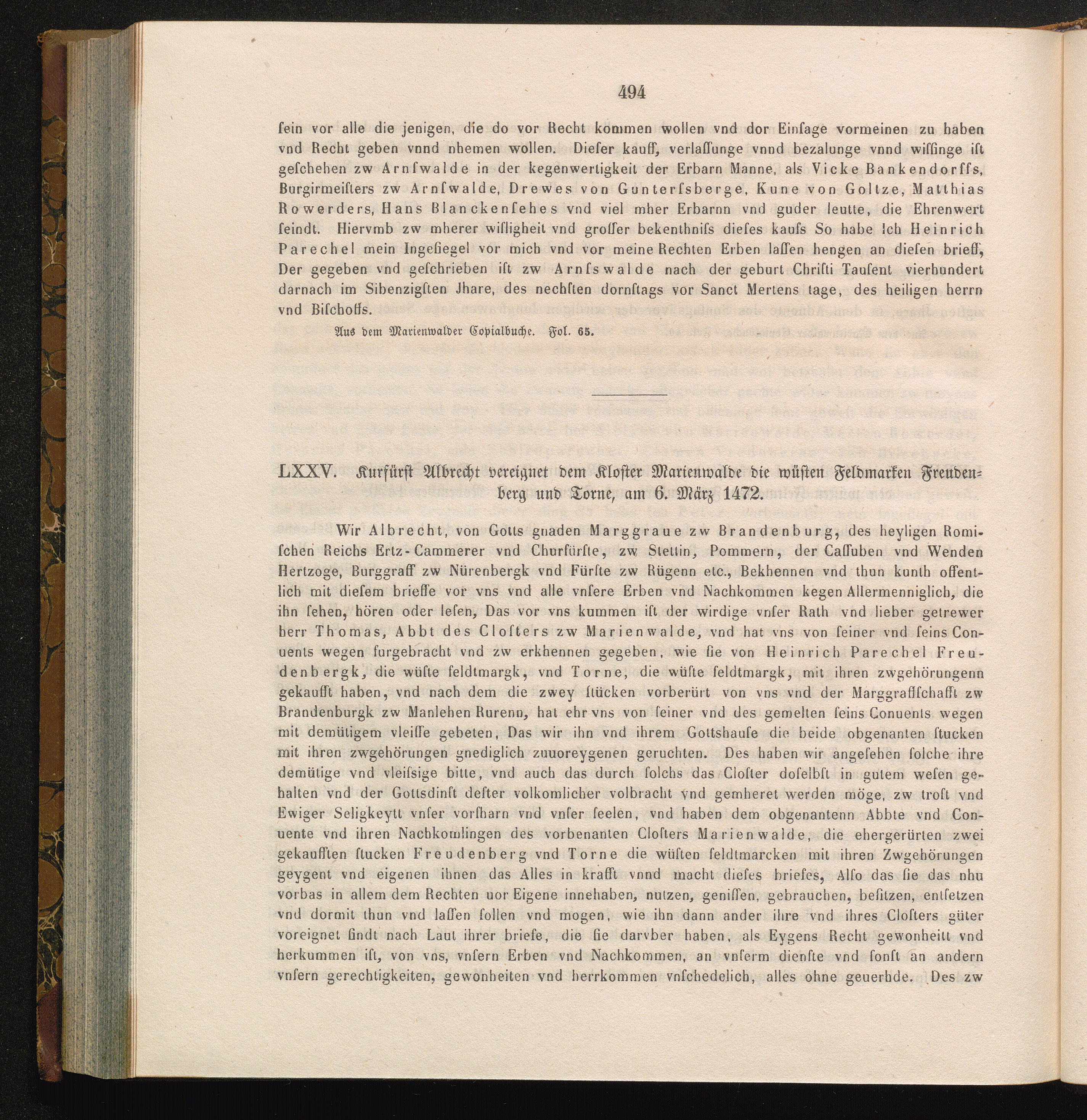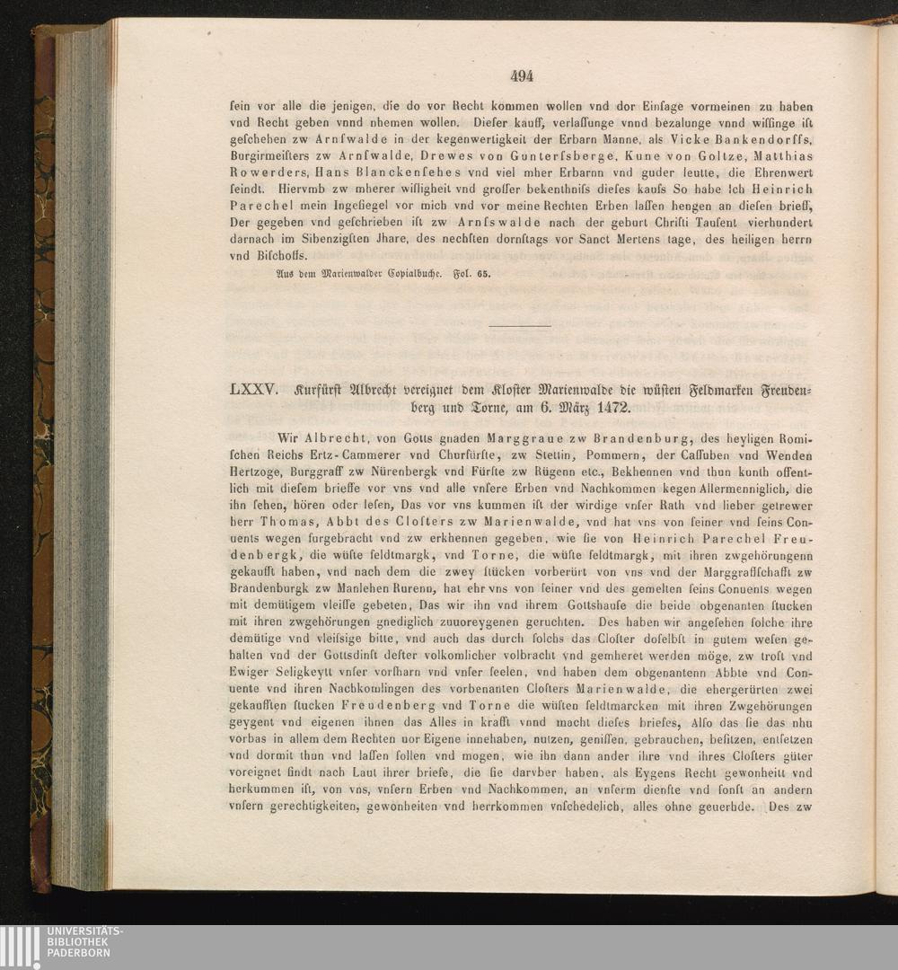 LXXV. Kurfürst Albrecht vereignet dem Kloster Marienwalde die wüsten Feldmarken Freudenberg[...]