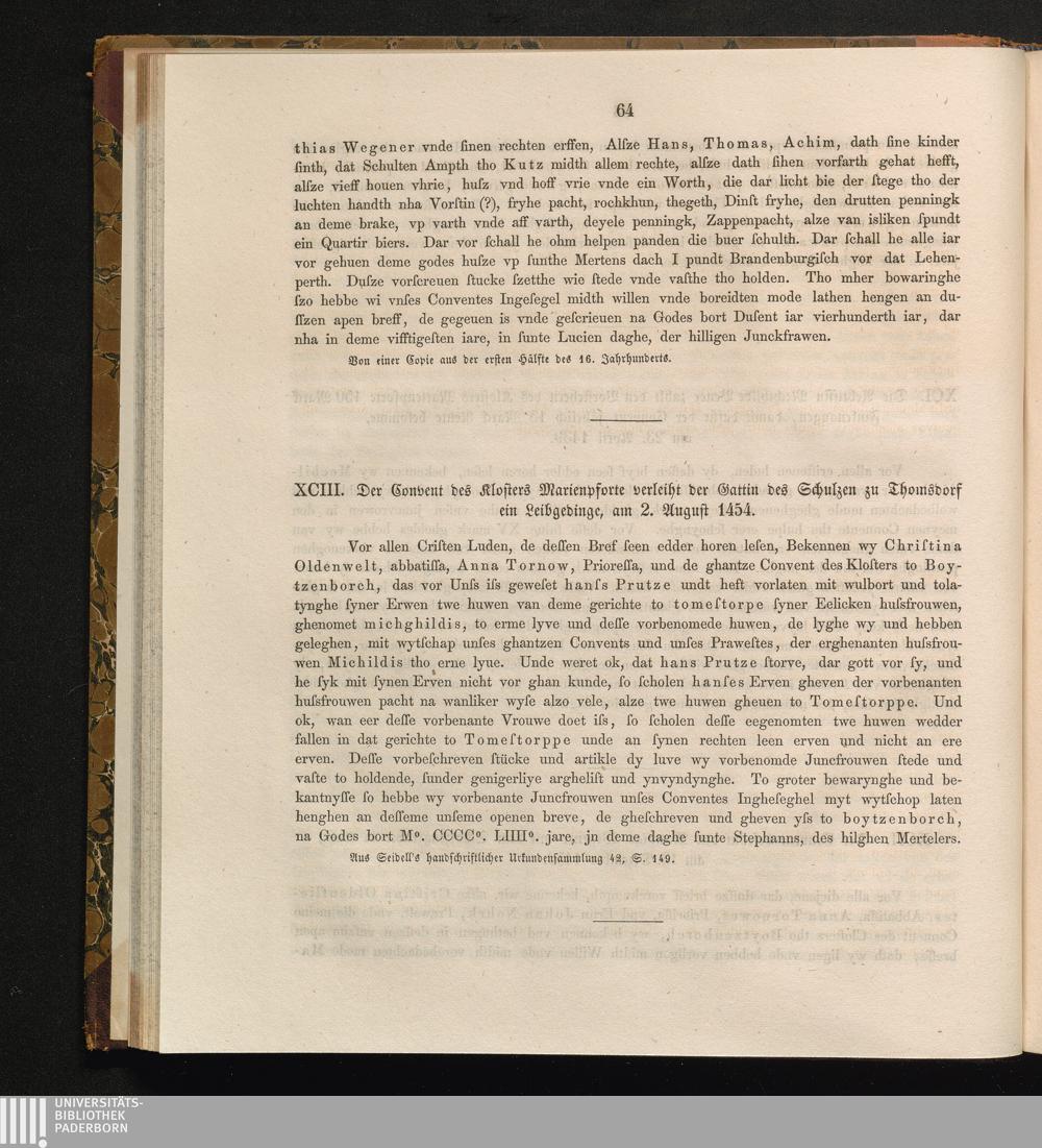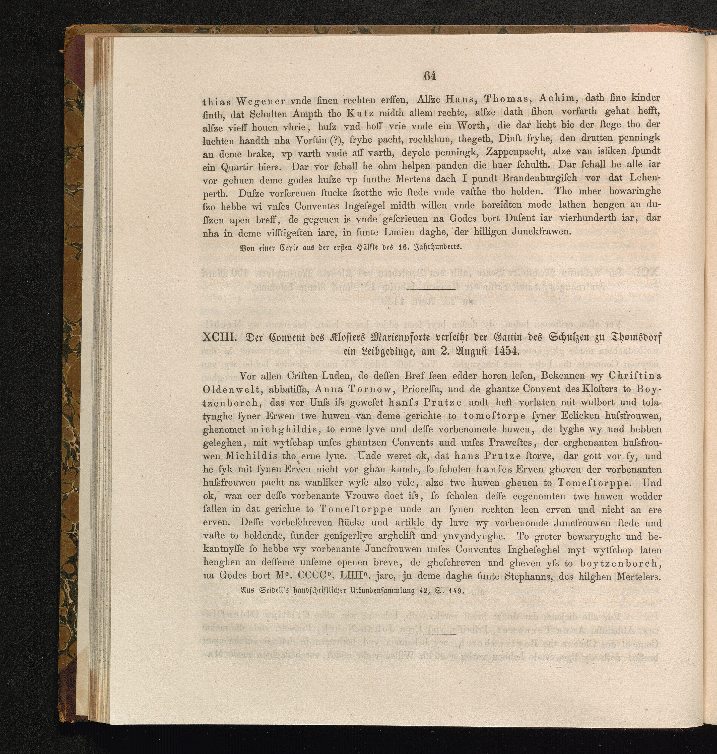 XCIII. Der Convent des Klosters Marienpforte verleiht der Gattin des Schulzen zu[...]