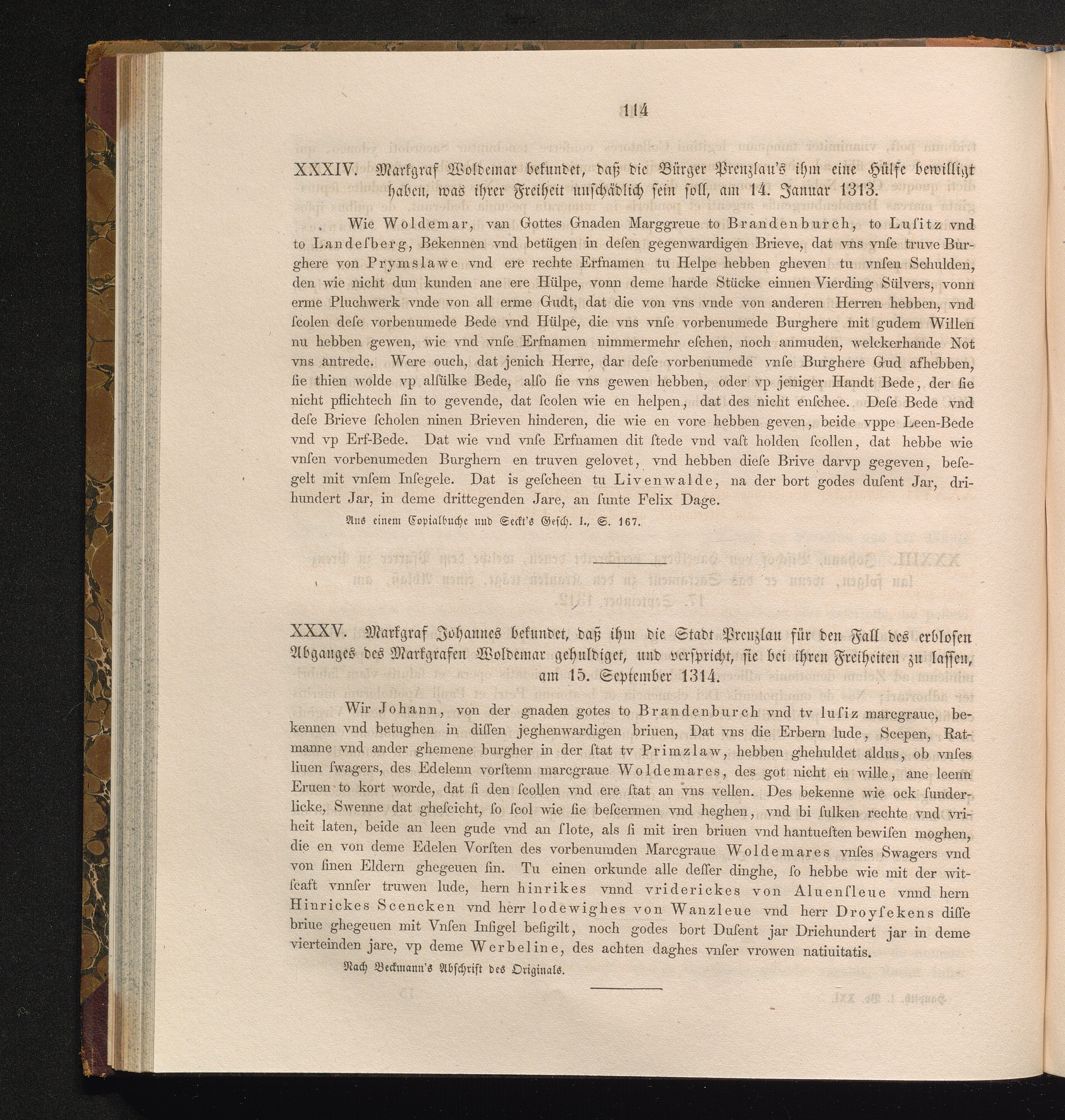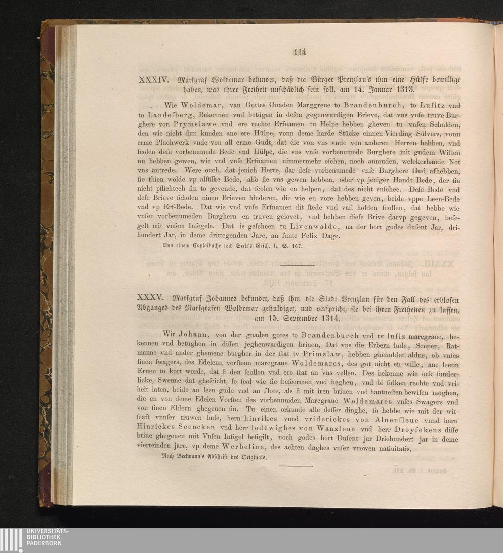 XXXV. Markgraf Johannes bekundet, daß ihm die Stadt Prenzlau für den Fall des erblosen[...]