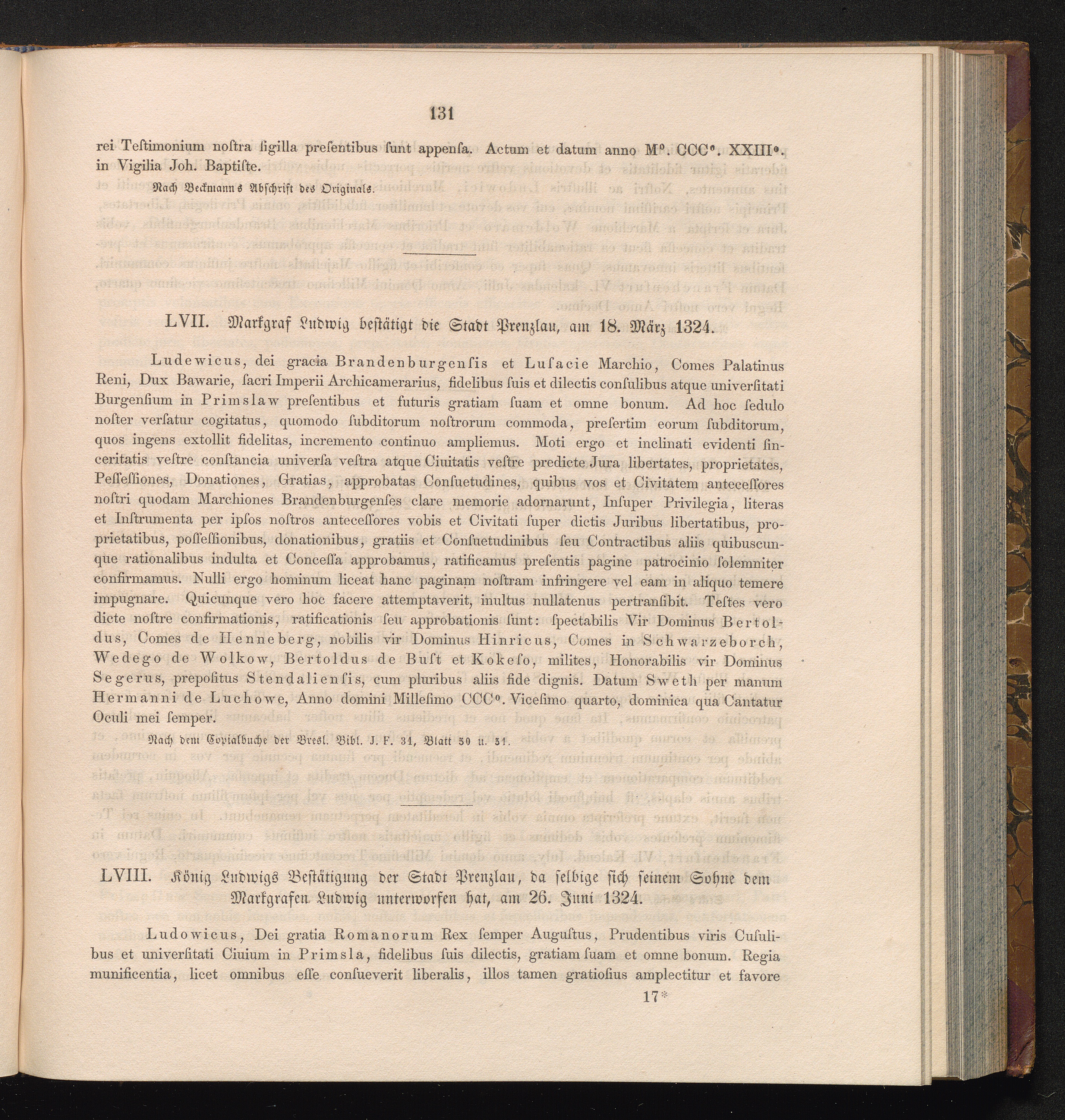 LVIII. König Ludwigs Bestätigung der Stadt Prenzlau, da selbige sich seinem Sohne[...]