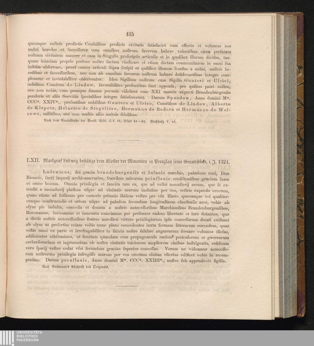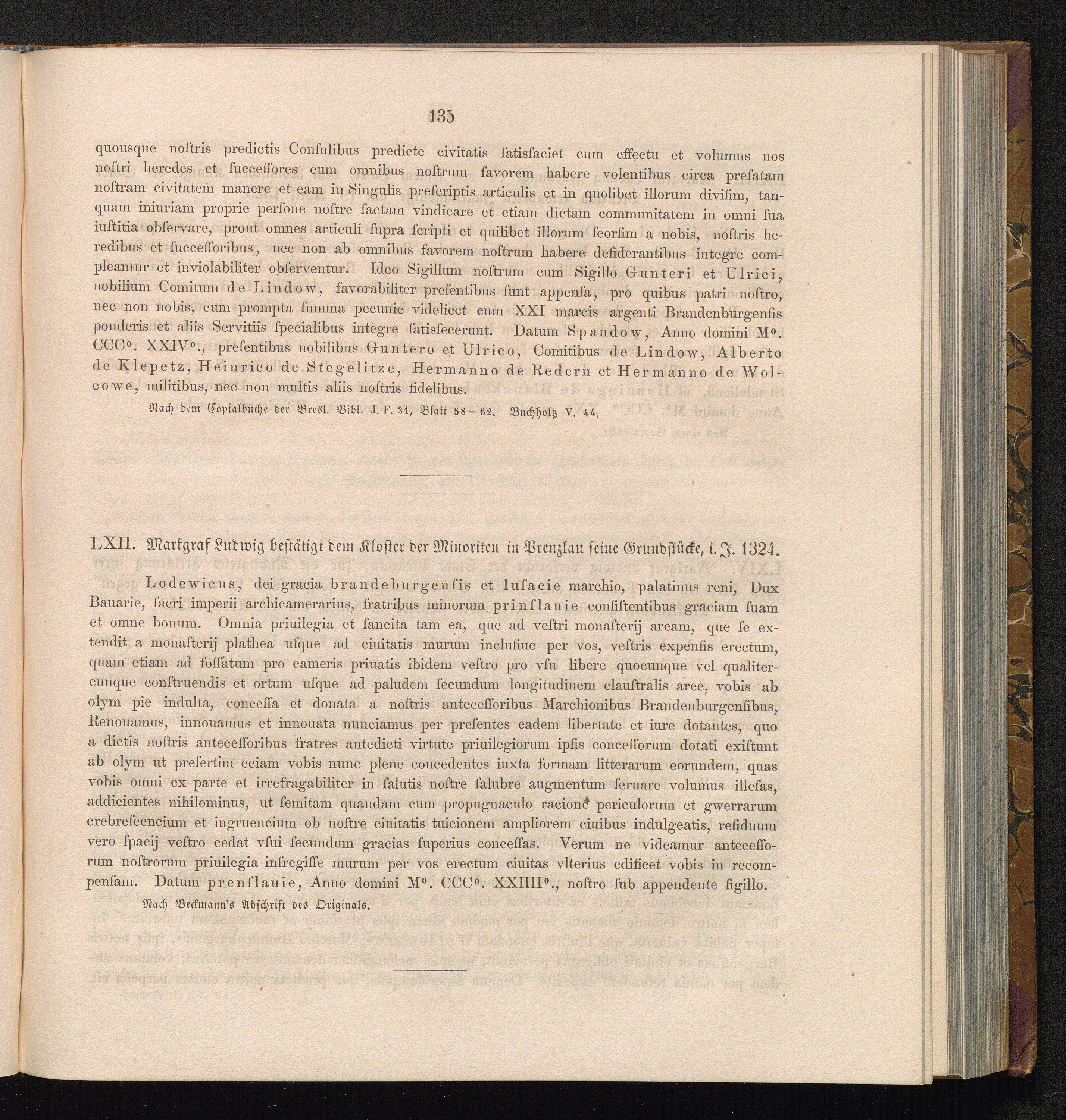 LXII. Markgraf Ludwig bestätigt dem Kloster der Minoriten in Prenzlau seine Grundstücke,[...]