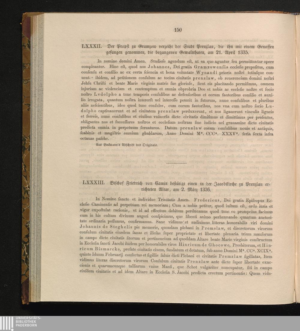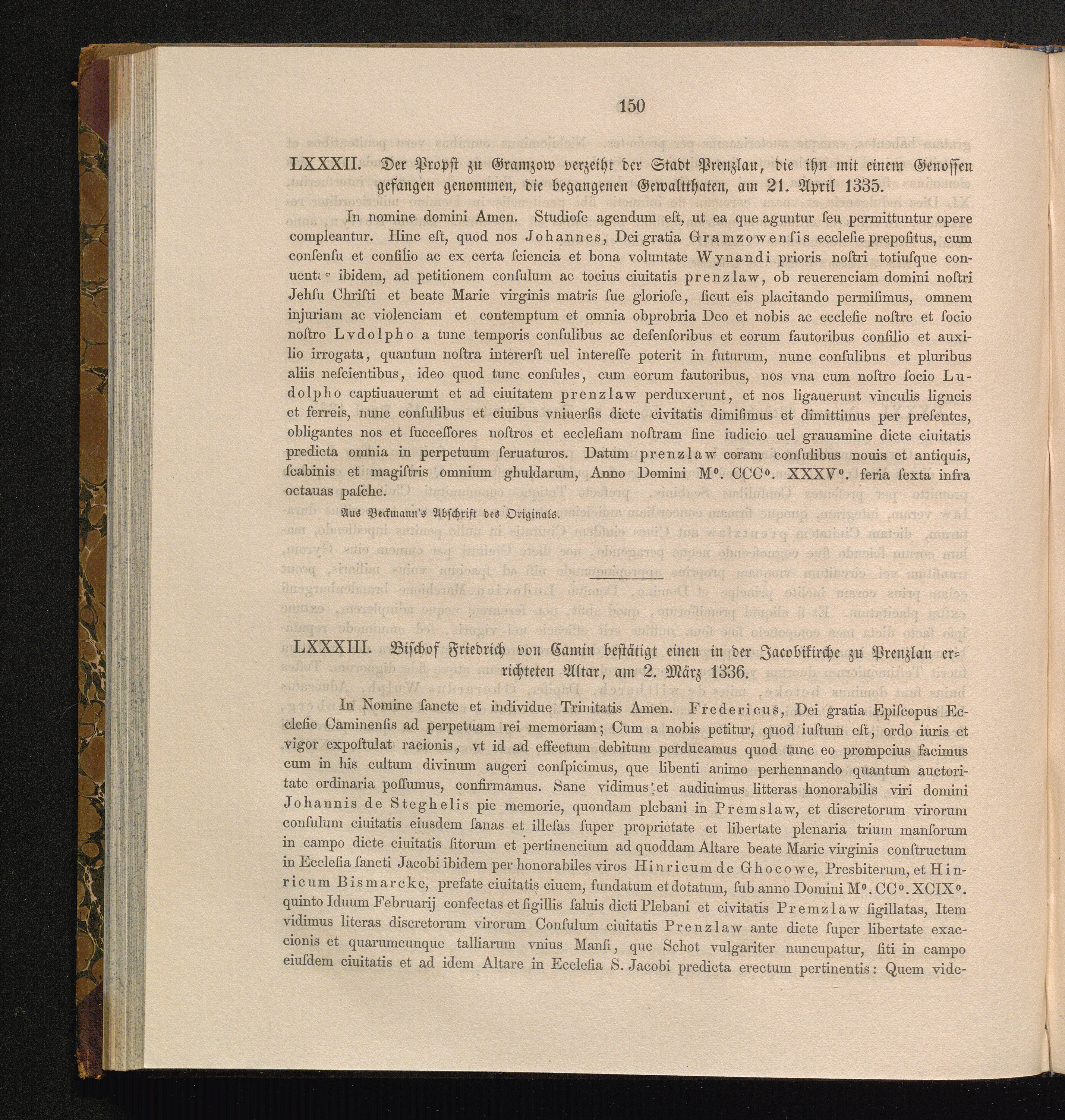 LXXXIII. Bischof Friedrich von Camin bestätigt einen in der Jacobikirche zu Prenzlau[...]