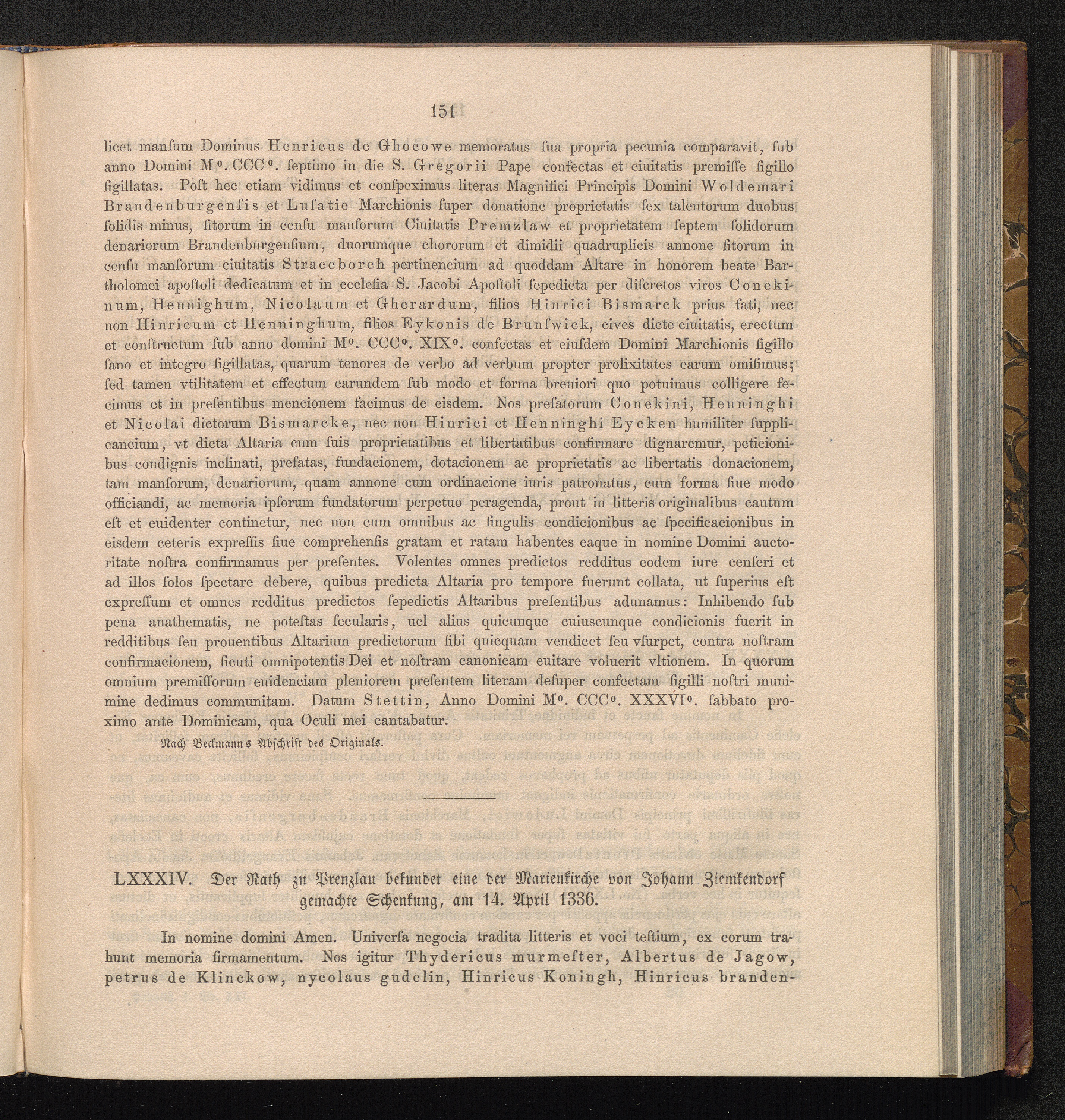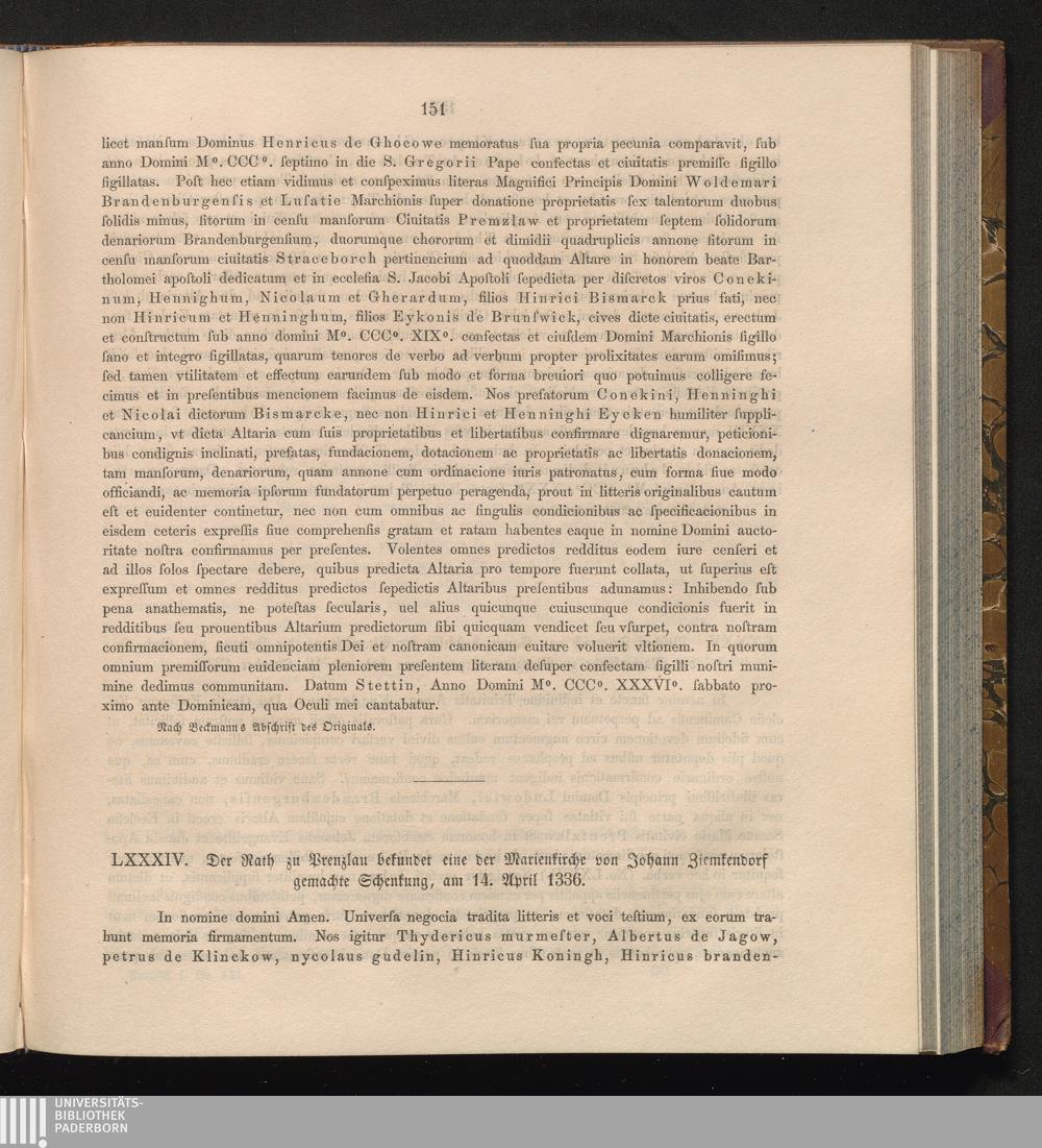 LXXXIV. Der Rath zu Prenzlau bekundet eine der Marienkirche von Johann Ziemkendorf[...]