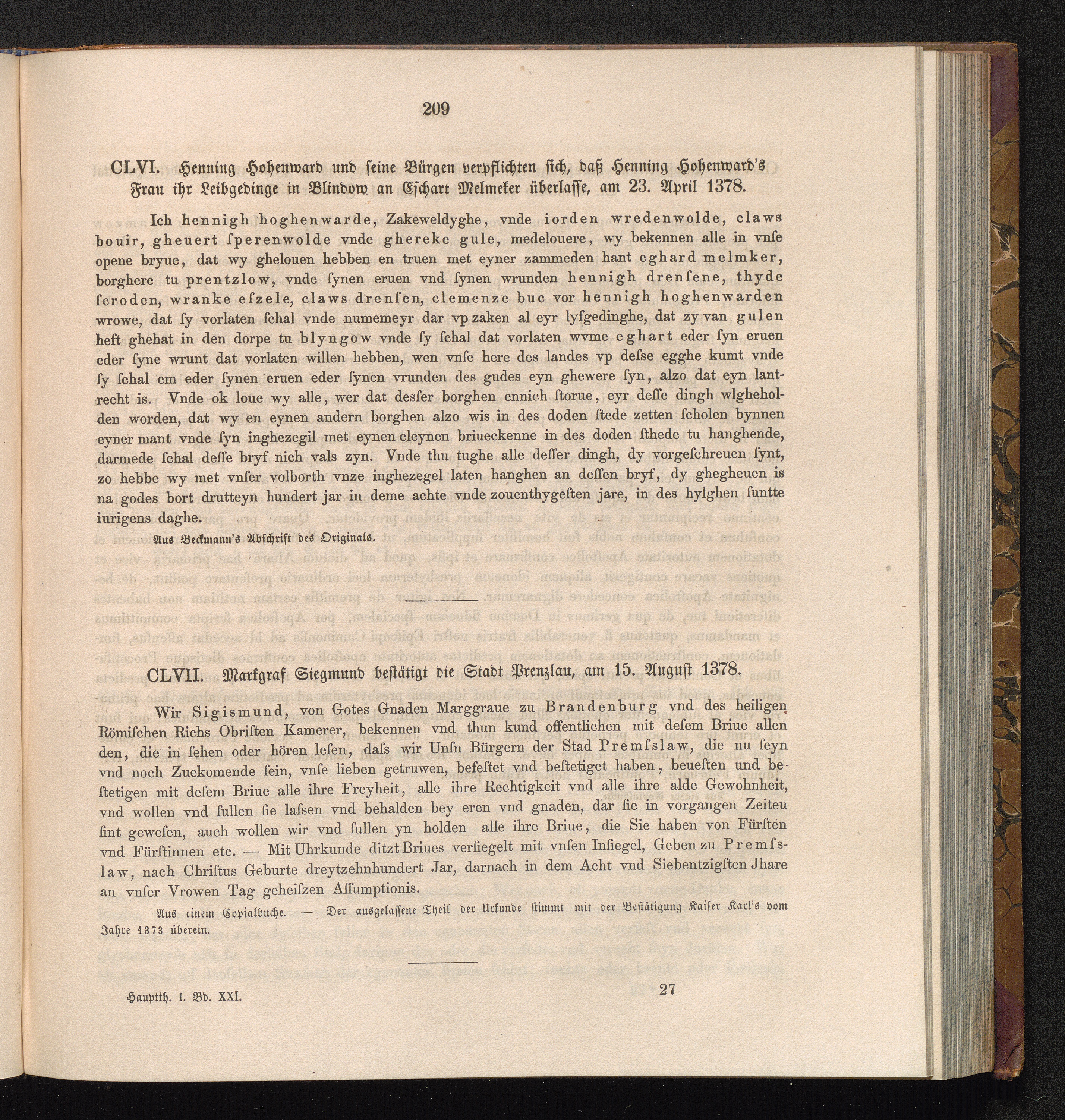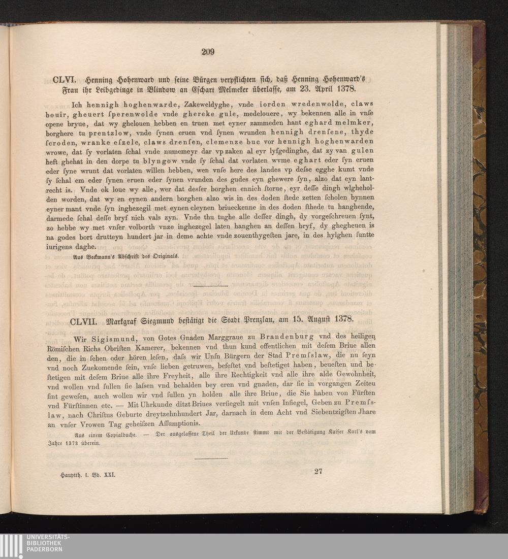 CLVII. Markgraf Siegmund bestätigt die Stadt Prenzlau, am 15. August 1378.