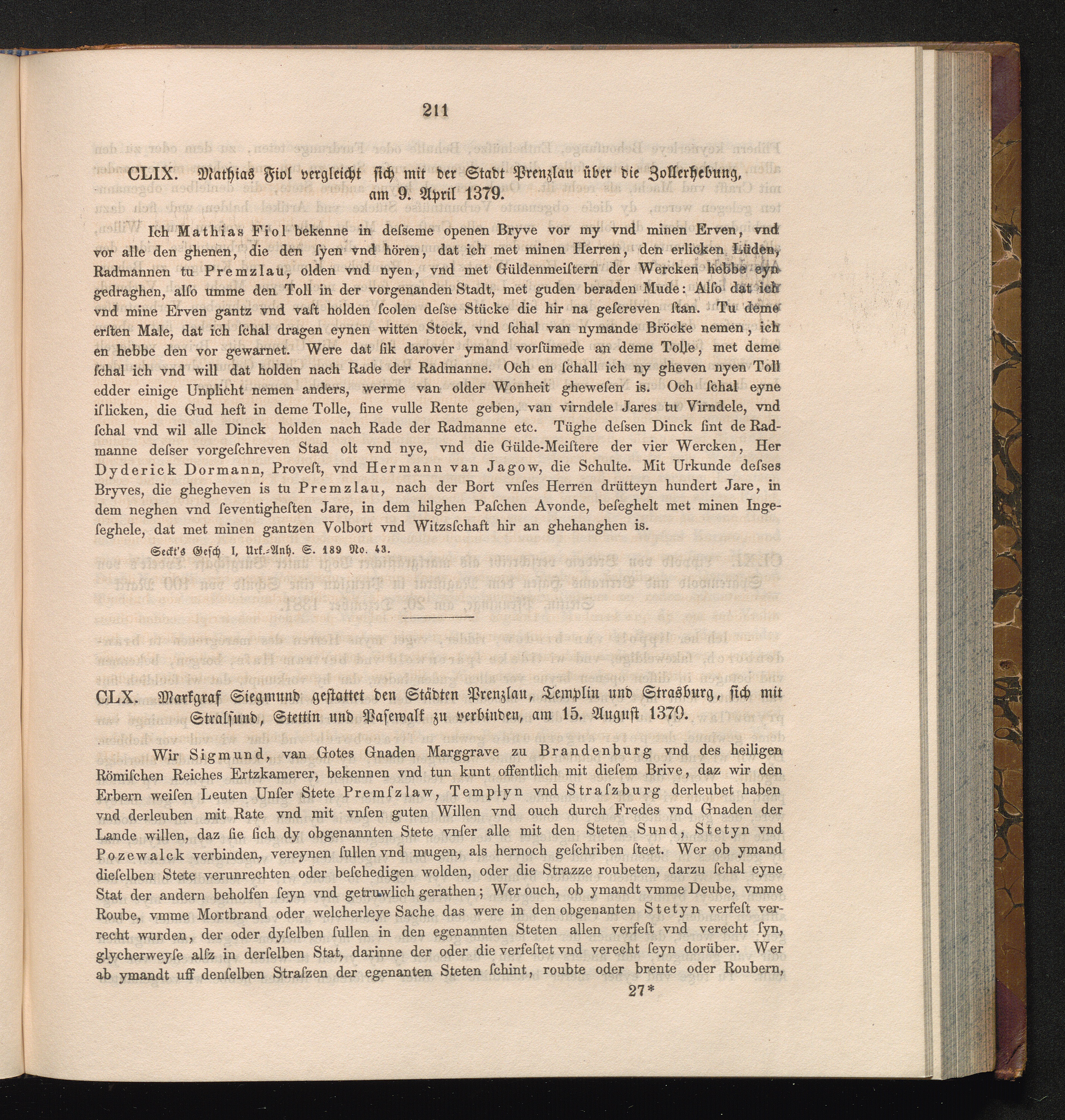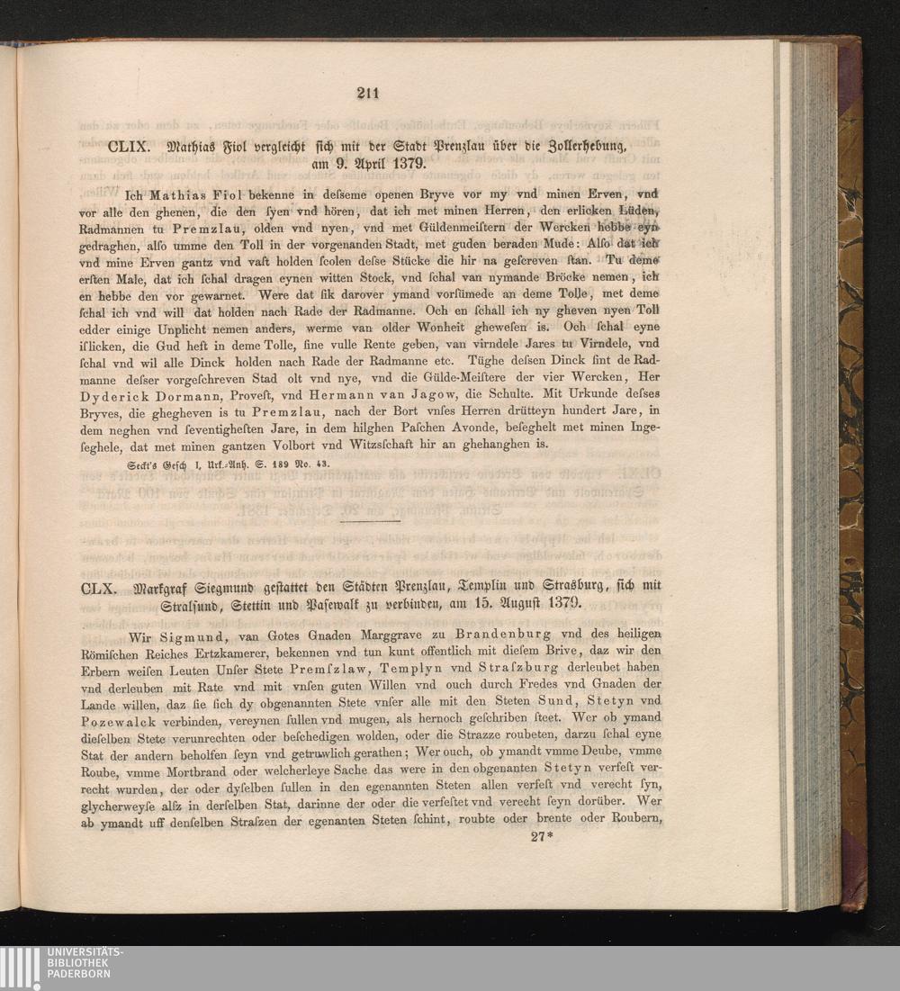CLX. Markgraf Siegmund gestattet den Städten Prenzlau, Templin und Strasburg, sich[...]