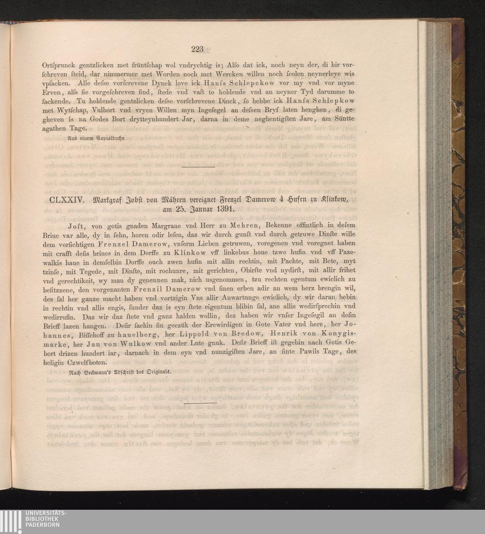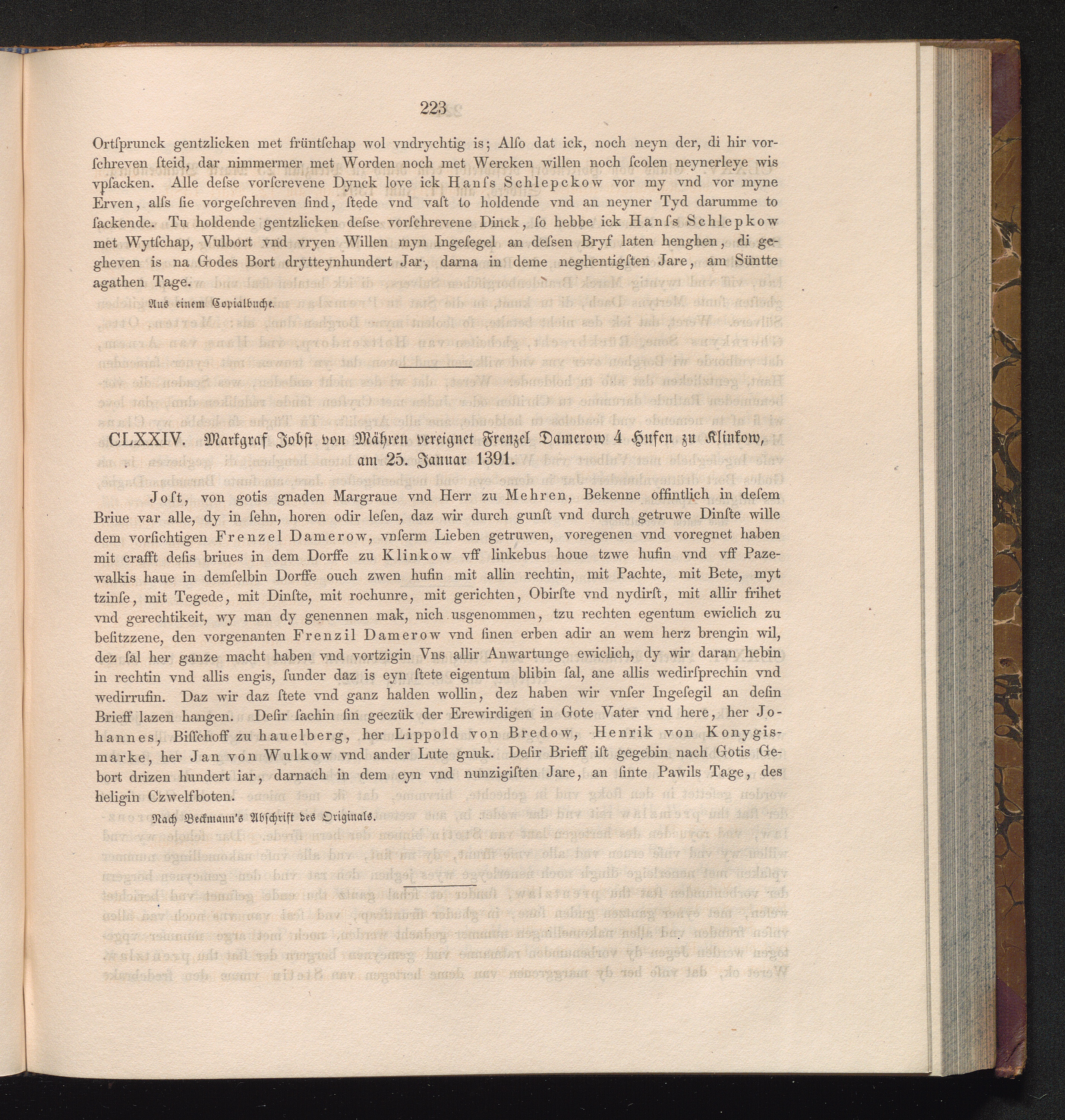 CLXXIV. Markgraf Jobst von Mähren vereignet Frenzel Damerow 4 Hufen zu Klinkow, am[...]