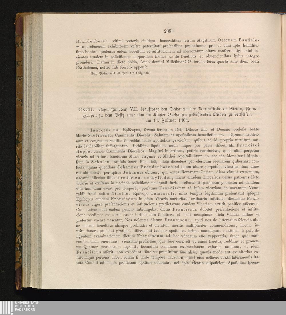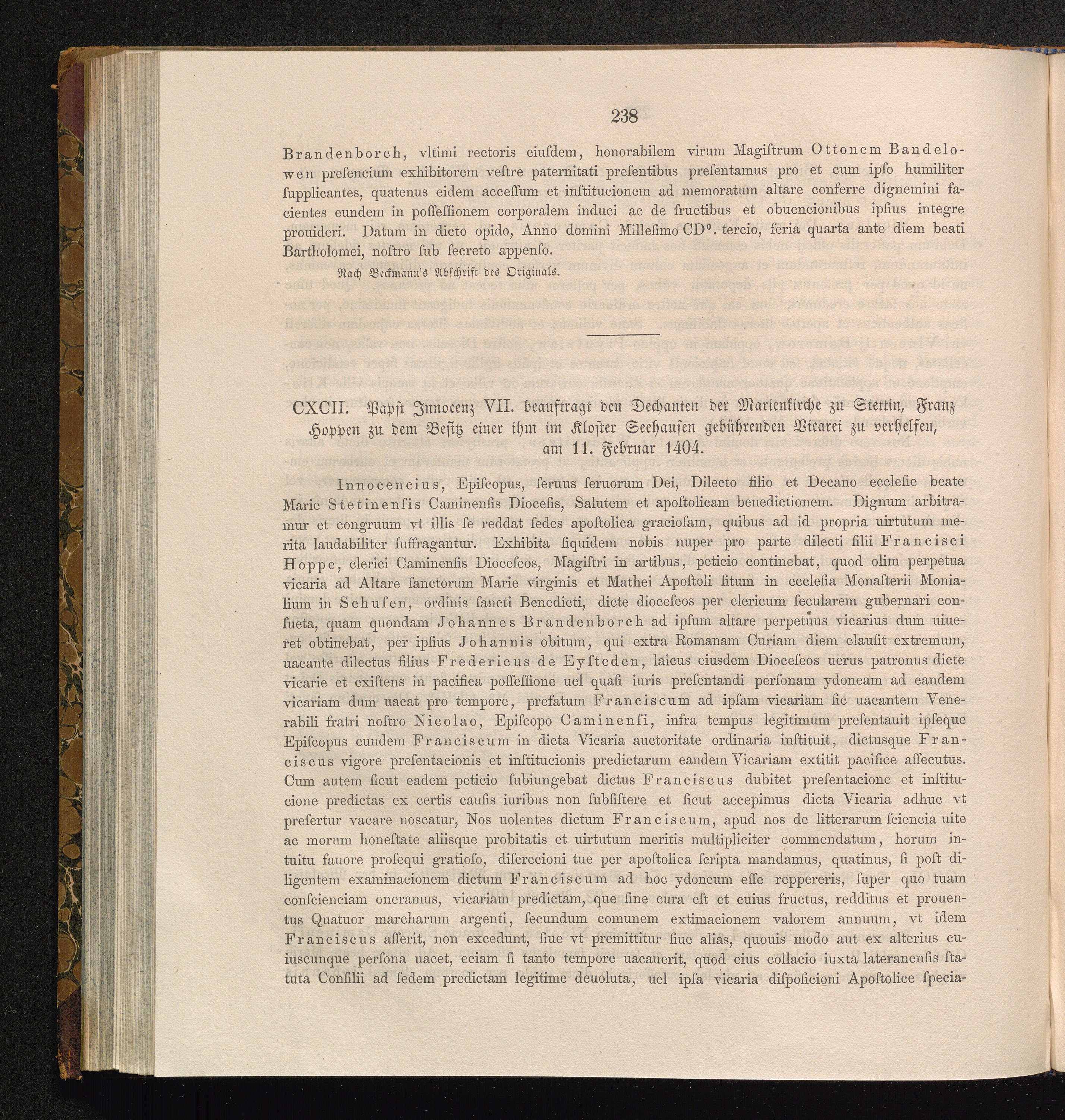 CXCII. Papst Innocenz VII. beauftragt den Dechanten der Marienkirche zu Stettin,[...]