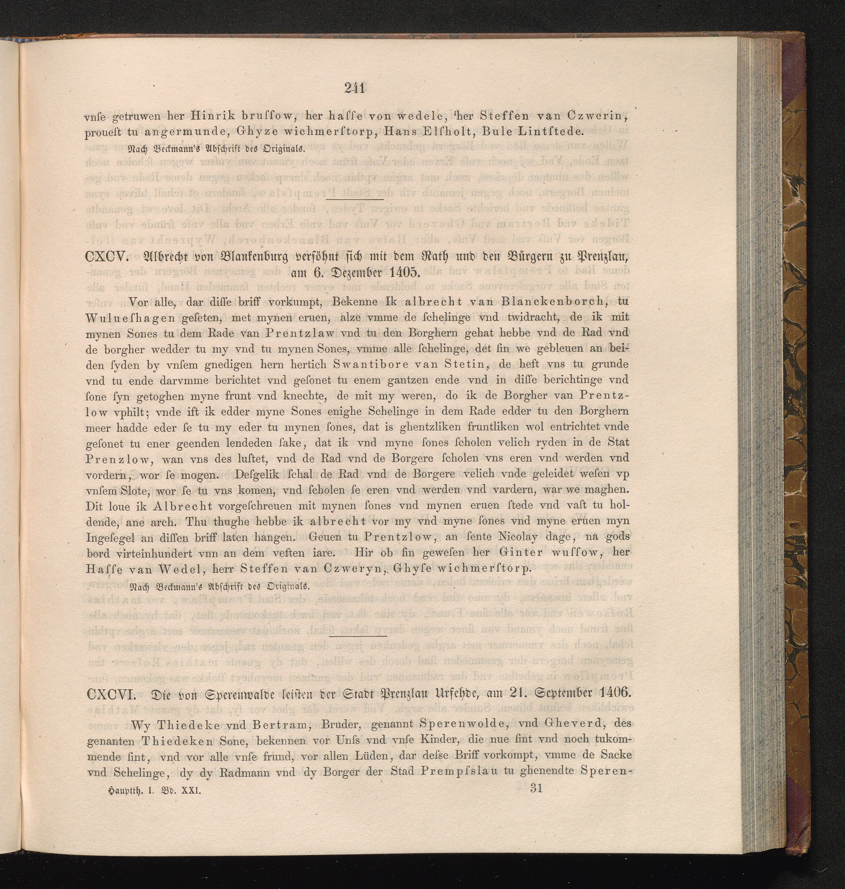 CXCVI. Die von Sperenwalde leisten der Stadt Prenzlau Urfehde, am 21. September [...]