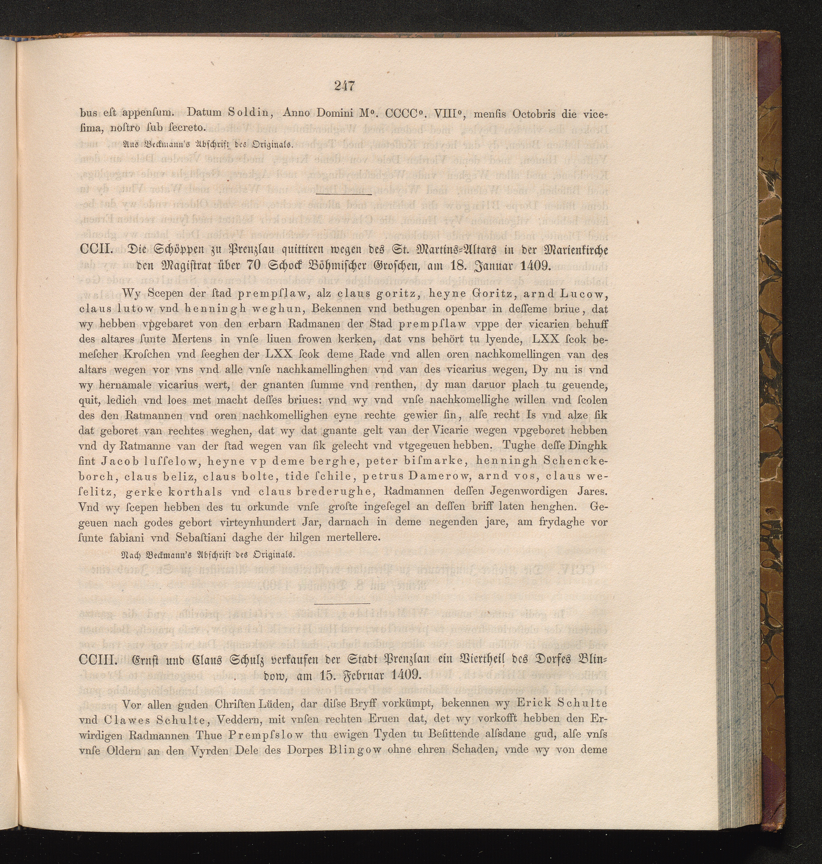 CCIII. Gruft und Claus Schulz verkaufen der Stadt Prenzlau ein Viertheil des Dorfes[...]