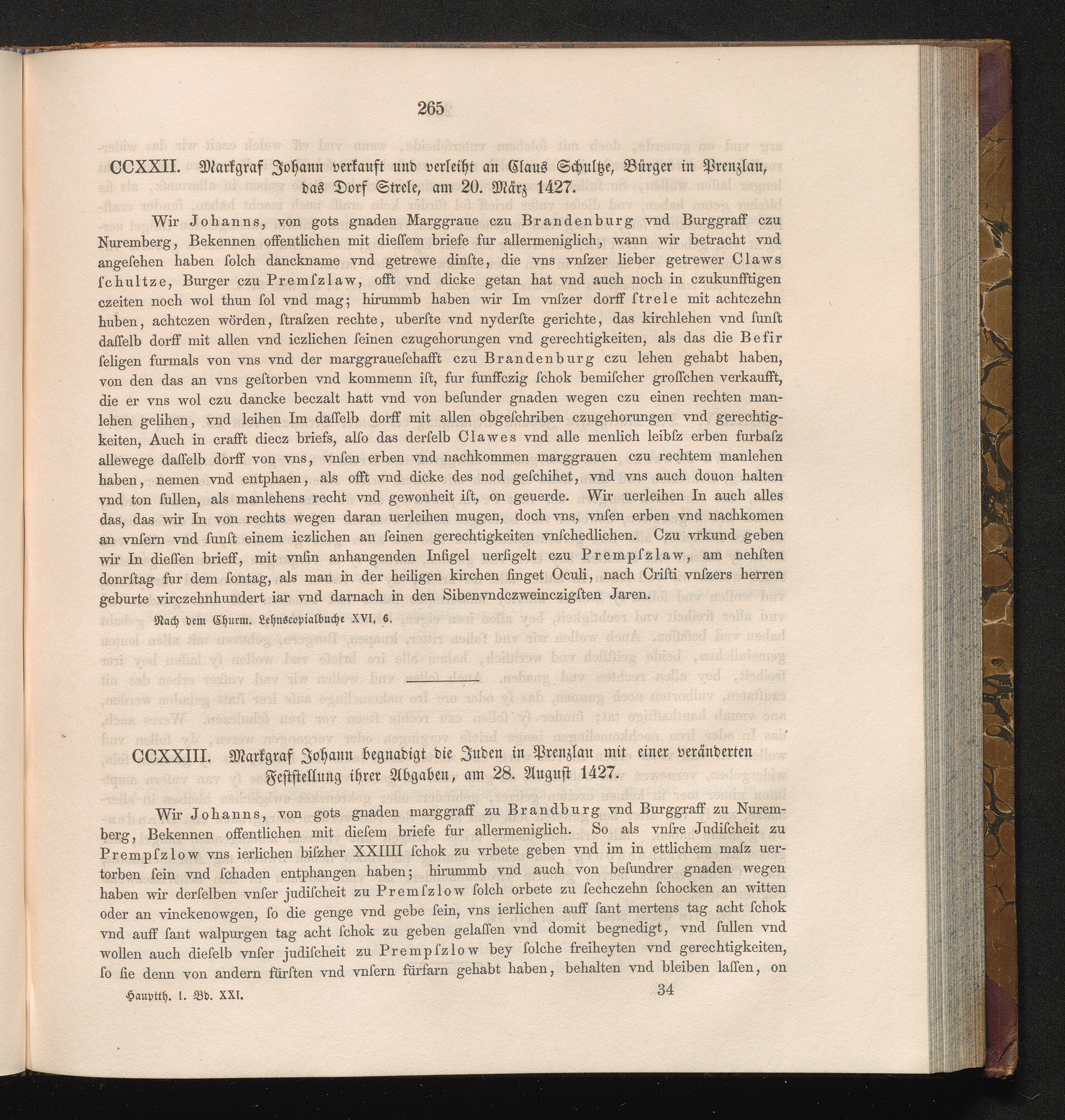 CCXXIII. Markgraf Johann begnadigt die Juden in Prenzlau mit einer veränderten Feststellung[...]