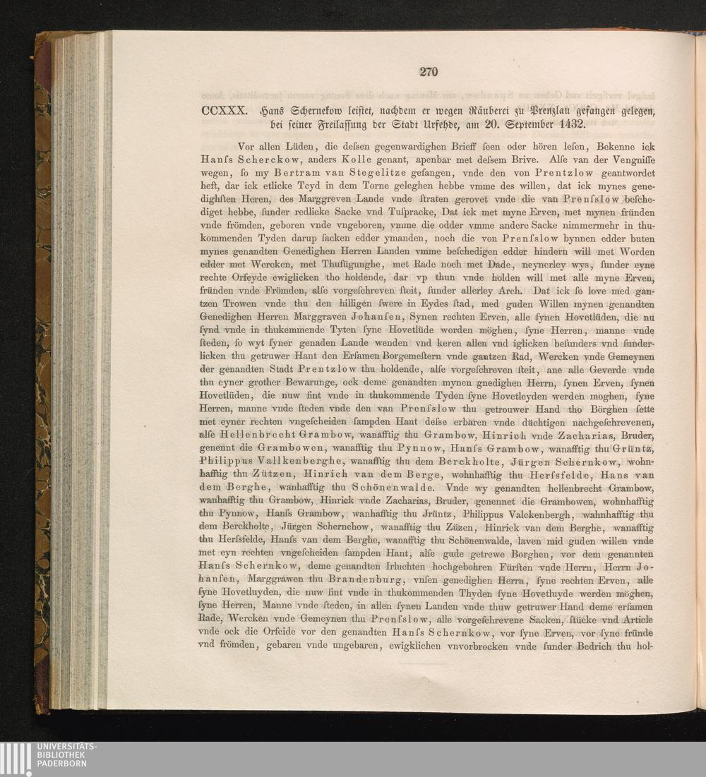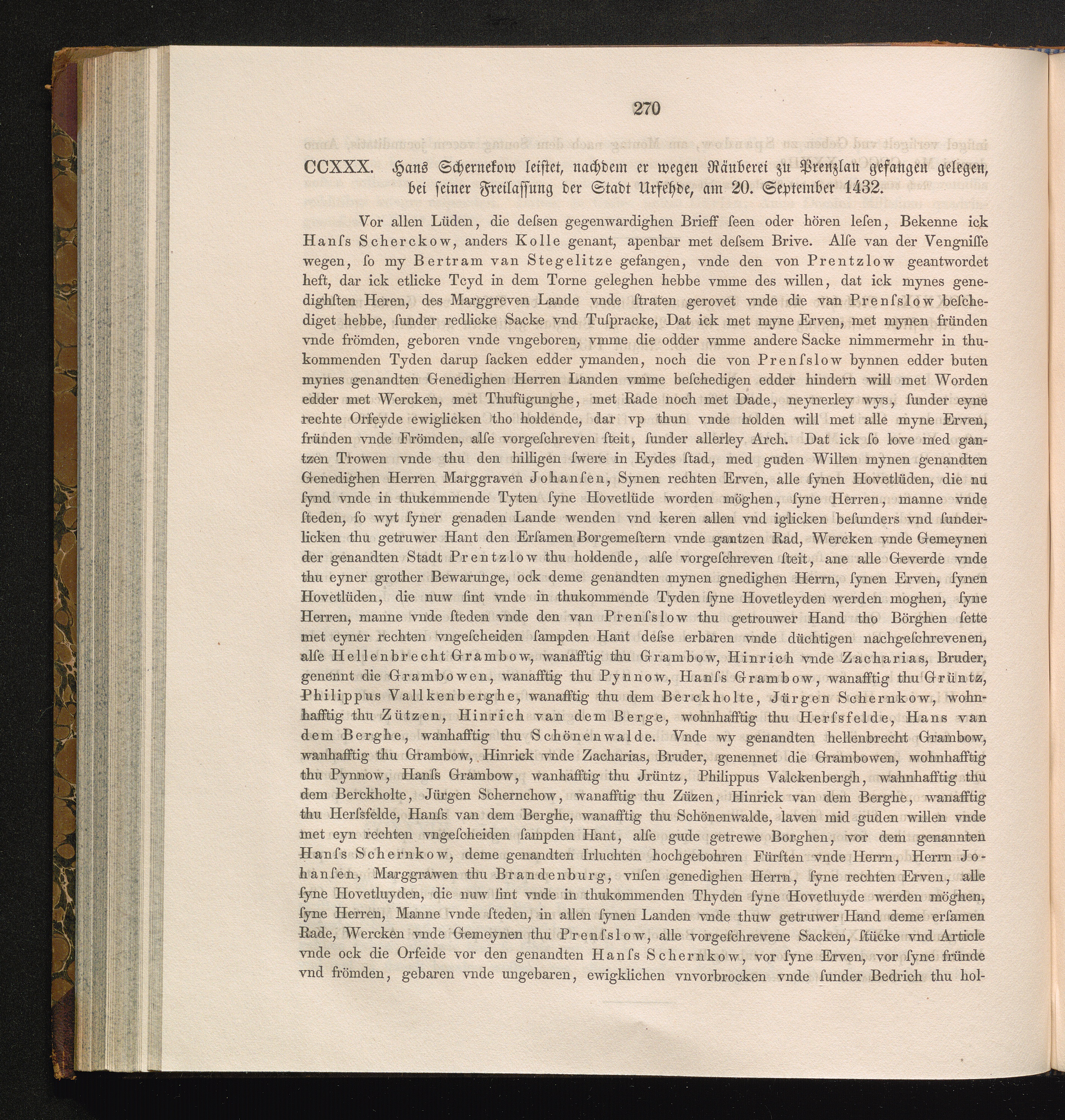 CCXXX. Hans Schernekow leistet, nachdem er wegen Räuberei zu Prenzlau gefangen gelegen,[...]