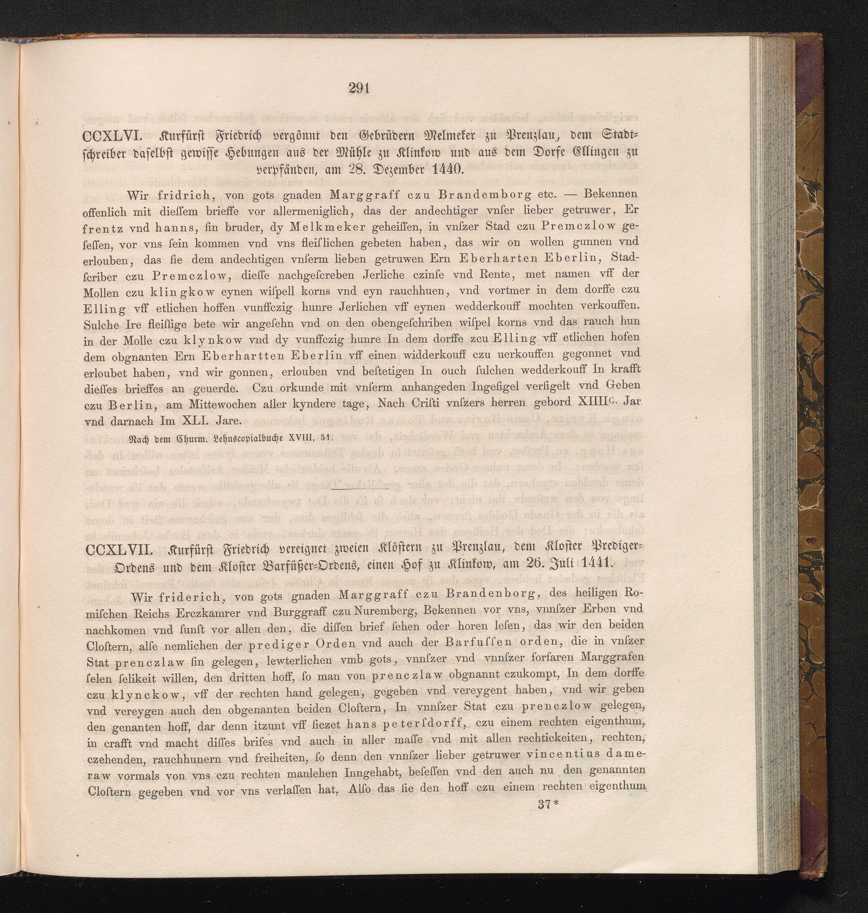 CCXLVII. Kurfürst Friedrich vereignet zweien Klöstern zu Prenzlau, dem Kloster Prediger-Ordens[...]