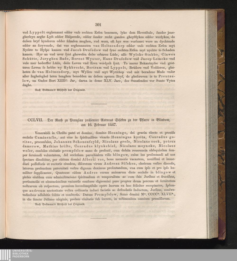 CCLVII. Der Rath zu Prenzlau präsentirt Andreas Siseken zu der Pfarre in Blindow,[...]