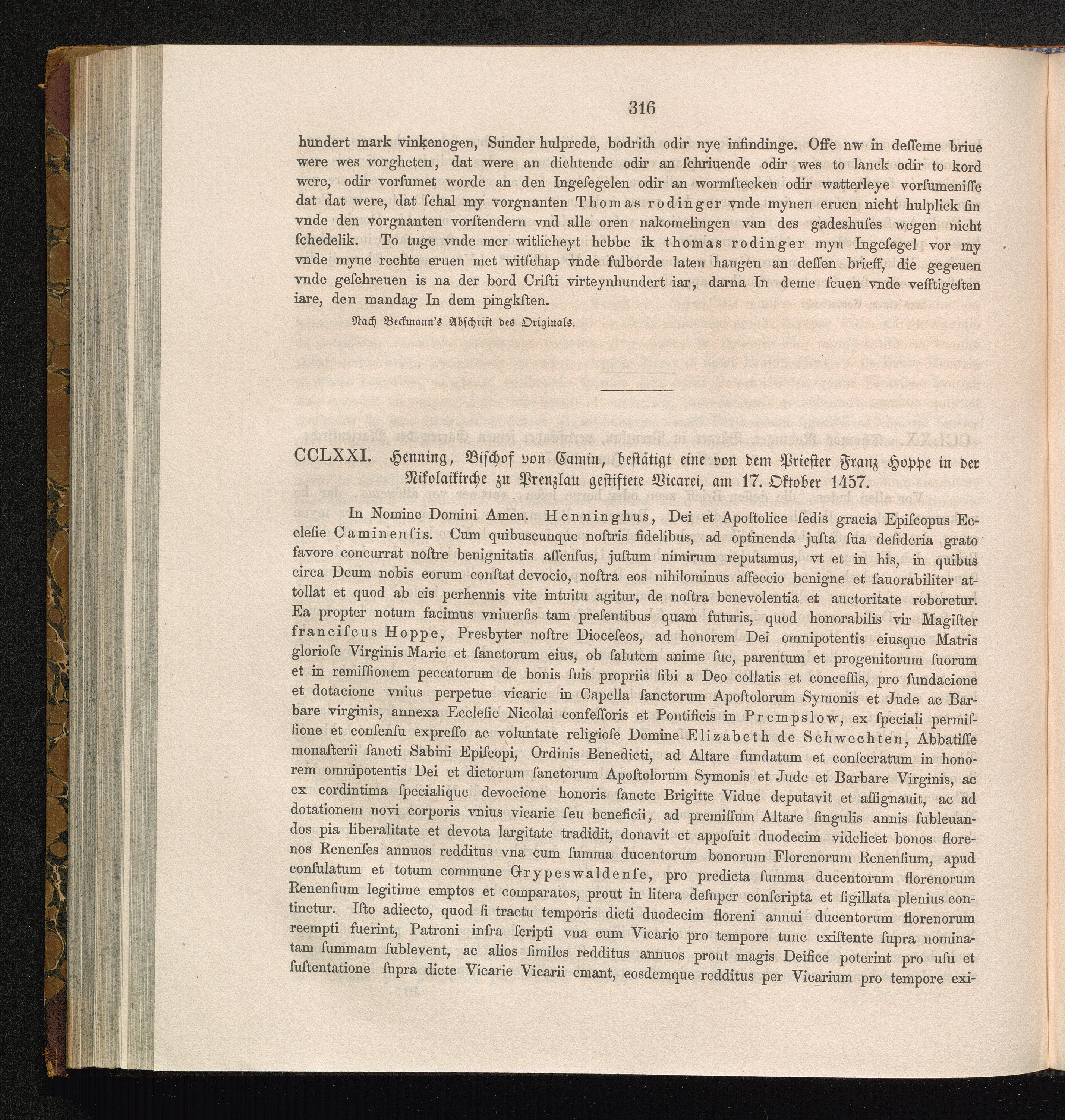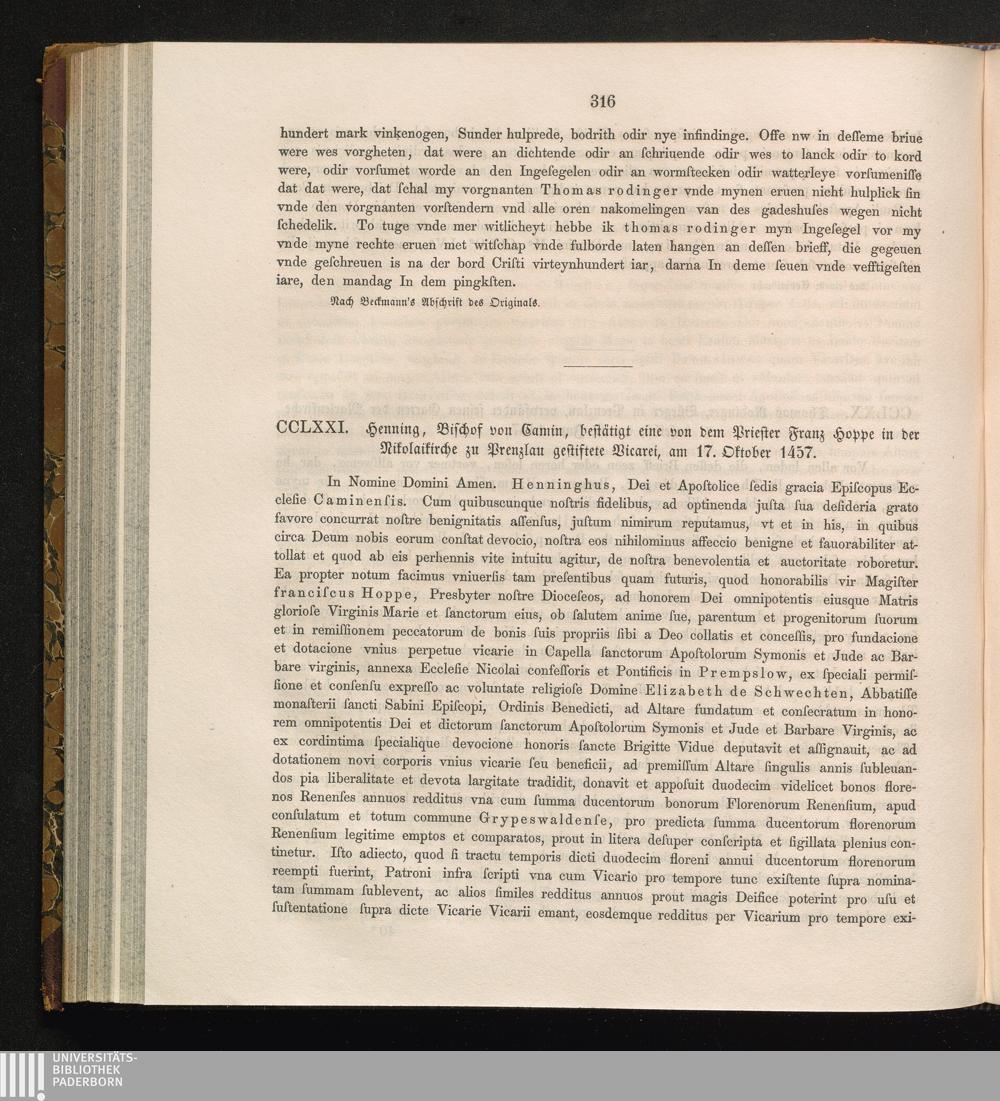 CCLXXI. Henning, Bischof von Camin, bestätigt eine von dem Priester Franz Hoppe in[...]