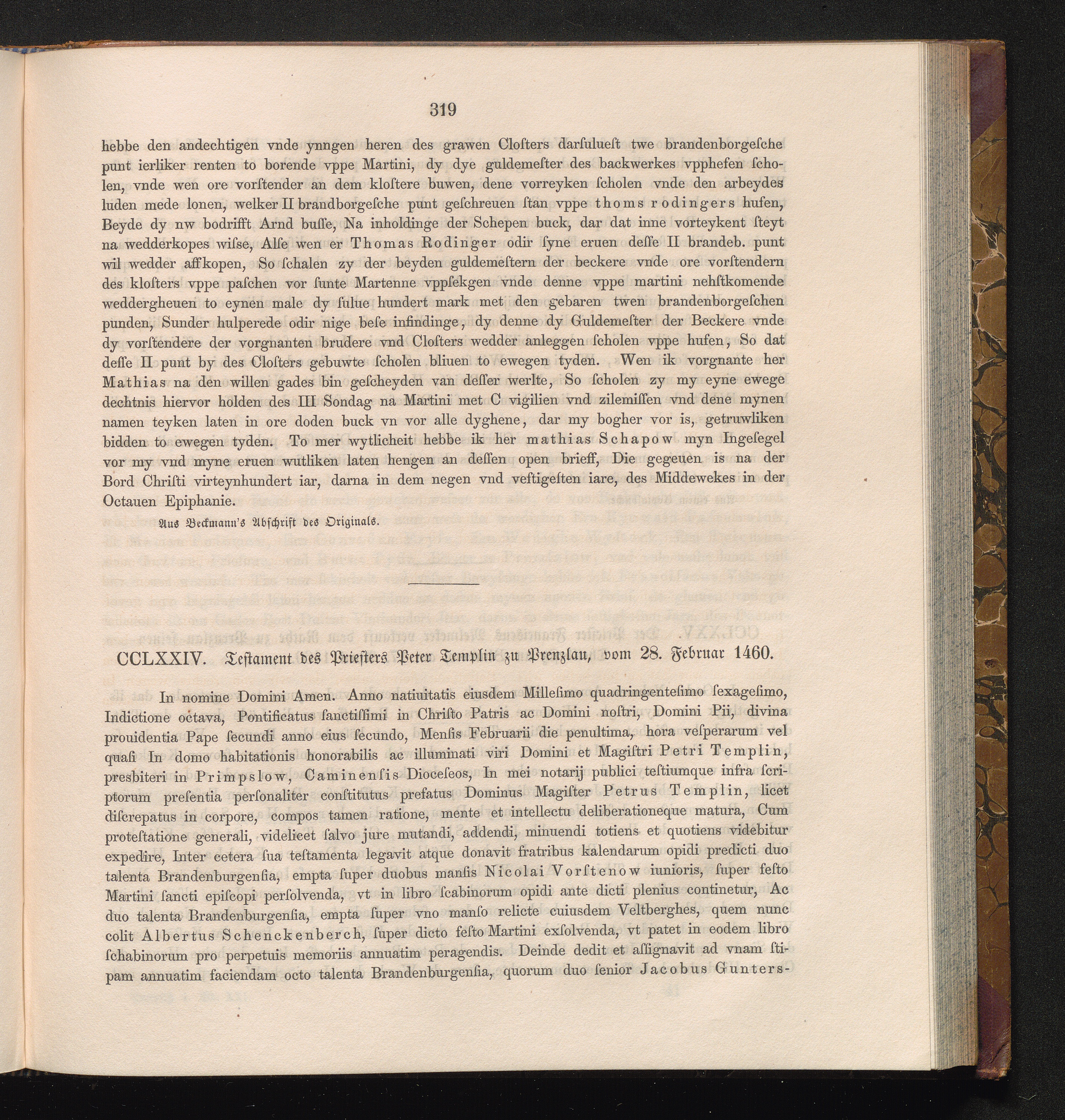 CCLXXIV. Testament des Priesters Peter Templin zu Prenzlau, vom 28. Februar 1460[...]