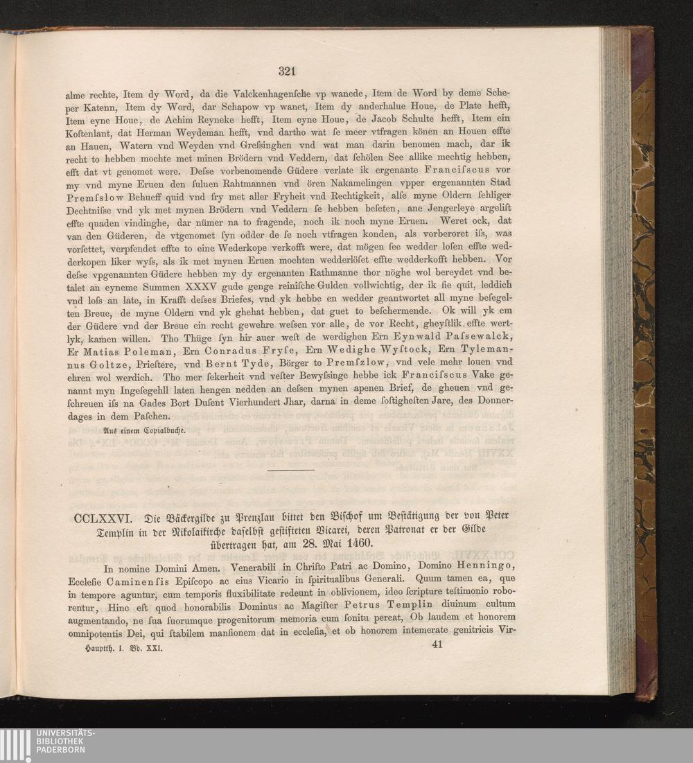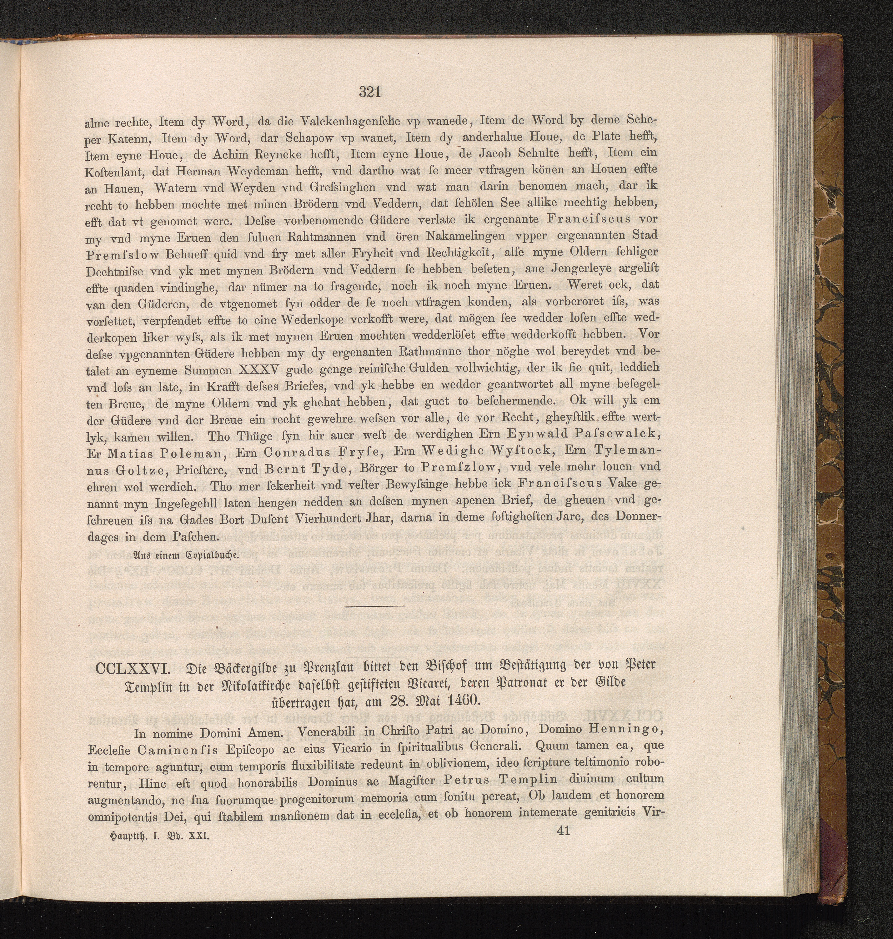 CCLXXVI. Die Bäckergilde zu Prenzlau bittet den Bischof um Bestätigung der von Peter[...]