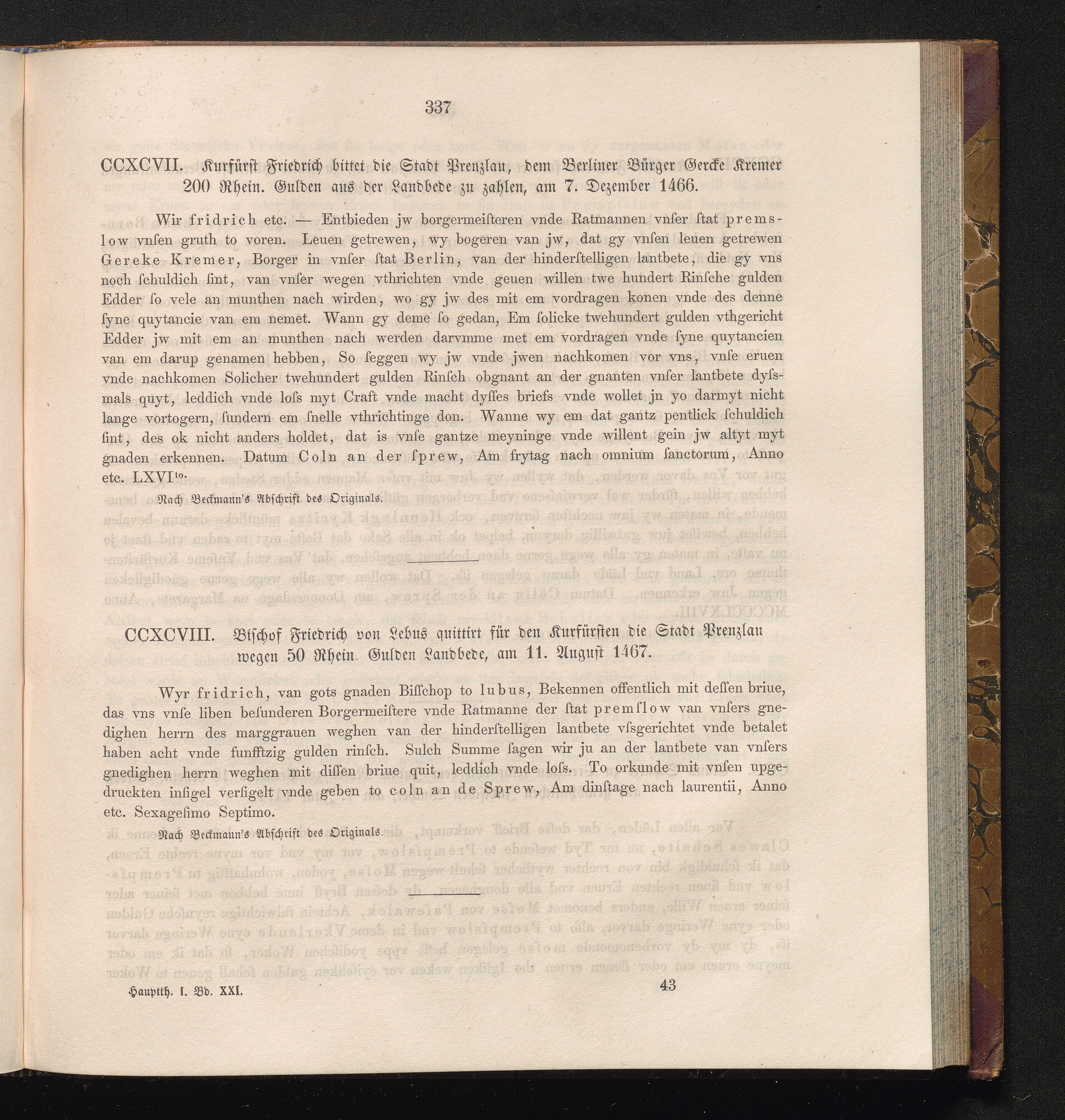 CCXCVIII. Bischof Friedrich von Lebus quittirt für den Kurfürsten die Stadt Prenzlau[...]