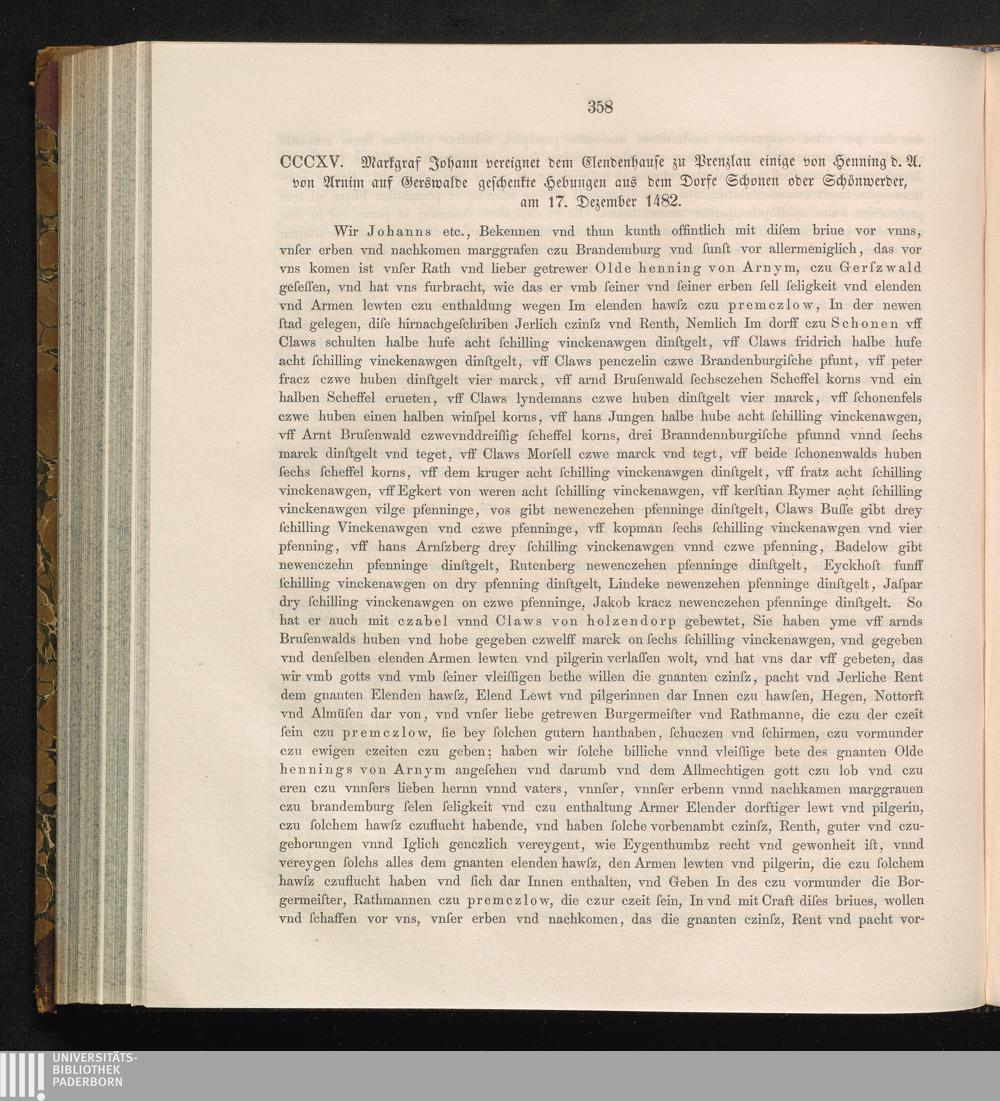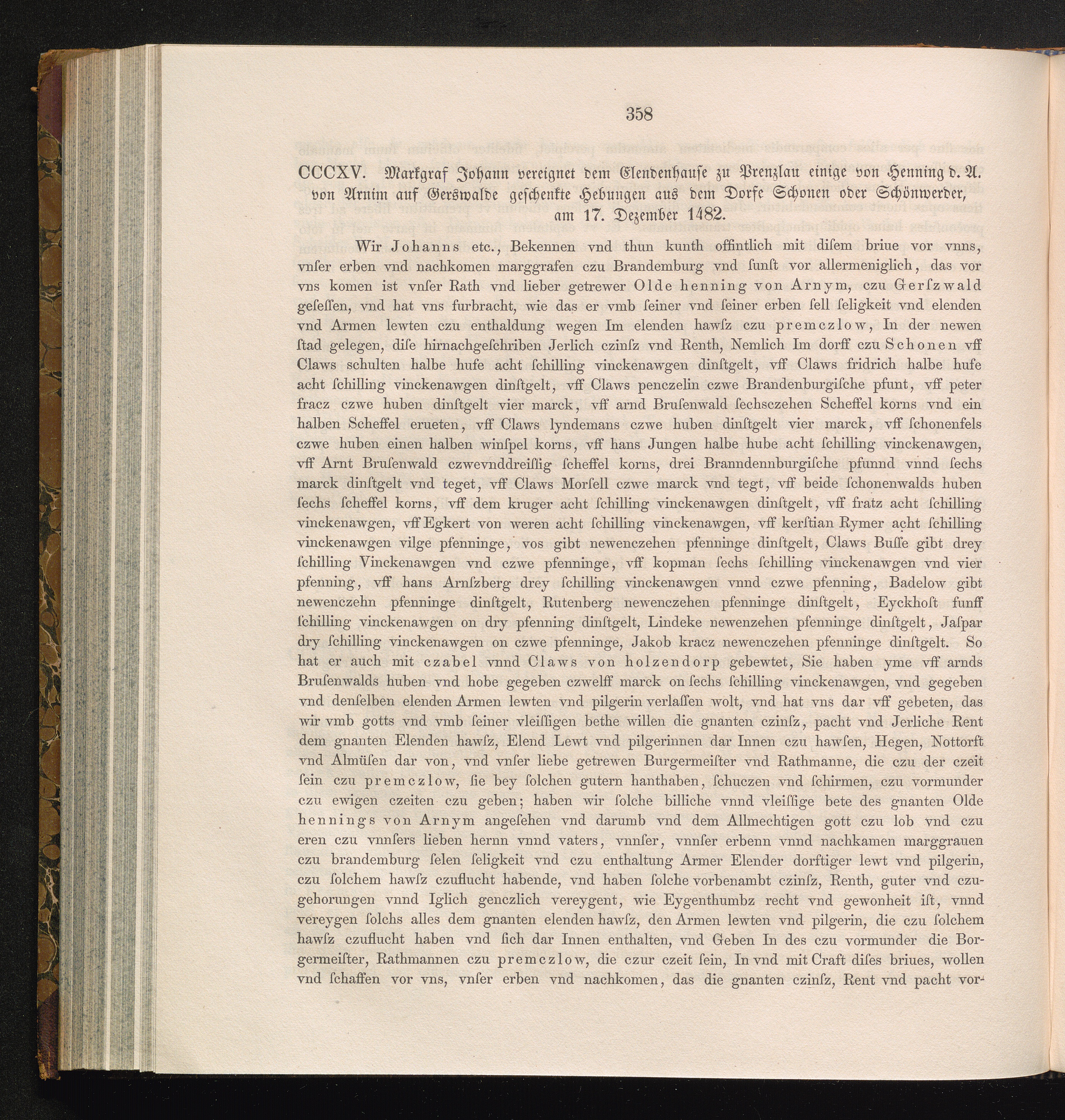 CCCXV. Markgraf Johann vereignet dem Elendenhause zu Prenzlau einige von Henning[...]