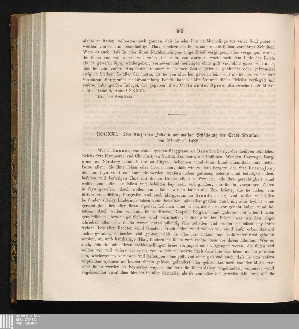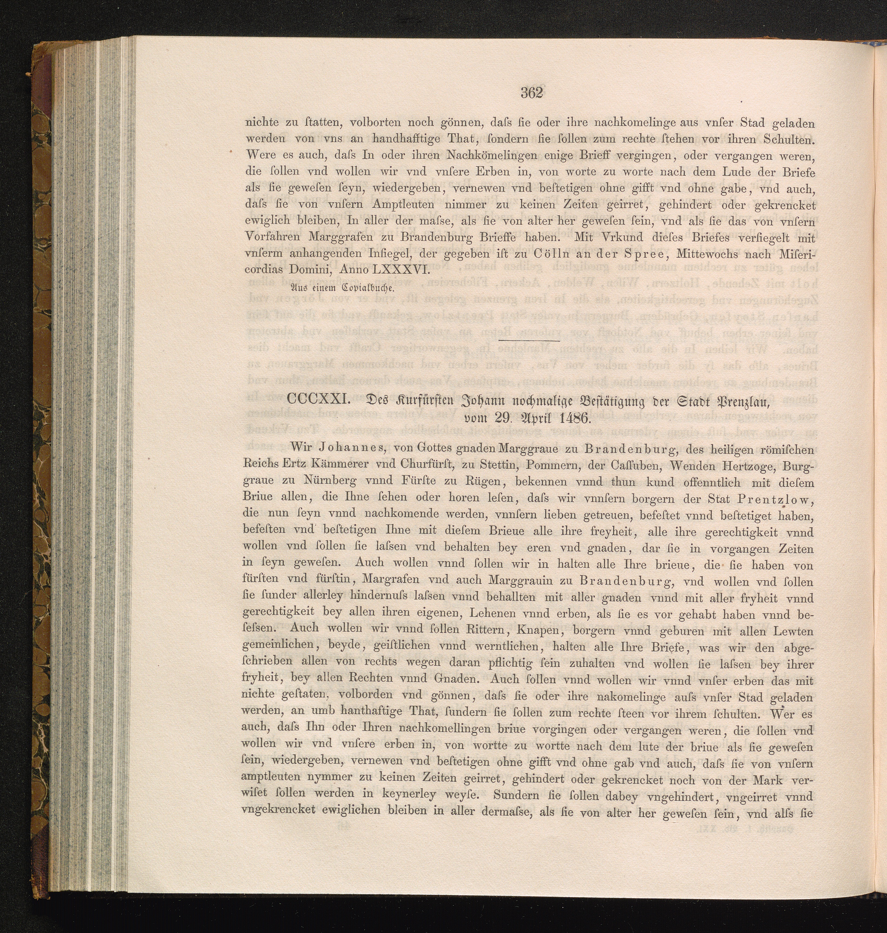 CCCXXI. Des Kurfürsten Johann nochmalige Bestätigung der Stadt Prenzlau, vom 29.[...]