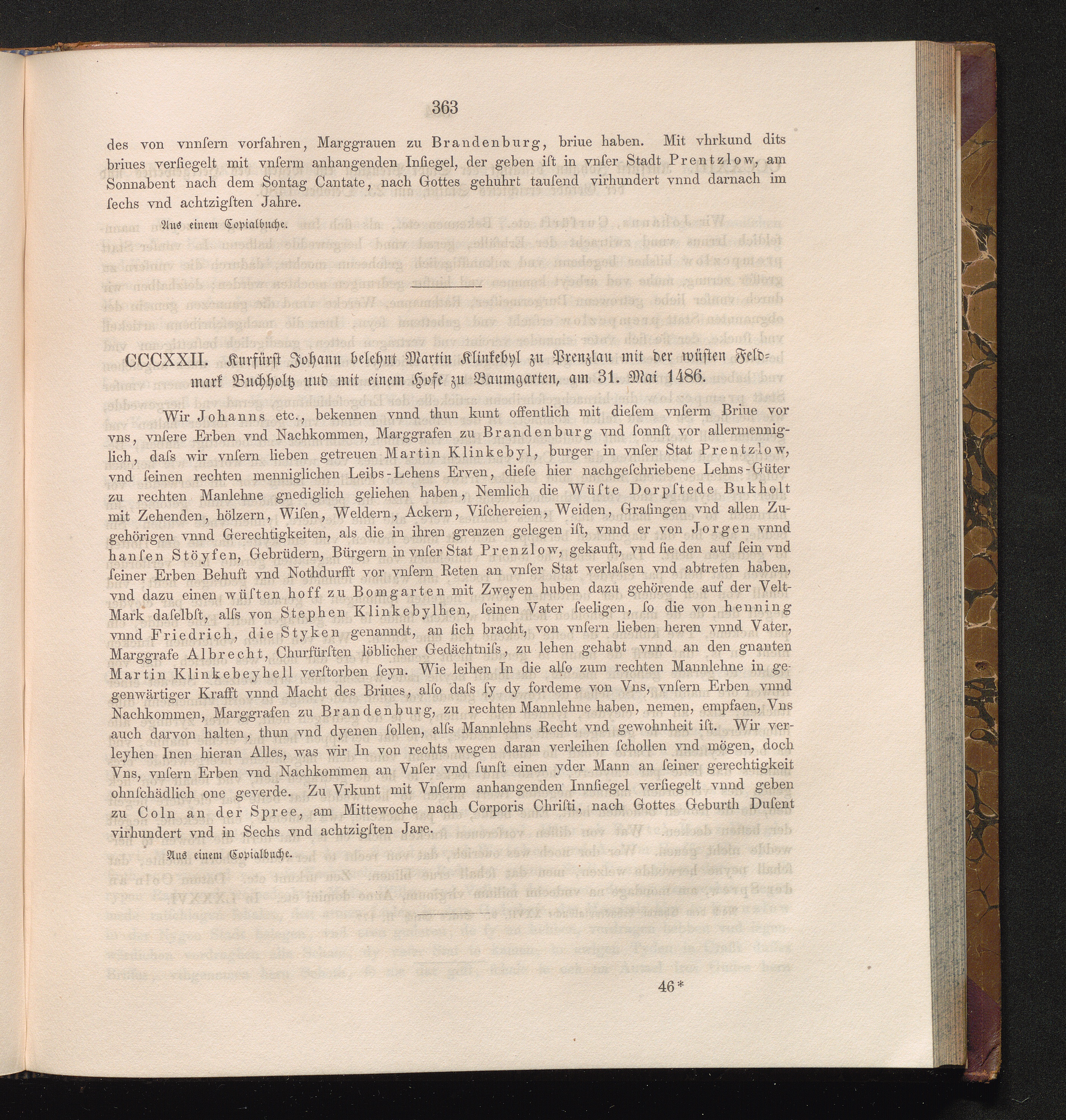 CCCXXII. Kurfürst Johann belehnt Martin Klinkebyl zu Prenzlau mit der wüsten Feldmark[...]