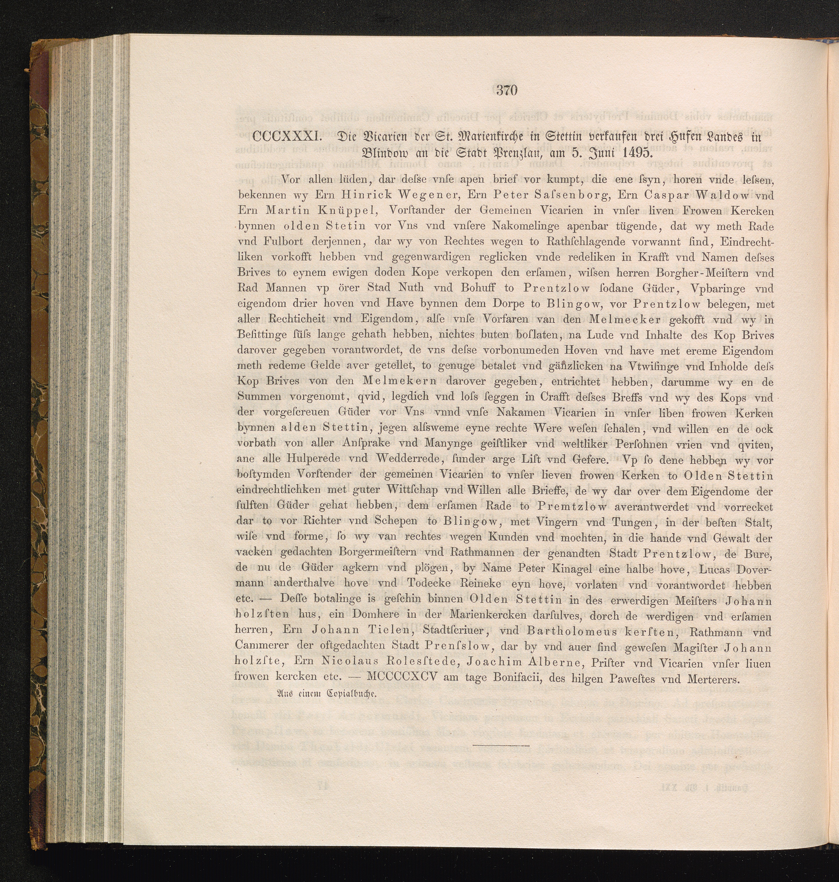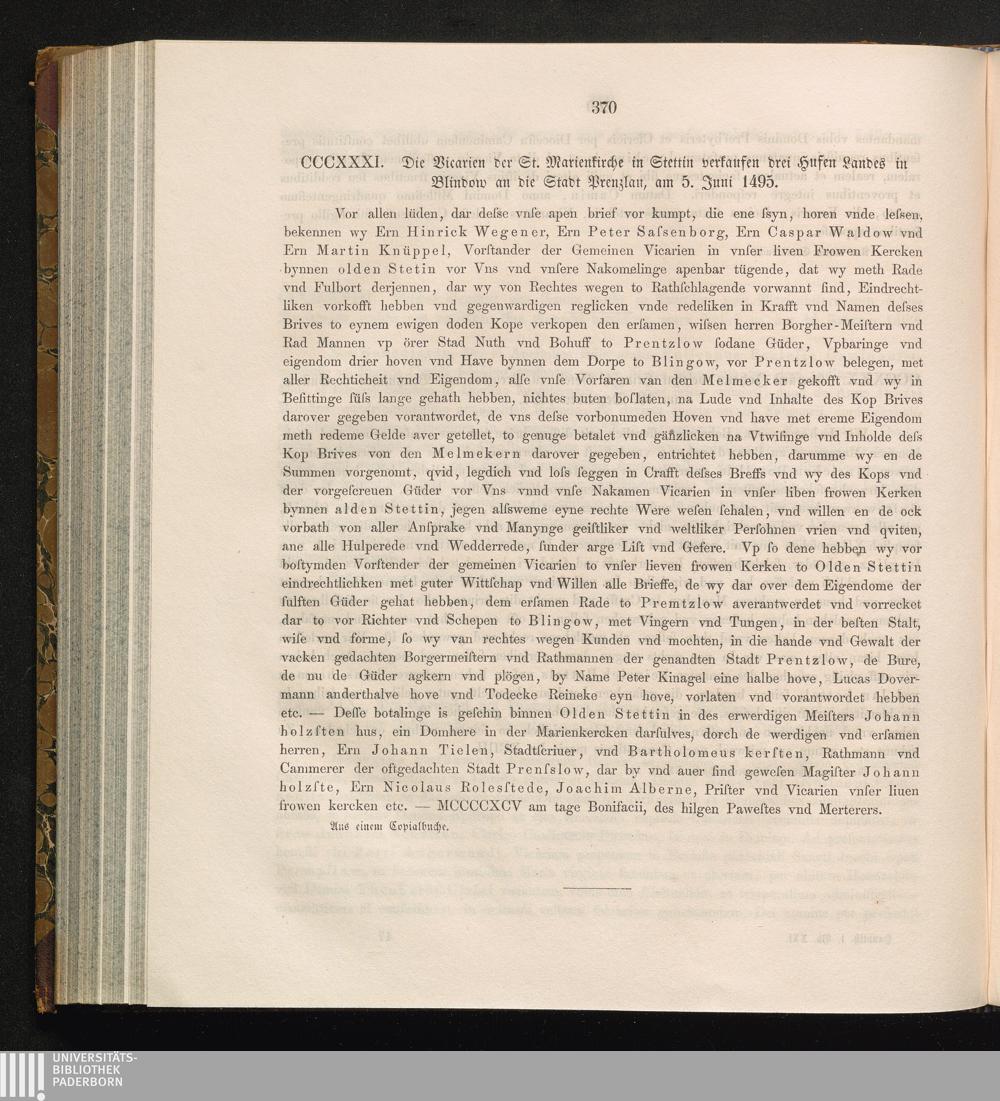 CCCXXXI. Die Vicarien der St. Marienkirche in Stettin verkaufen drei Hufen Landes[...]