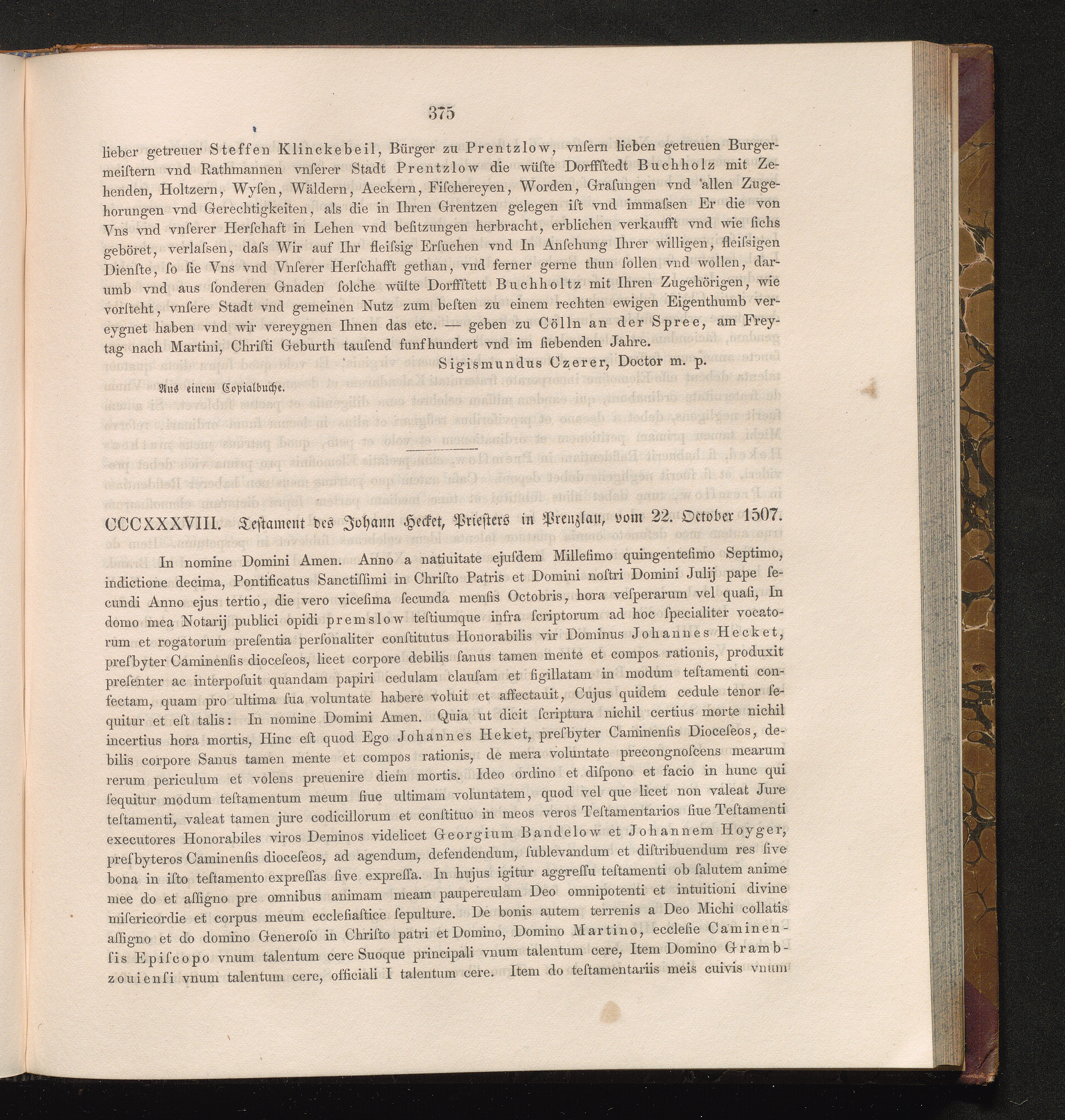 CCCXXXVIII. Testament des Johann Hecket, Priesters in Prenzlau, vom 22. October [...]
