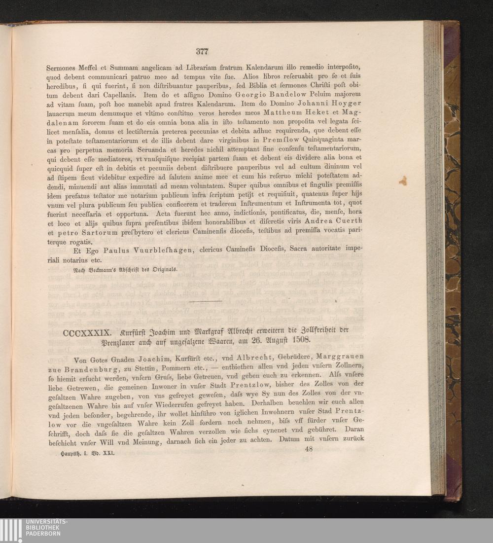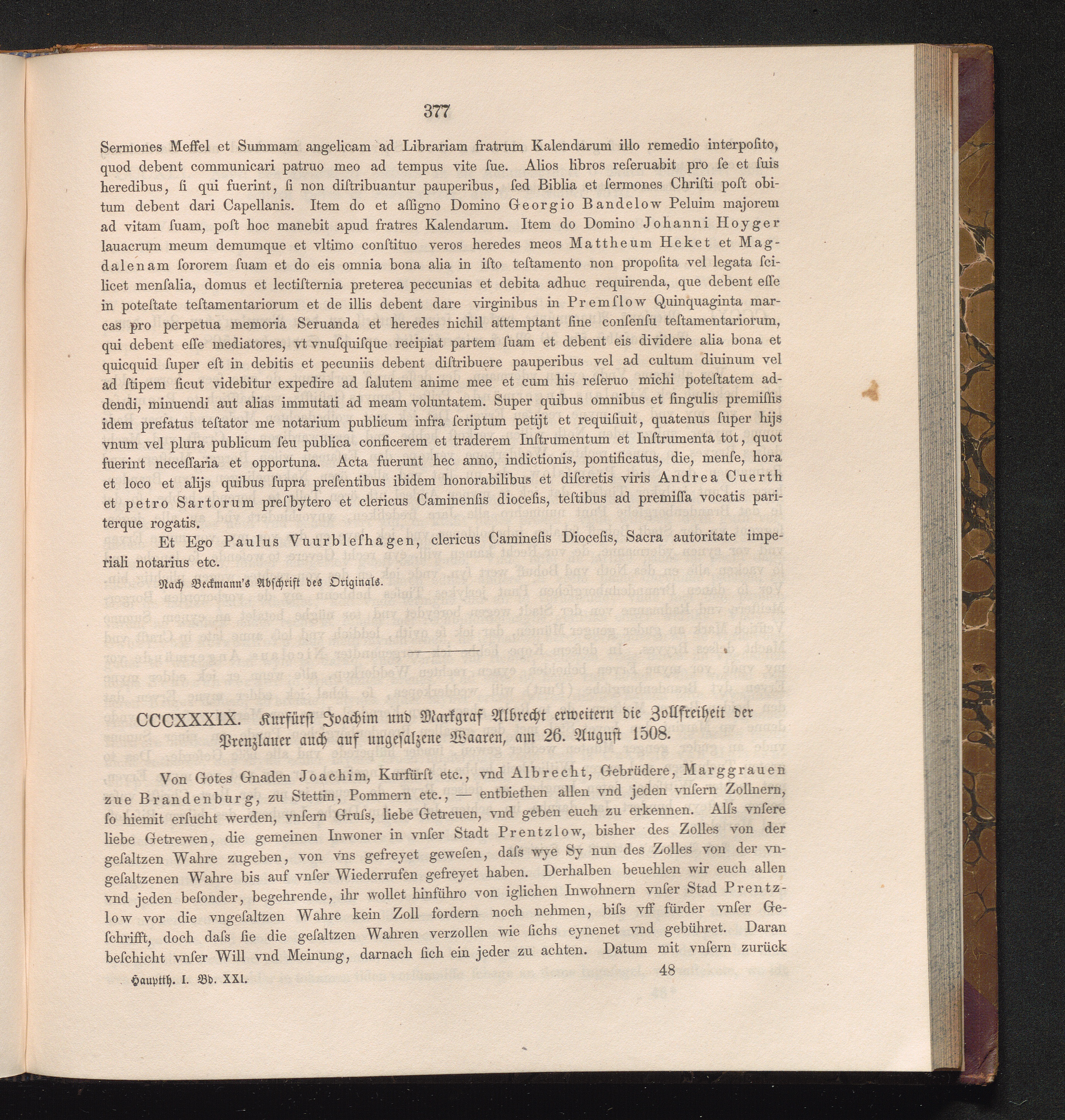 CCCXXXIX. Kurfürst Joachim und Markgraf Albrecht erweitern die Zollfreiheit der Prenzlauer[...]