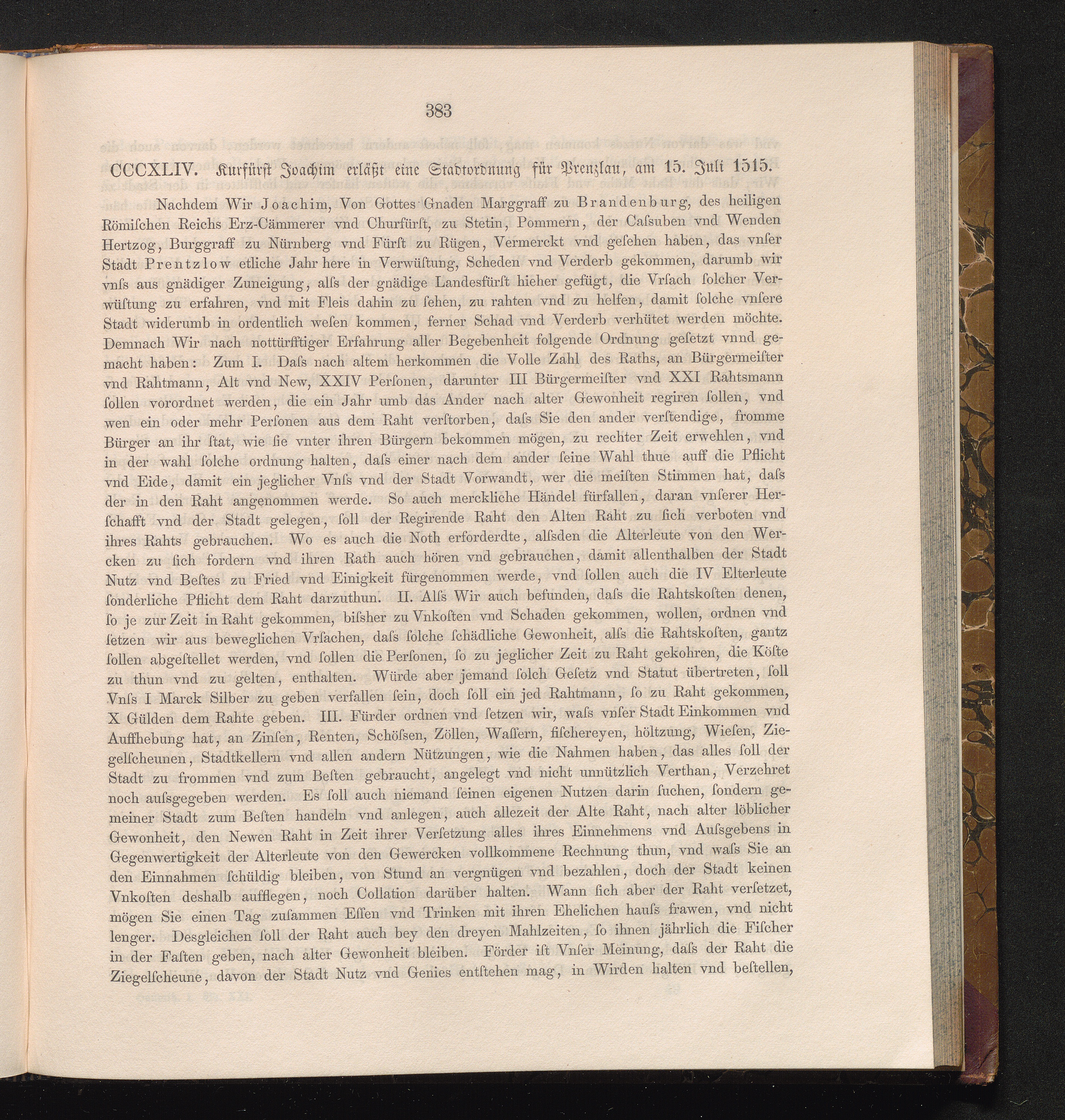 CCCXLIV. Kurfürst Joachim erläßt eine Stadtordnung für Prenzlau, am 15. Juli 151[...]