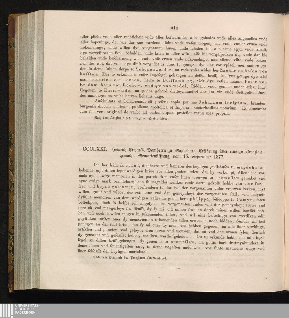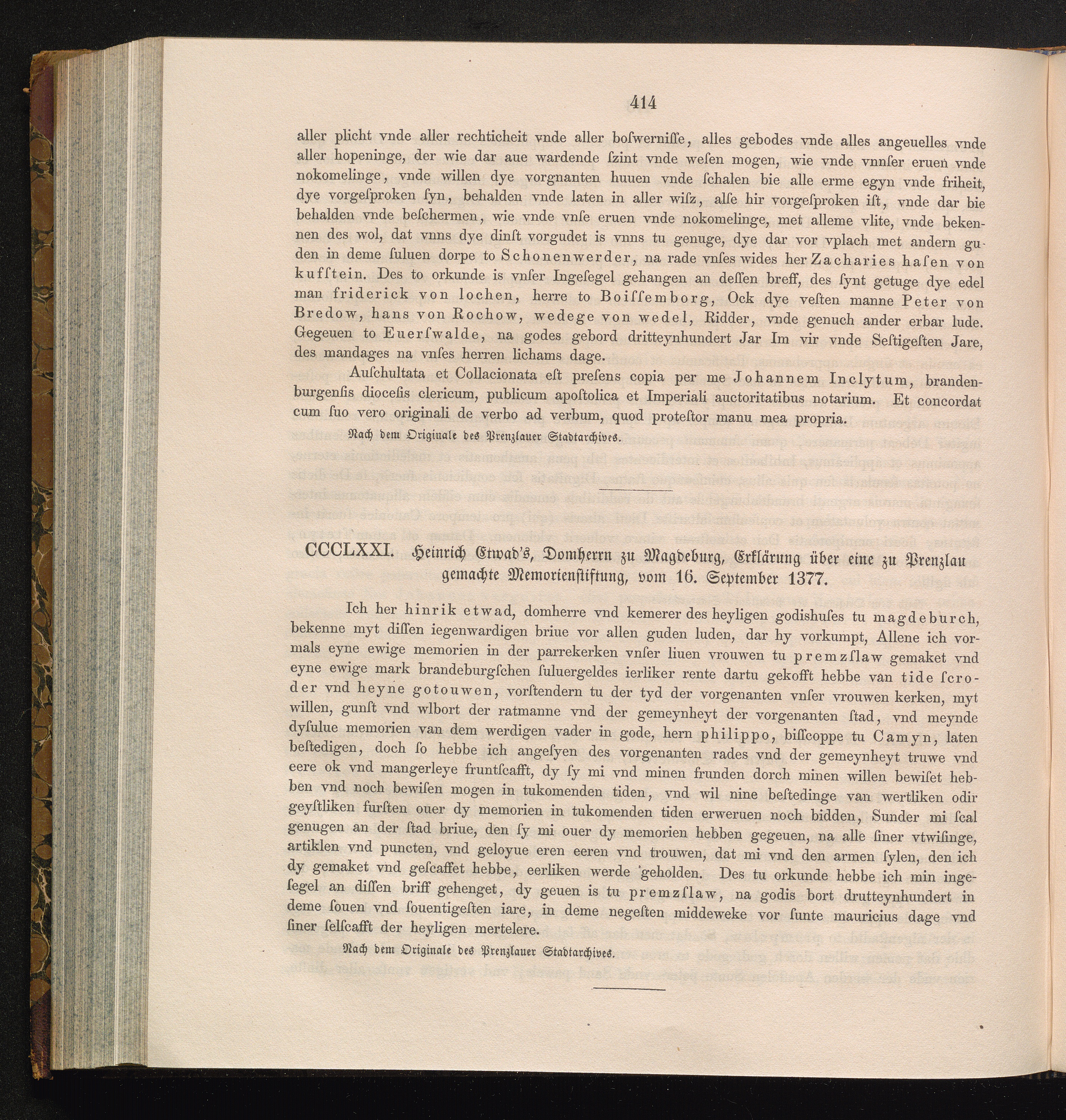 CCCLXXI. Heinrich Etwad´s, Domherrn zu Magdeburg, Erklärung über eine zu Prenzlau[...]
