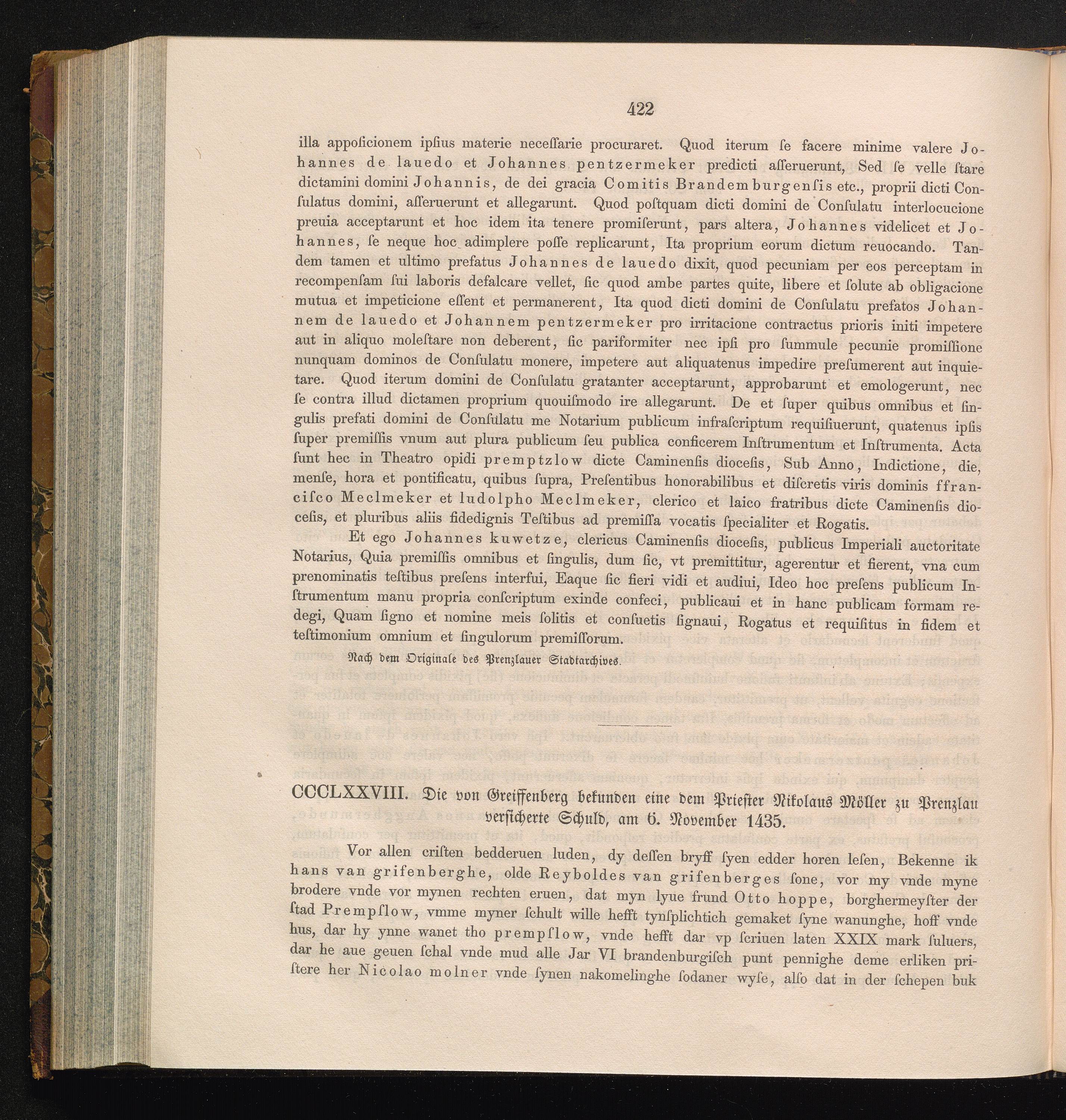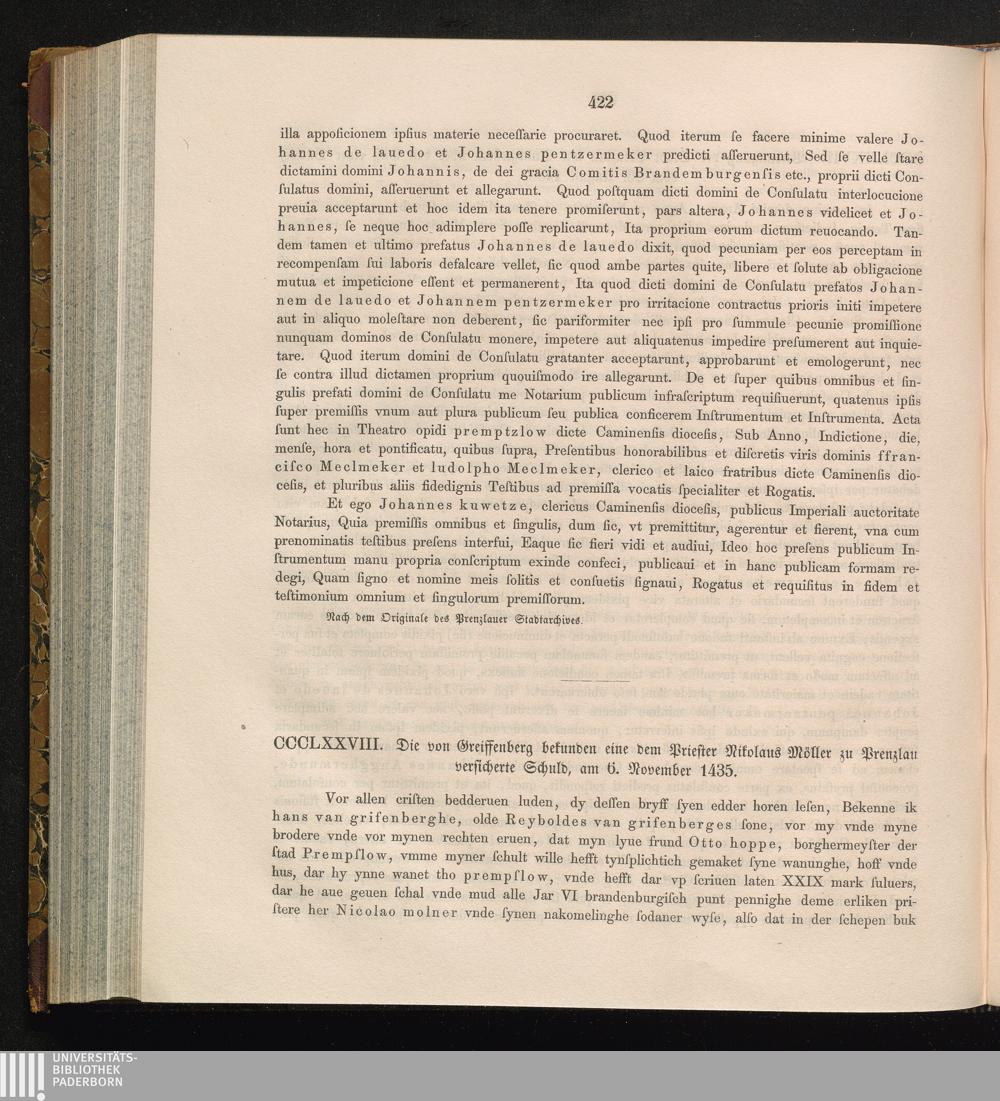 CCCLXXVIII. Die von Greiffenberg bekunden eine dem Priester Nikolaus Möller zu Prenzlau[...]