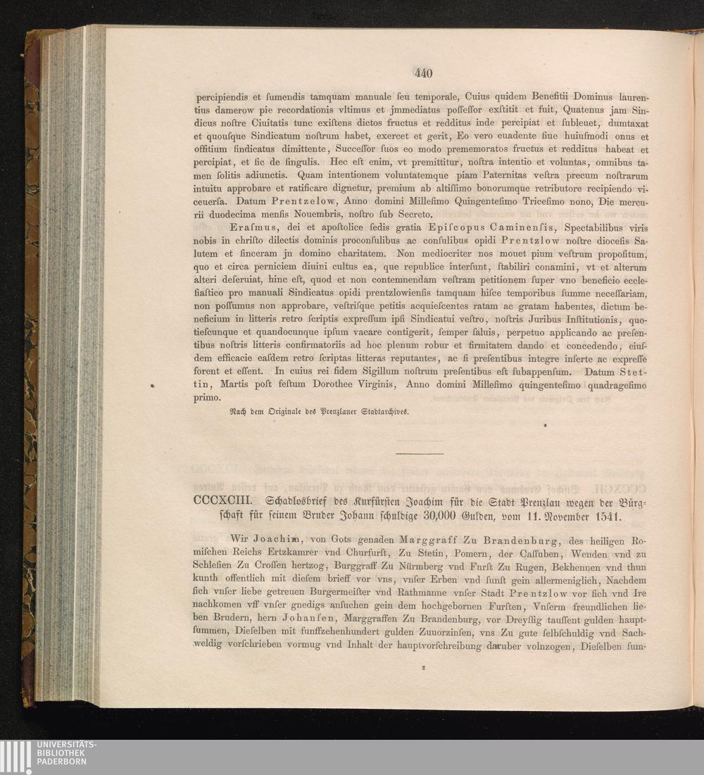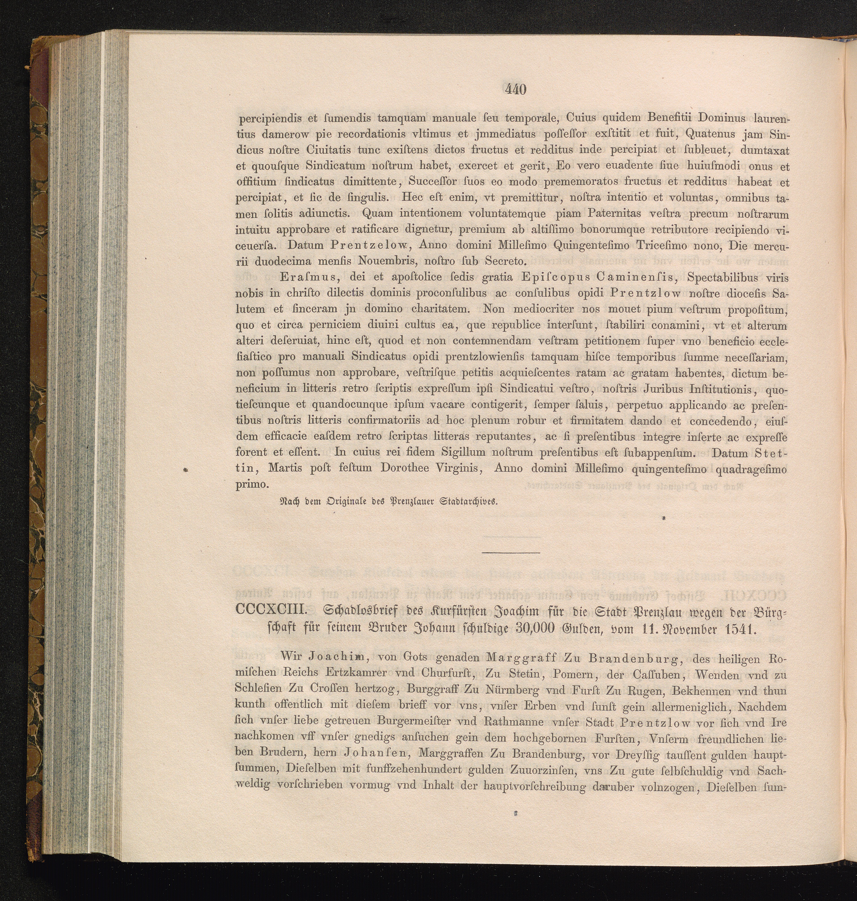 CCCXCIII. Schadlosbrief des Kurfürsten Joachim für die Stadt Prenzlau wegen der Bürgschaft[...]
