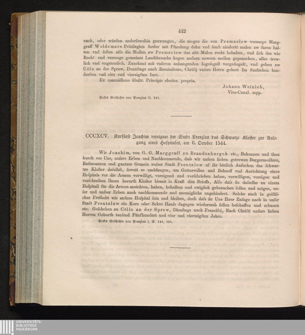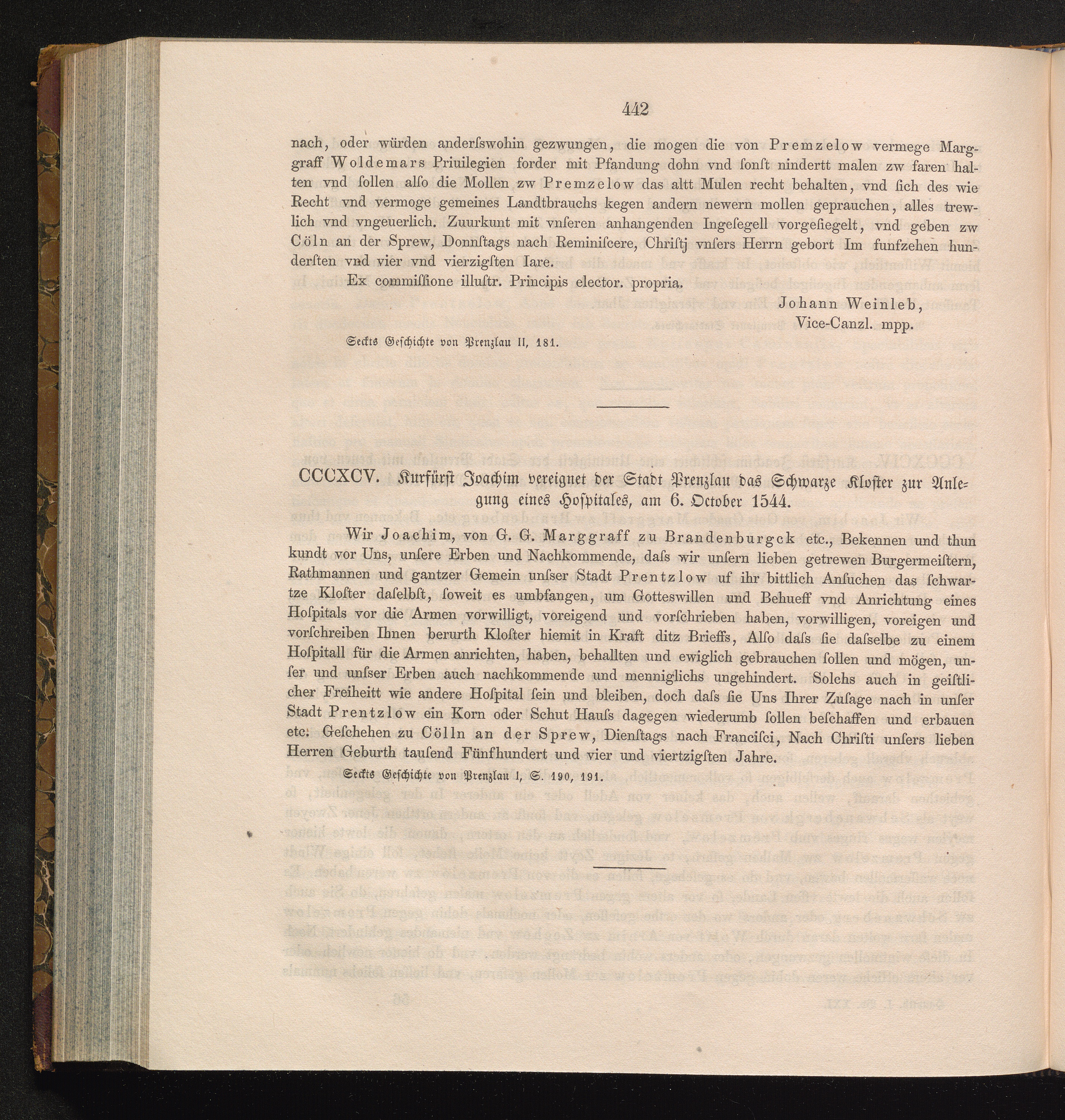 CCCXCV. Kurfürst Joachim vereignet der Stadt Prenzlau das Schwarze Kloster zur Anlegung[...]