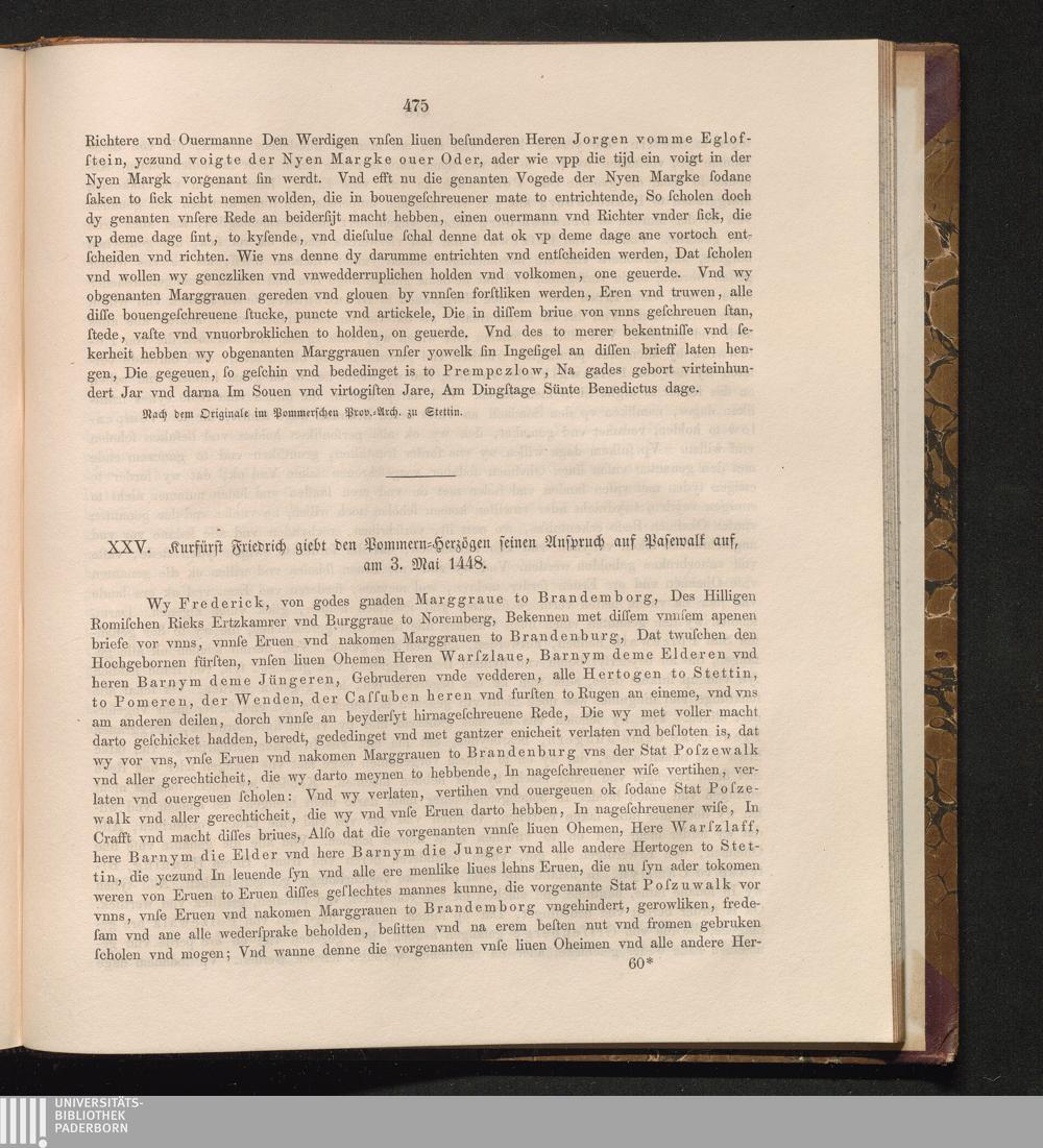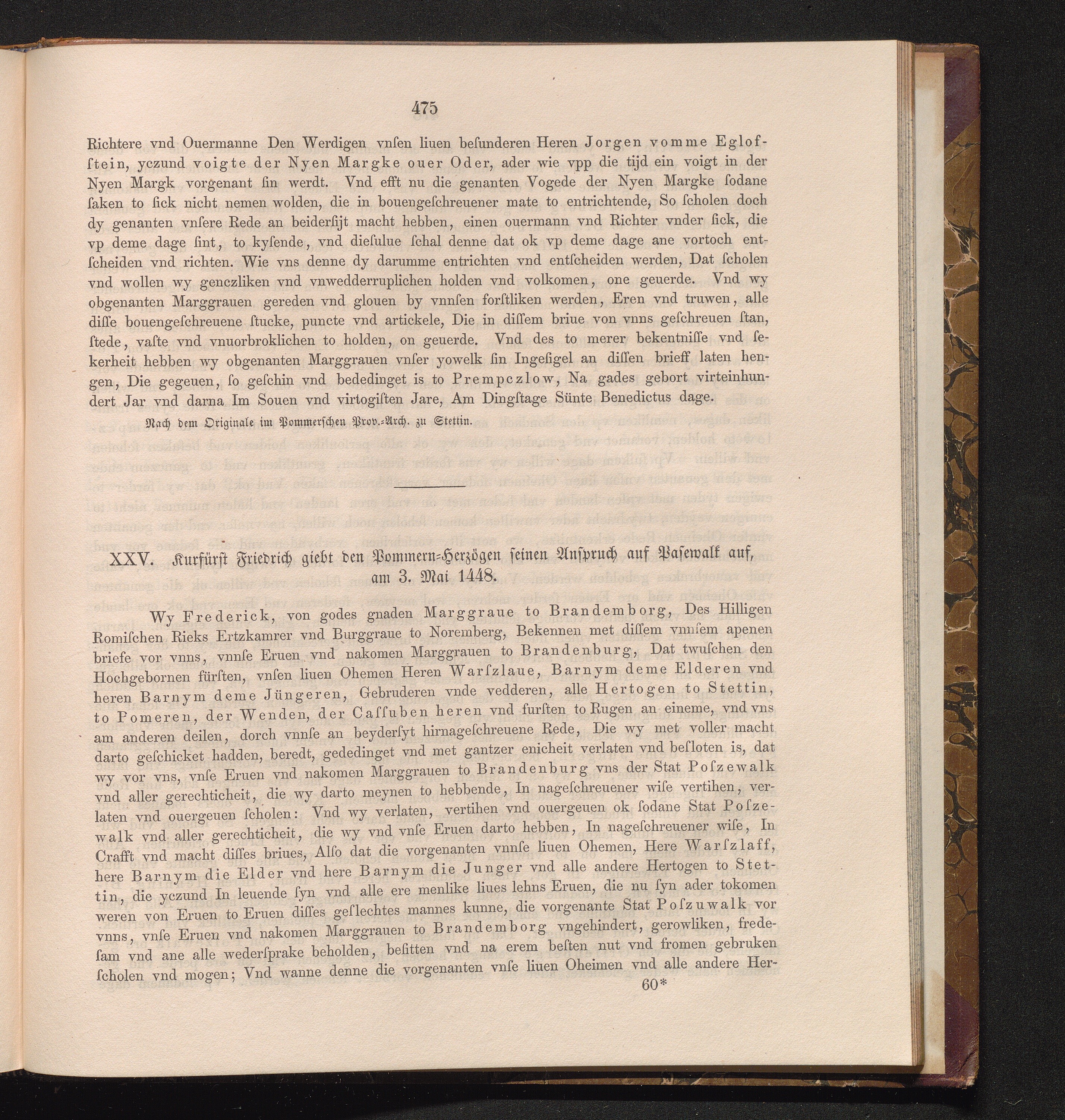 XXV. Kurfürst Friedrich giebt den Pommern-Herzögen seinen Anspruch auf Pasewalk auf,[...]
