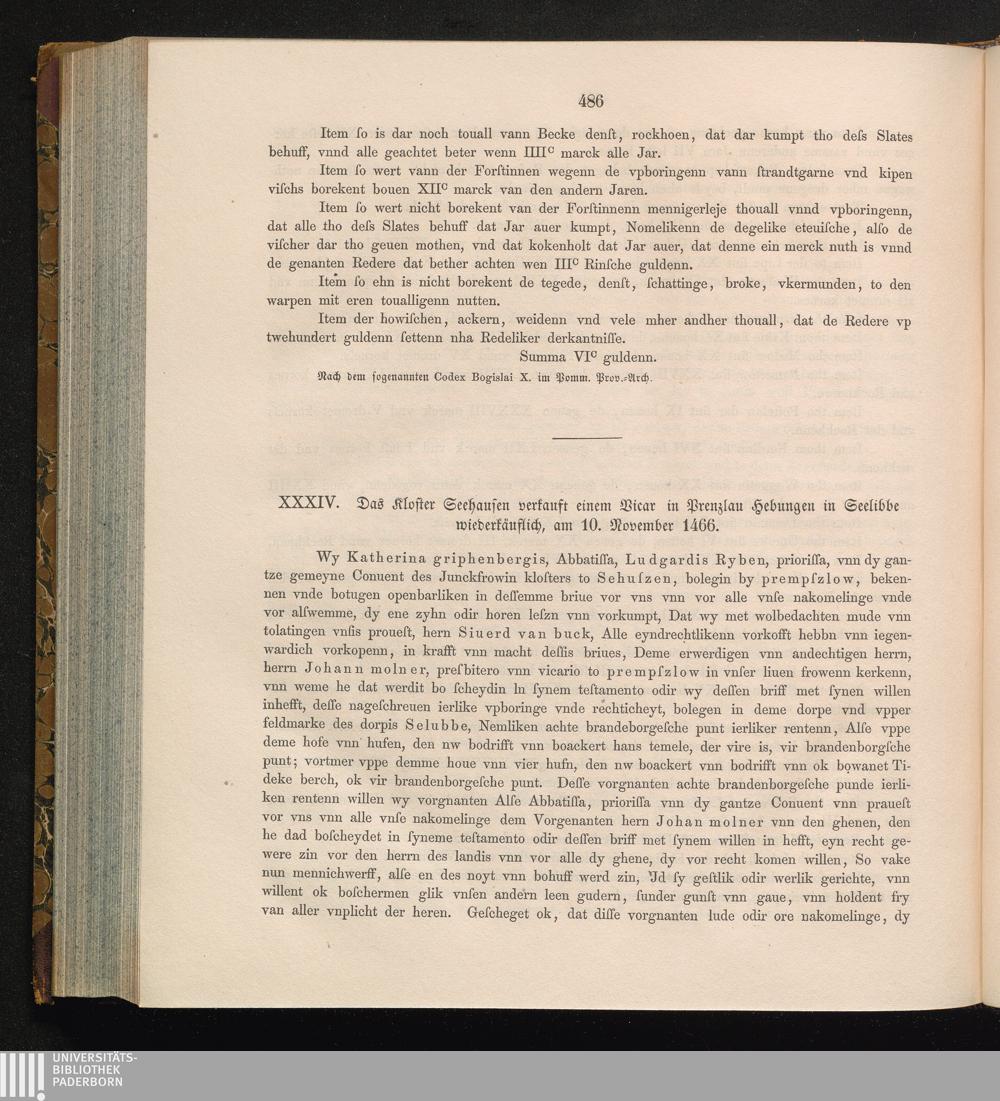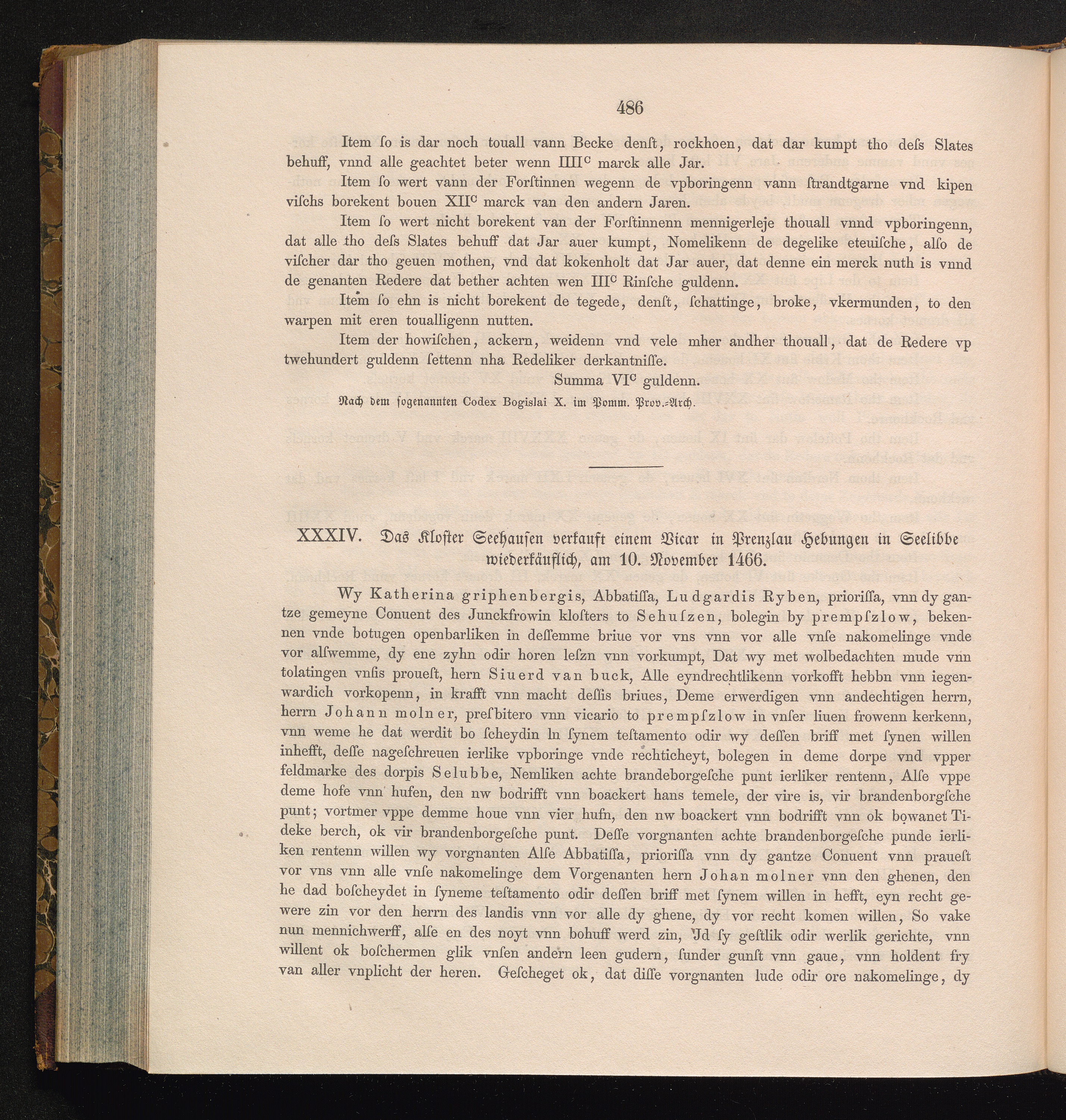 XXXIV. Das Kloster Seehausen verkauft einem Vicar in Prenzlau Hebungen in Seelibbe[...]