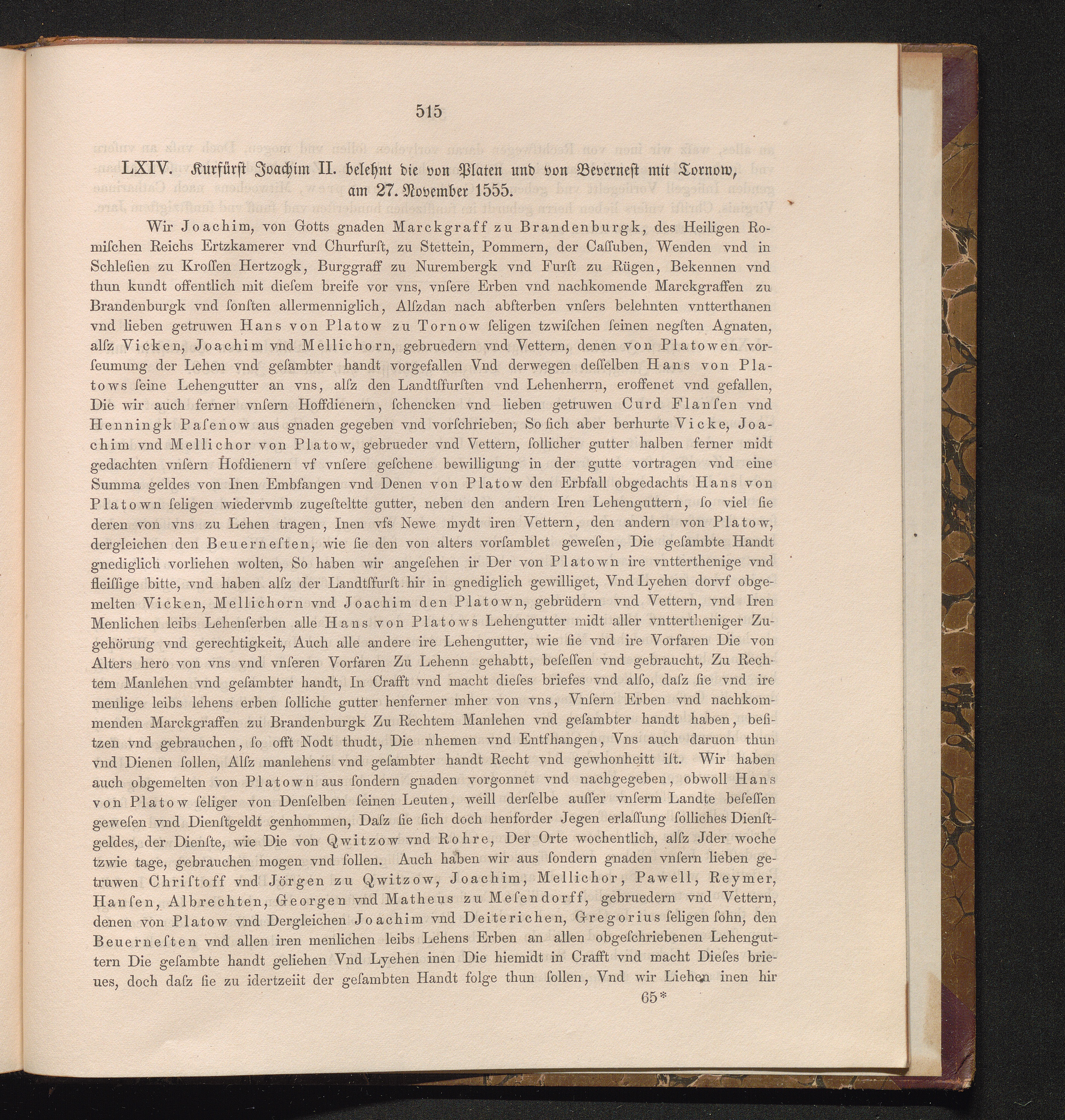 LXIV. Kurfürst Joachim II. belehnt die von Platen und von Bevernest mit Tornow, am[...]