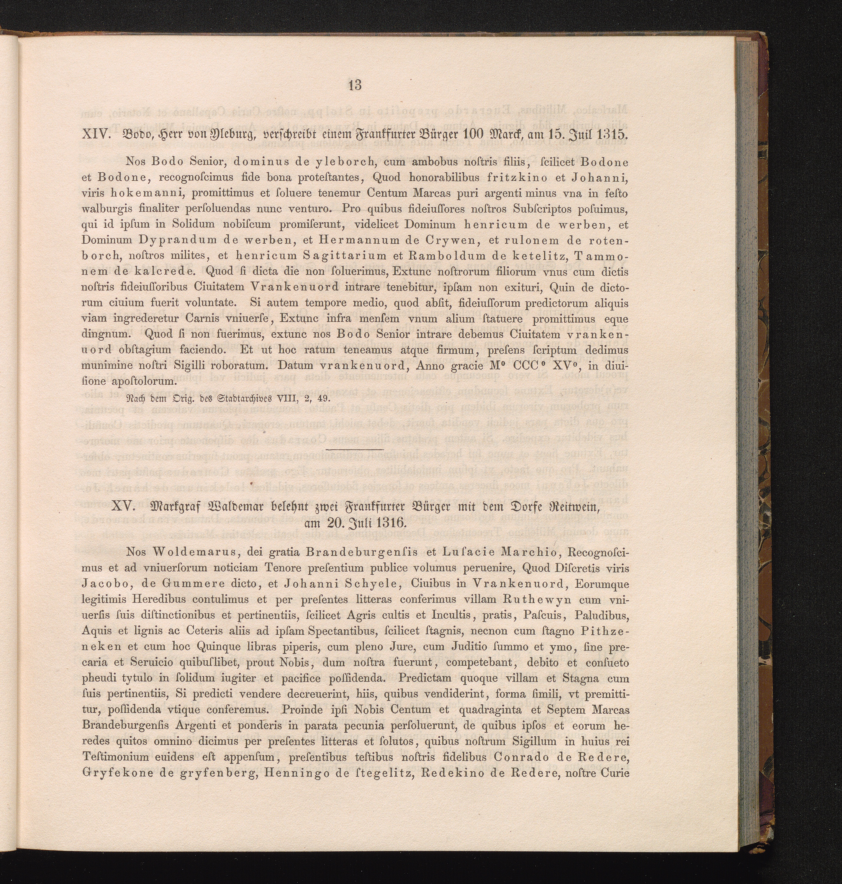 XV. Markgraf Waldemar belehnt zwei Frankfurter Bürger mit dem Dorfe Reitwein, am[...]